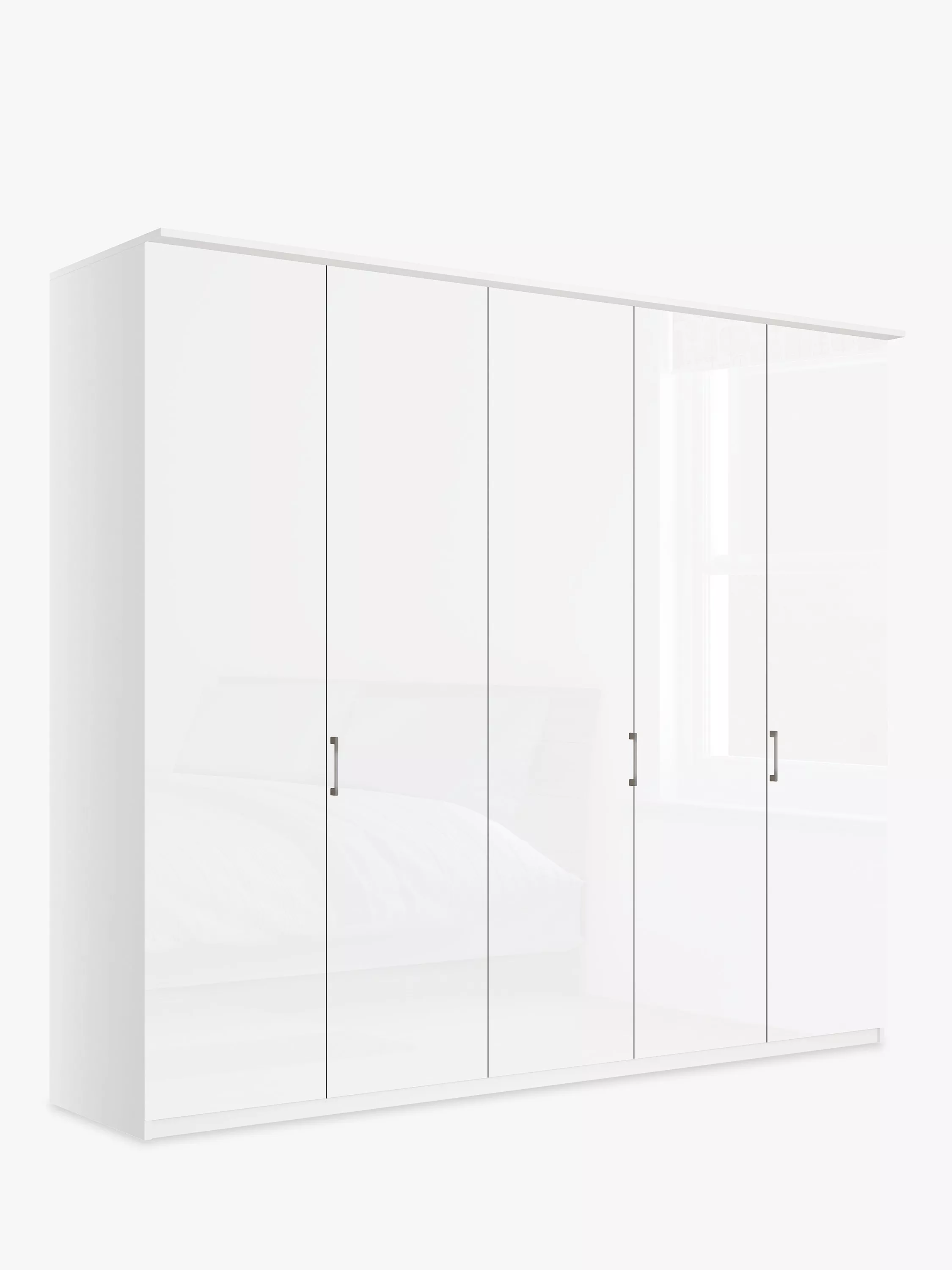 The five attractive coloured glass hinged doors, featuring three silver-tone handles, lead to two double and one single compartments. Each compartment is completed with two shelves and a hanging rail, all of which are fully adjustable for your convenience.