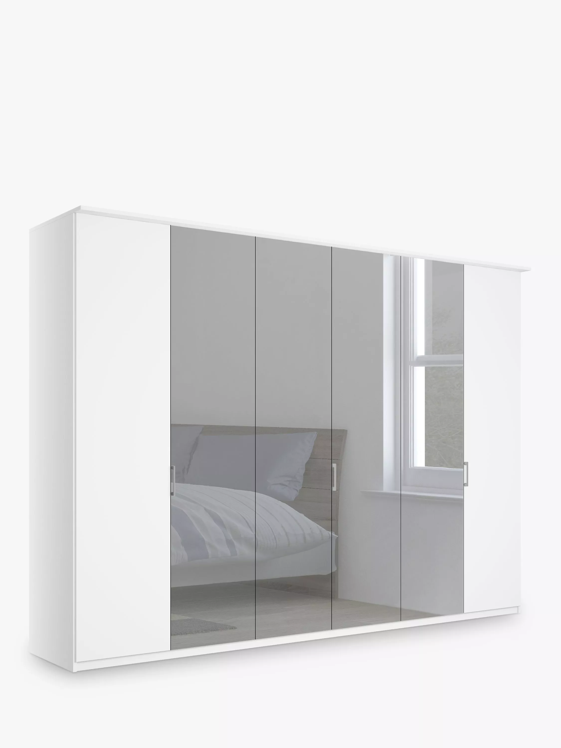 The clean modern lines of this six door Elstra wardrobe are offset with a choice of Oak, Pebble Grey or Off White finishes, each helping to bring warmth and tactility to the design. The exterior is then complemented with an attractive cornice detail.