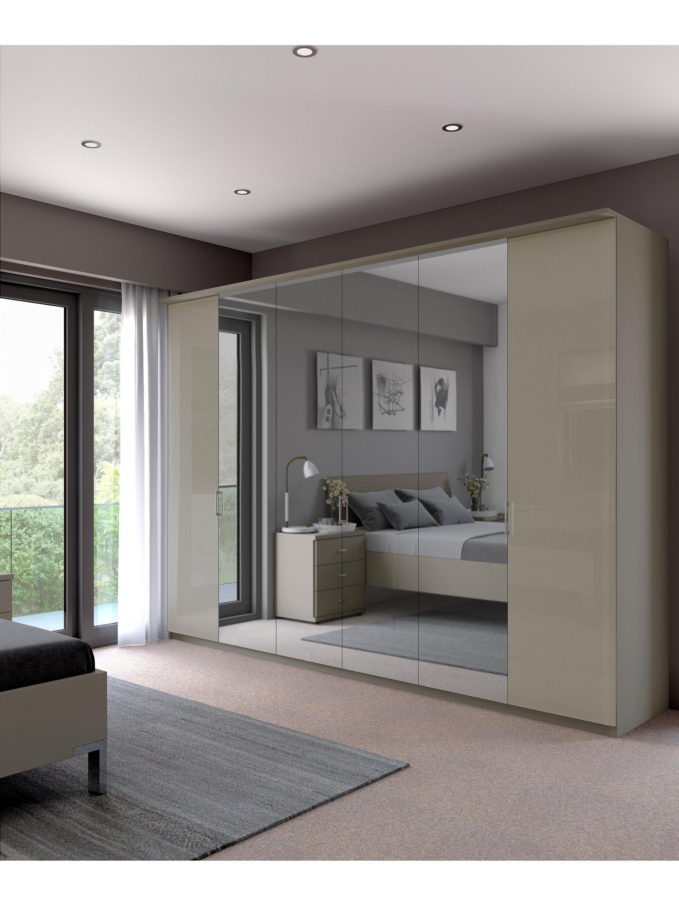 The six attractive coloured glass and mirrored hinged doors, featuring three silver-tone handles, lead to three double compartments. Each compartment is completed with two shelves and a hanging rail, all of which are fully adjustable.