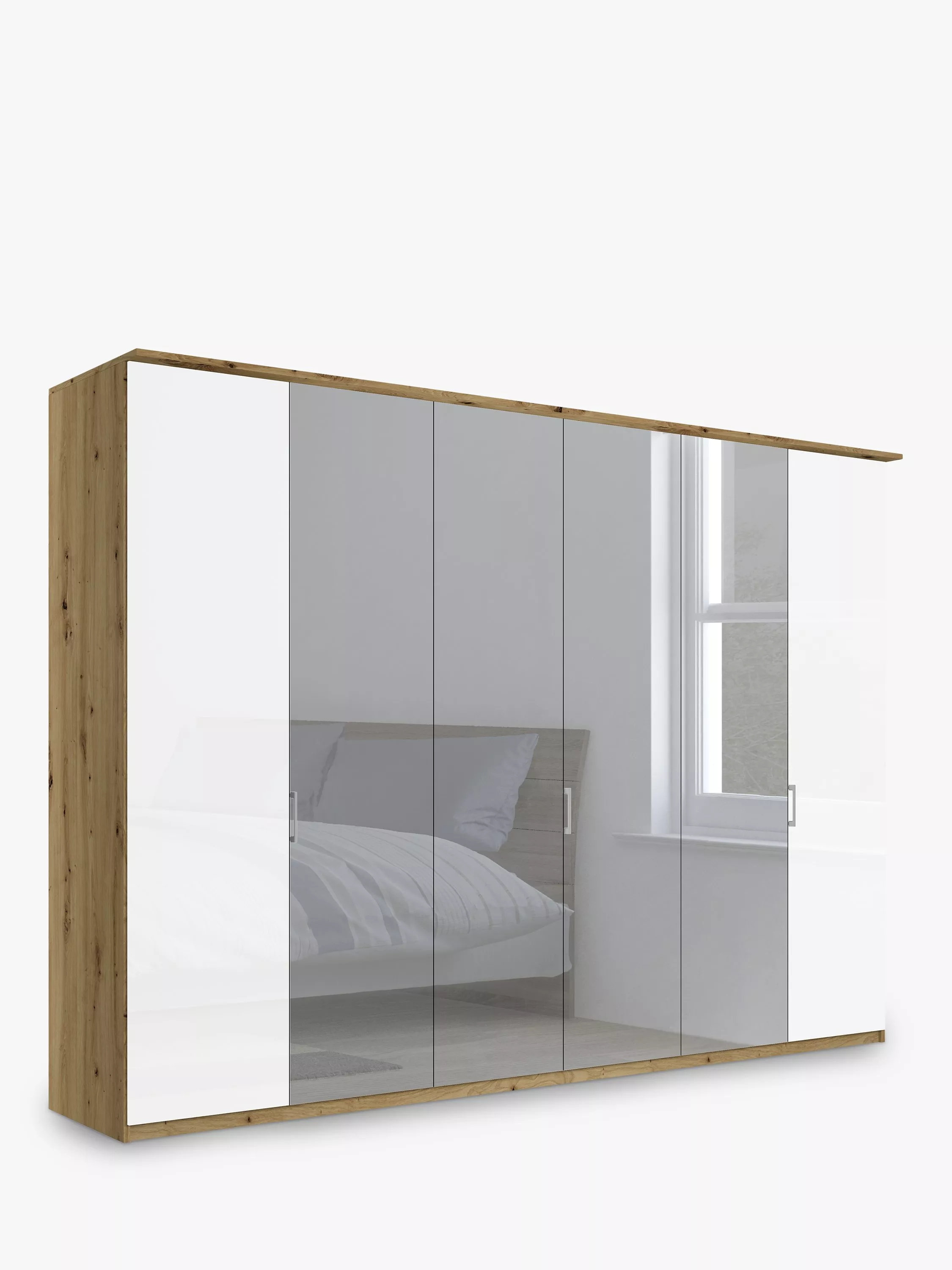 John LewisElstra 300cm Wardrobe with Glass and Mirrored Hinged Doors, White Glass/Bianco Oak