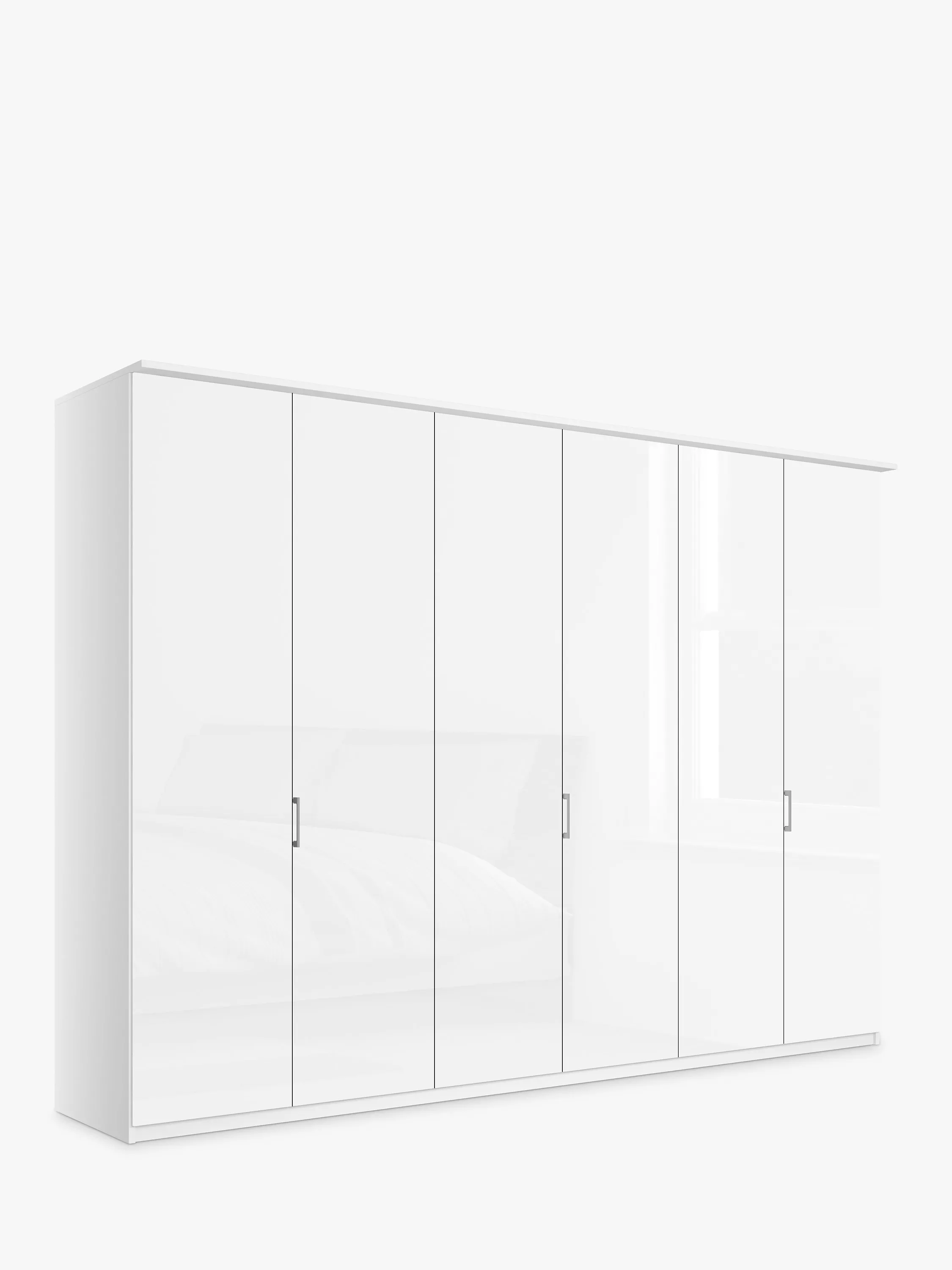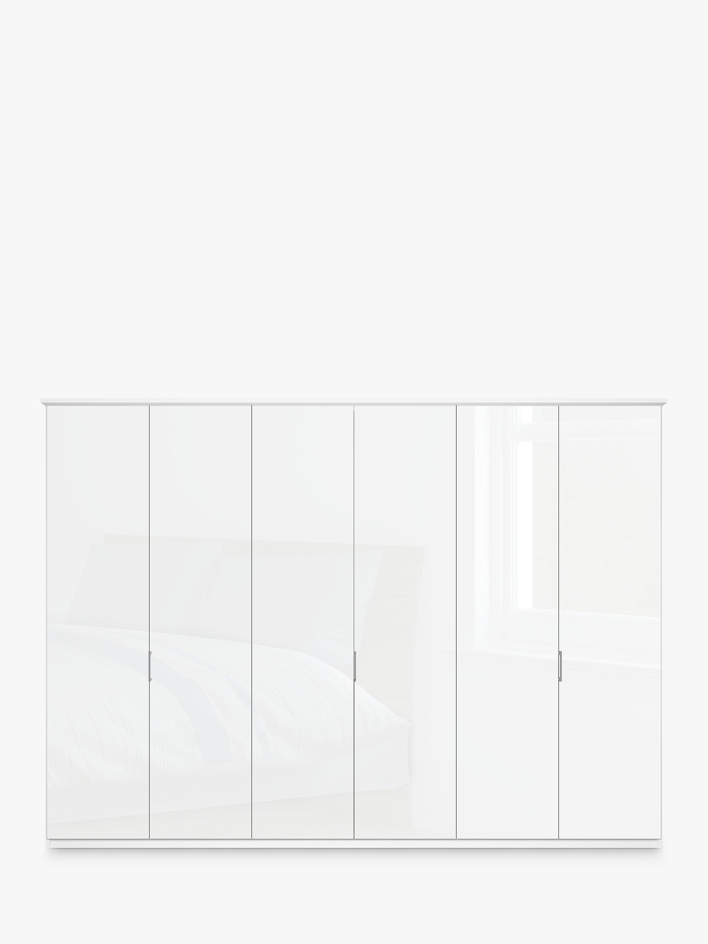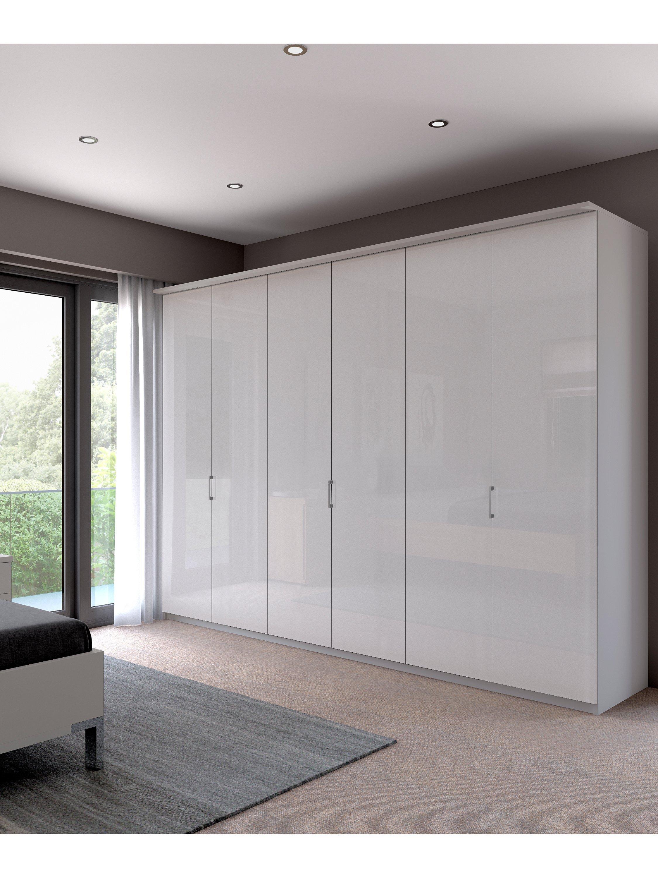 The six attractive coloured glass hinged doors, featuring three silver-tone handles, lead to three double compartments. Each compartment is completed with two shelves and a hanging rail, all of which are fully adjustable.