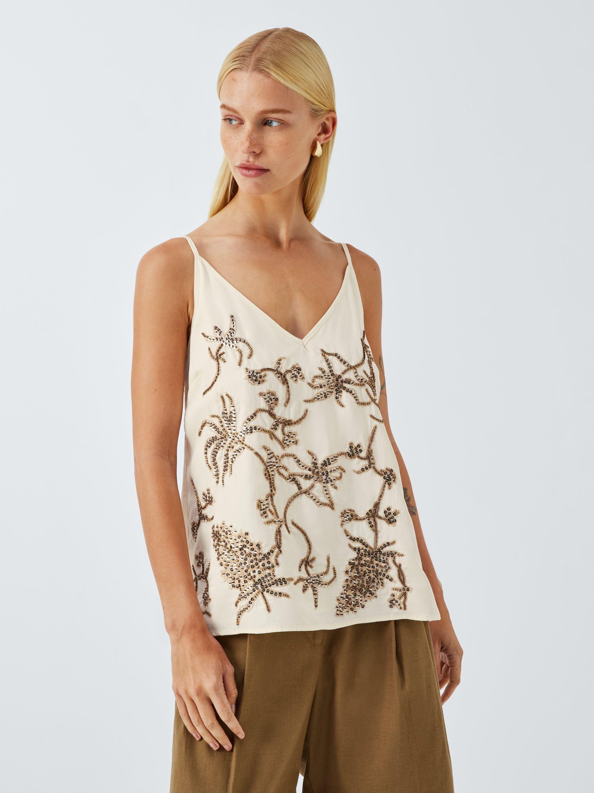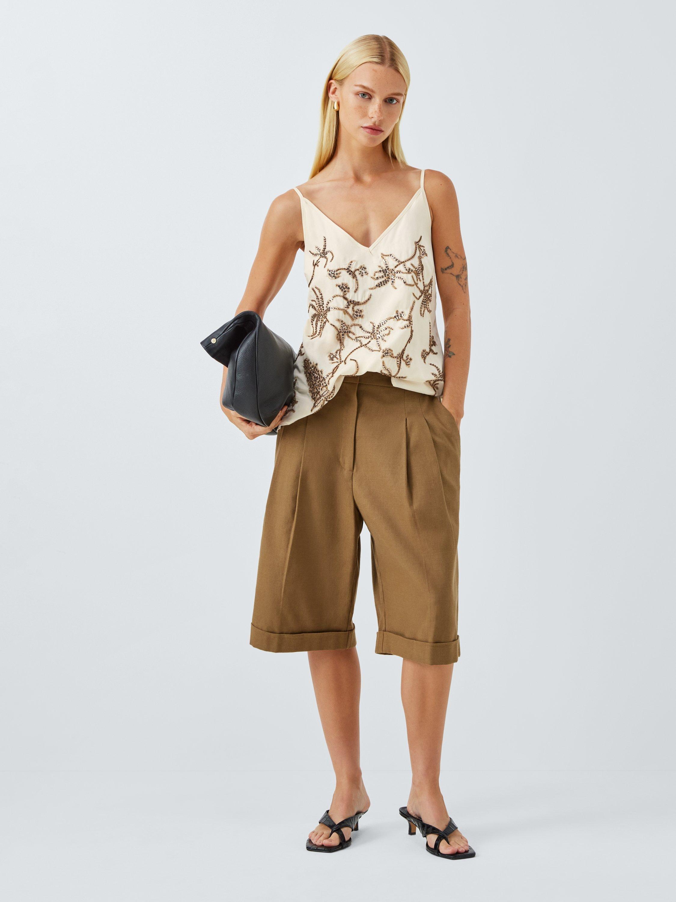 Short-sleeved cami top embellished with floral-inspired details. Made of a lightweight fabric that includes linen for warm-weather comfort.