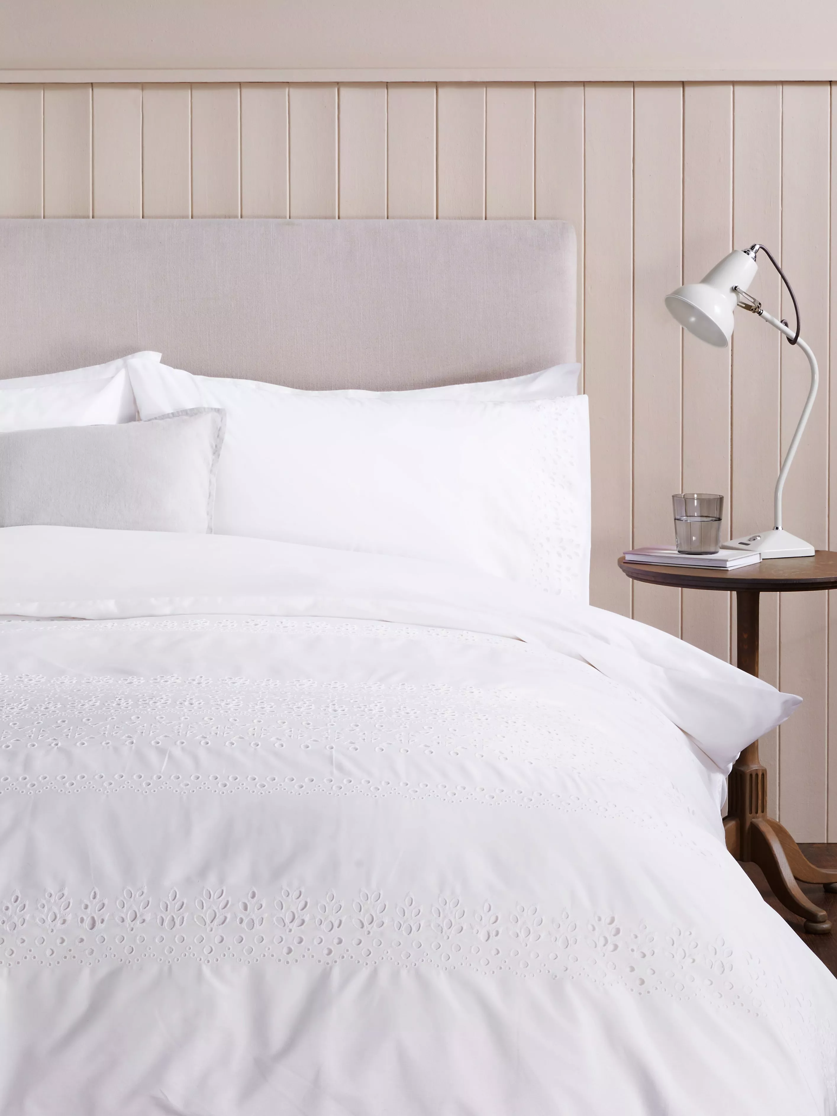 Cool, crisp white cotton bedding with beautiful embroidery. Ideal for summer nights.