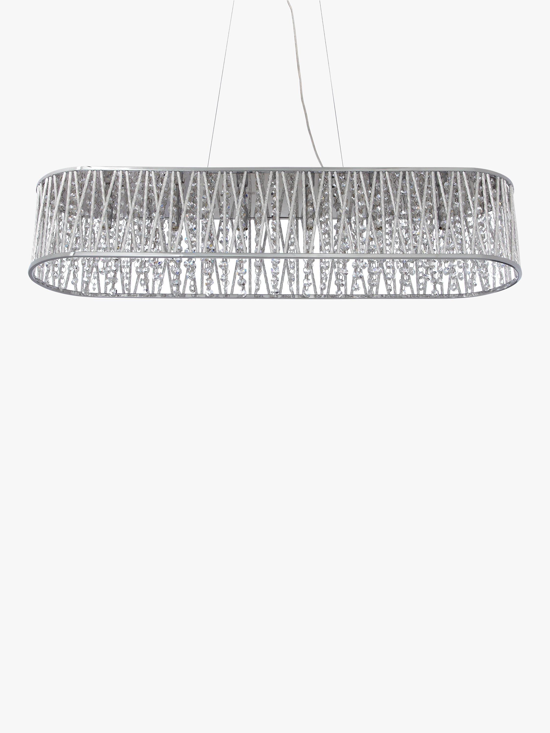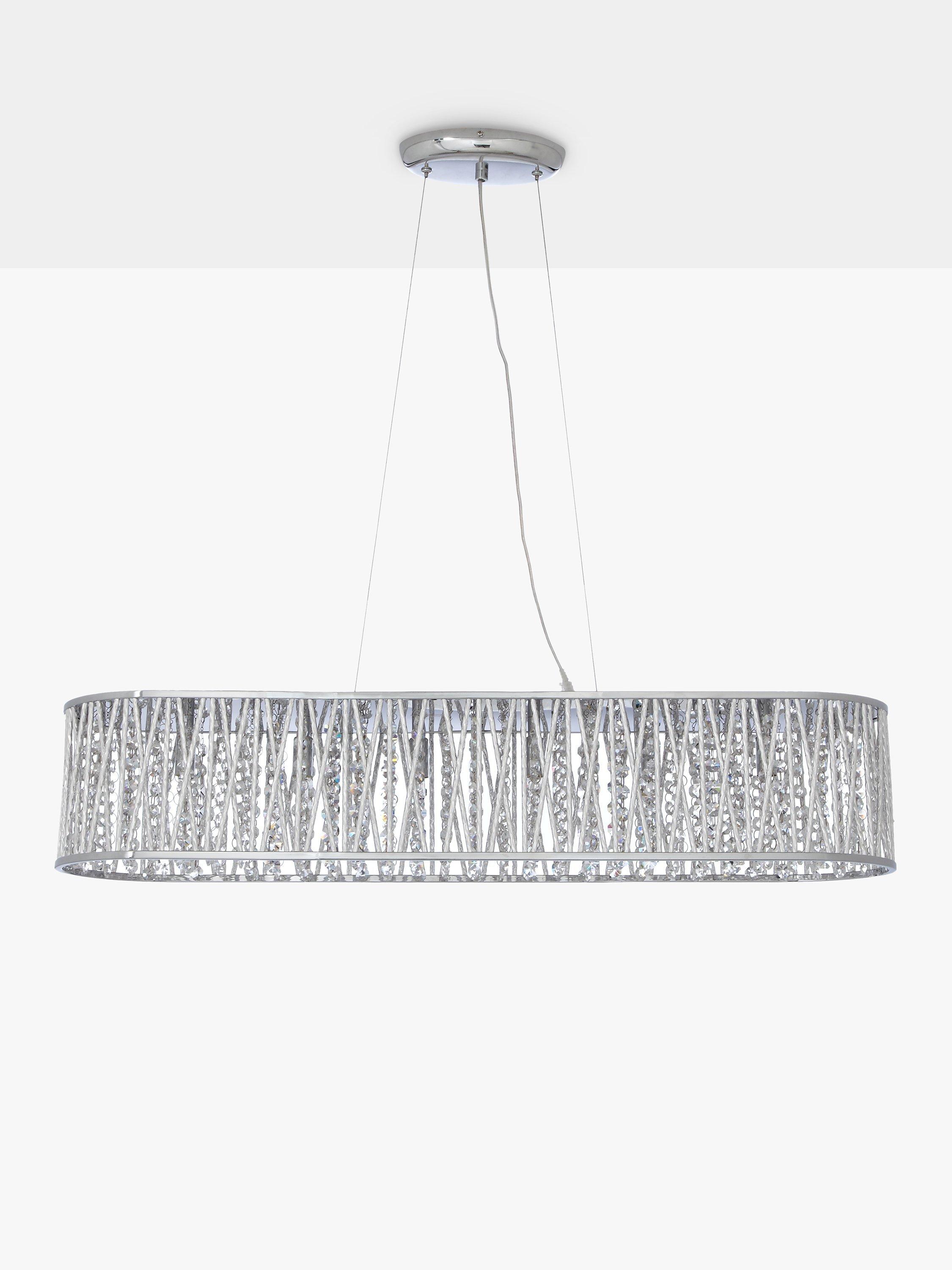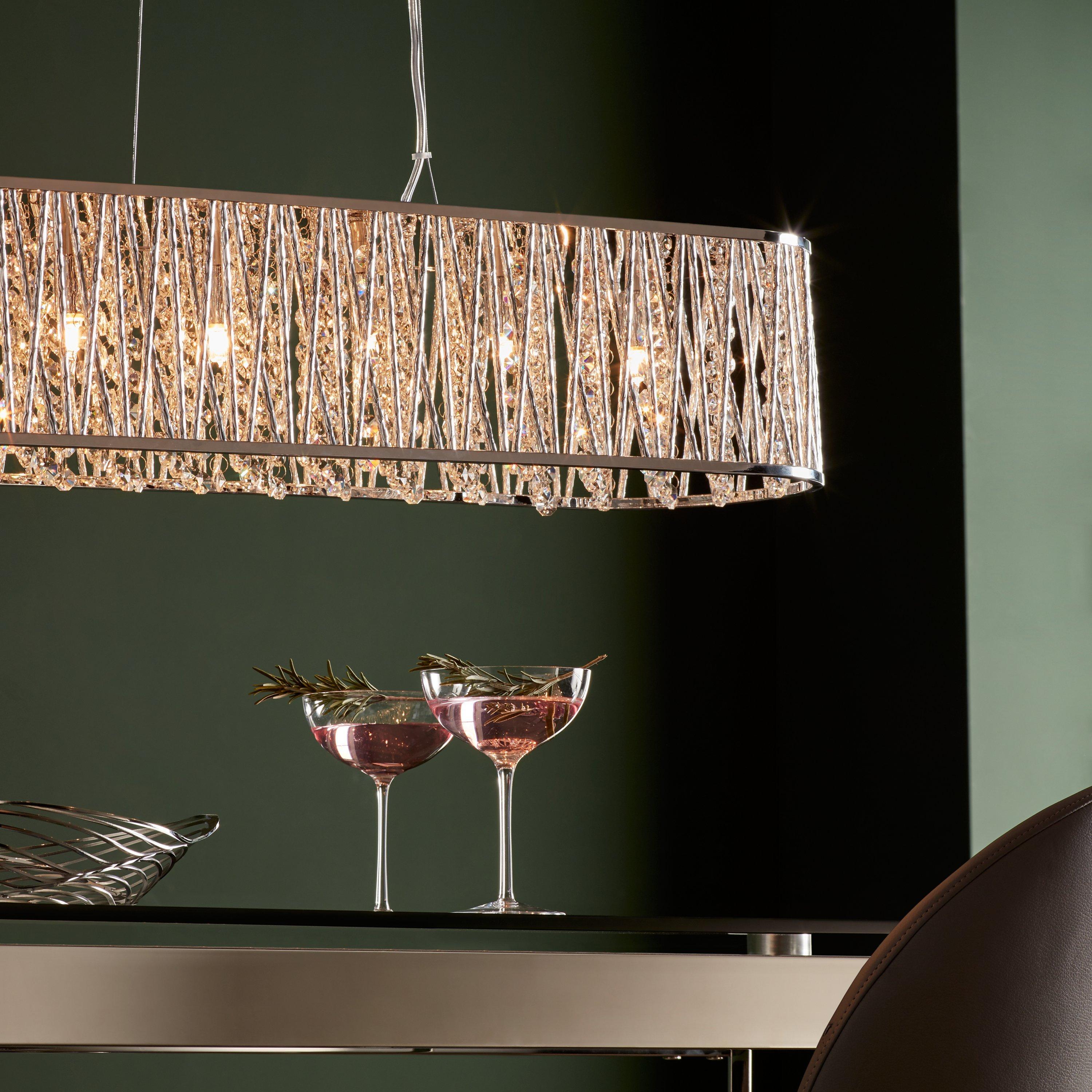 Hang this long light above a dining table for the ultimate in chic luxury. The beautiful bar pendant is lavished in lines of gorgeous beads with a high shine metal mesh running around the outside. It looks stunning when lit, with the light shining through the glass and casting a gorgeous display against its surroundings.