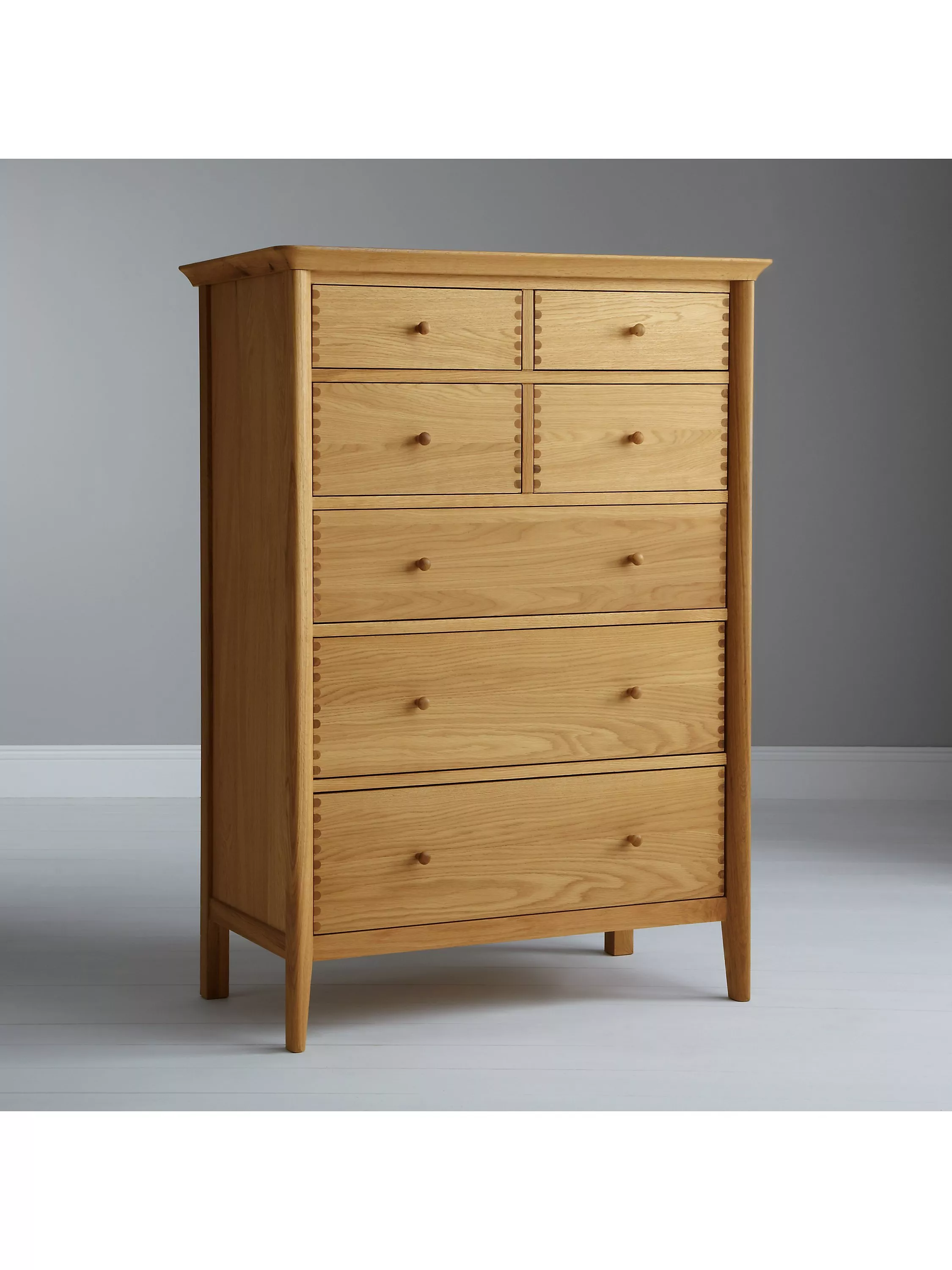 This spacious chest of drawers is made from a combination of solid European oak and high-quality oak veneers for an appealingly natural look. It features seven spacious drawers so there's plenty of storage space and we've built it with dovetail joints for a reassuringly robust finish. Rounded edges and a smooth, natural finish imparts a softer styling touch.