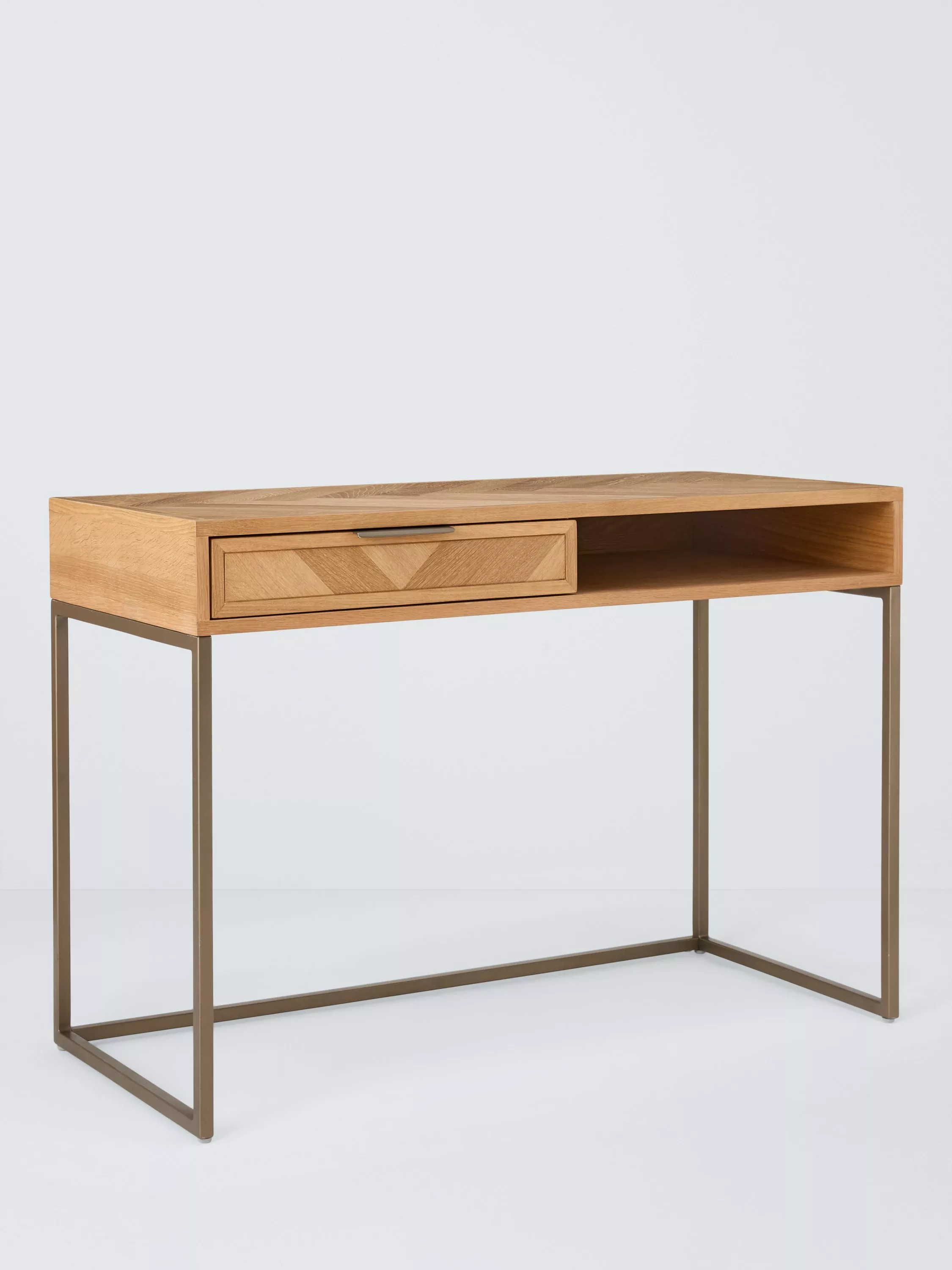 This versatile piece can be used as a desk or a side table and has a drawer and cubby space to help keep the surface neat and tidy. The wooden top is supported by a clean-lined metal frame in an antique brass finish. Thanks to the minimalist, open frame, this desk will ensure your room still feels spacious and uncluttered.