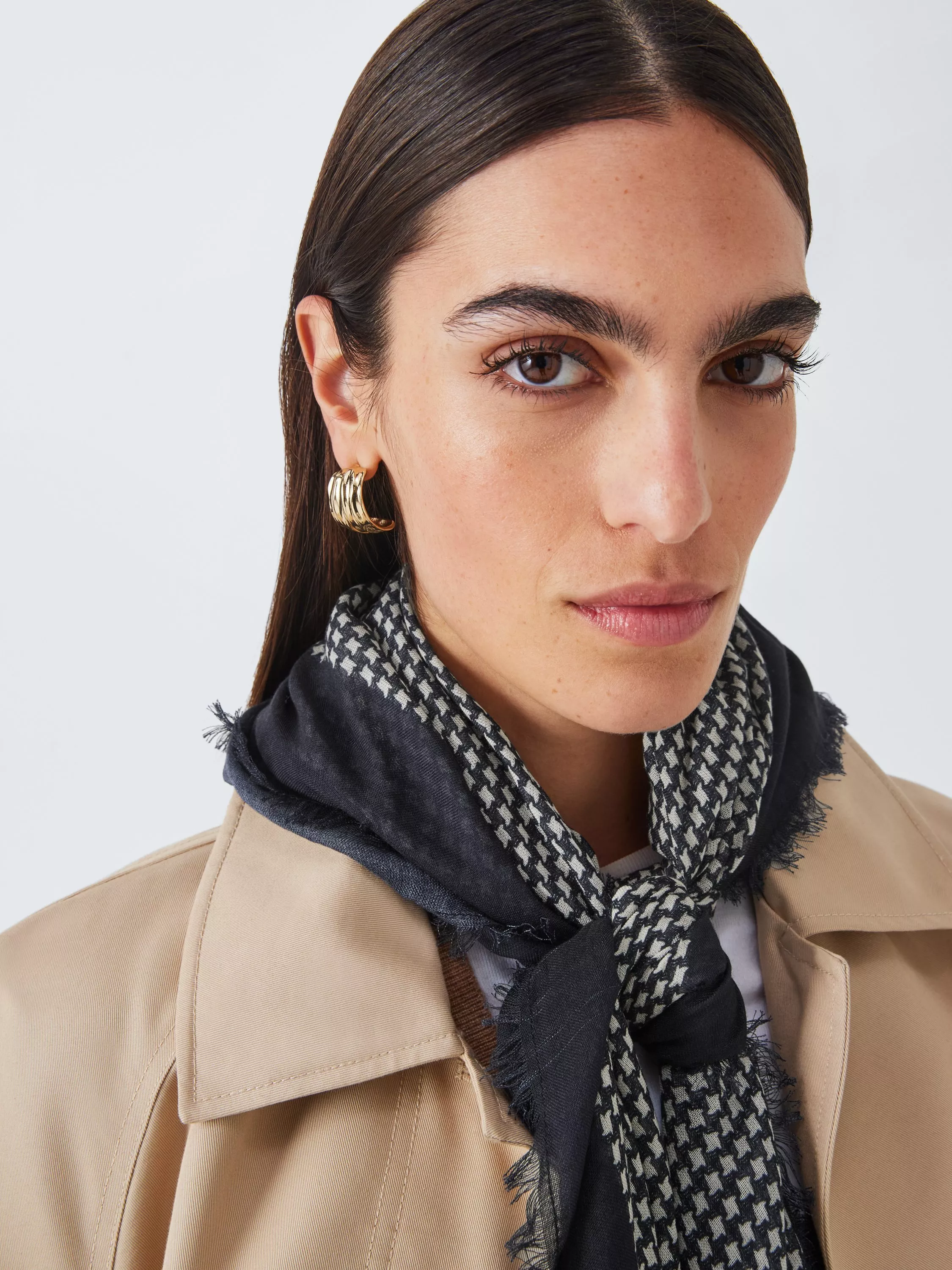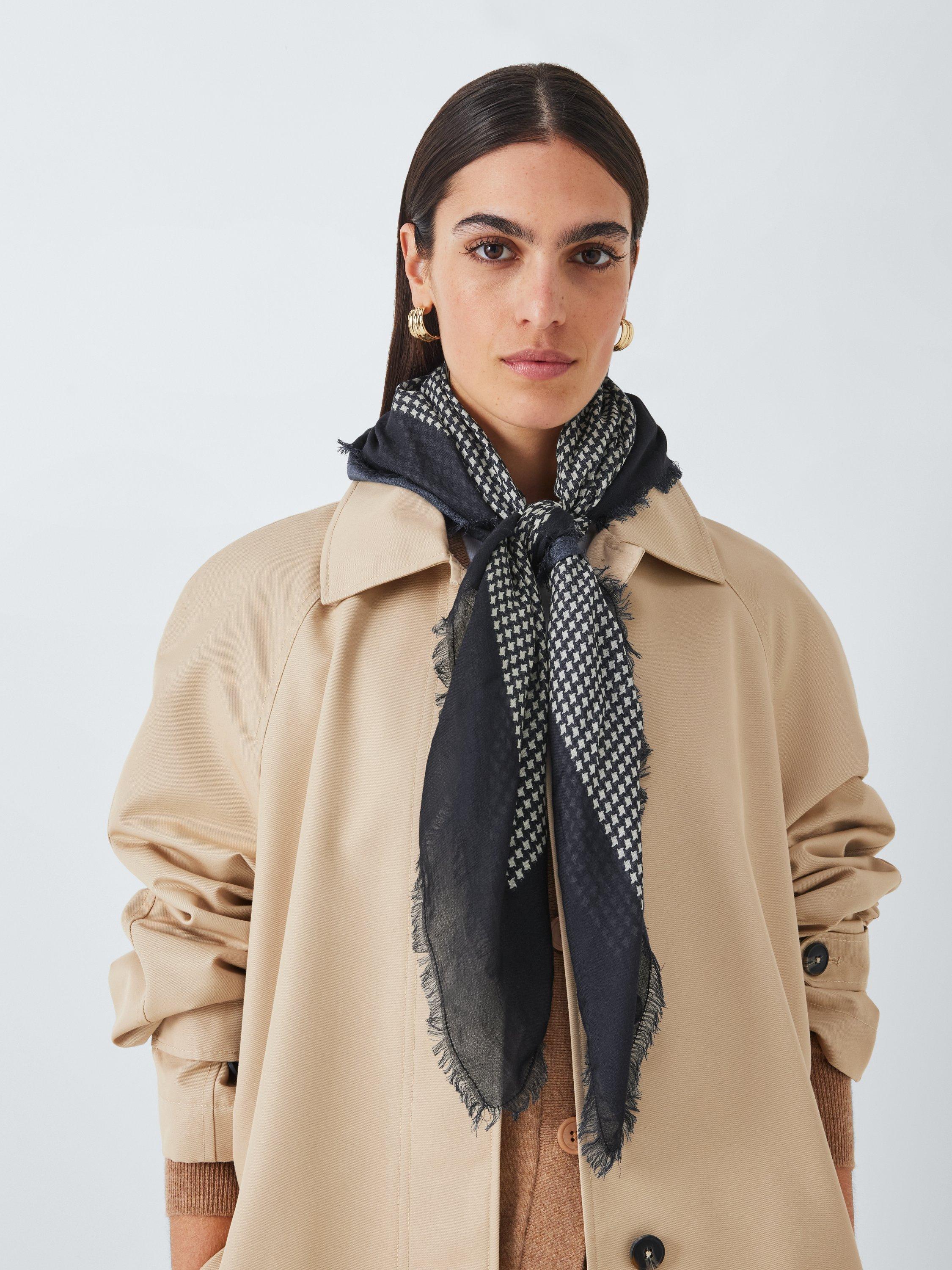 The finishing touch to an outfit. This square scarf has a subtle geometric print, bold border and a soft fringe for a touch of texture.