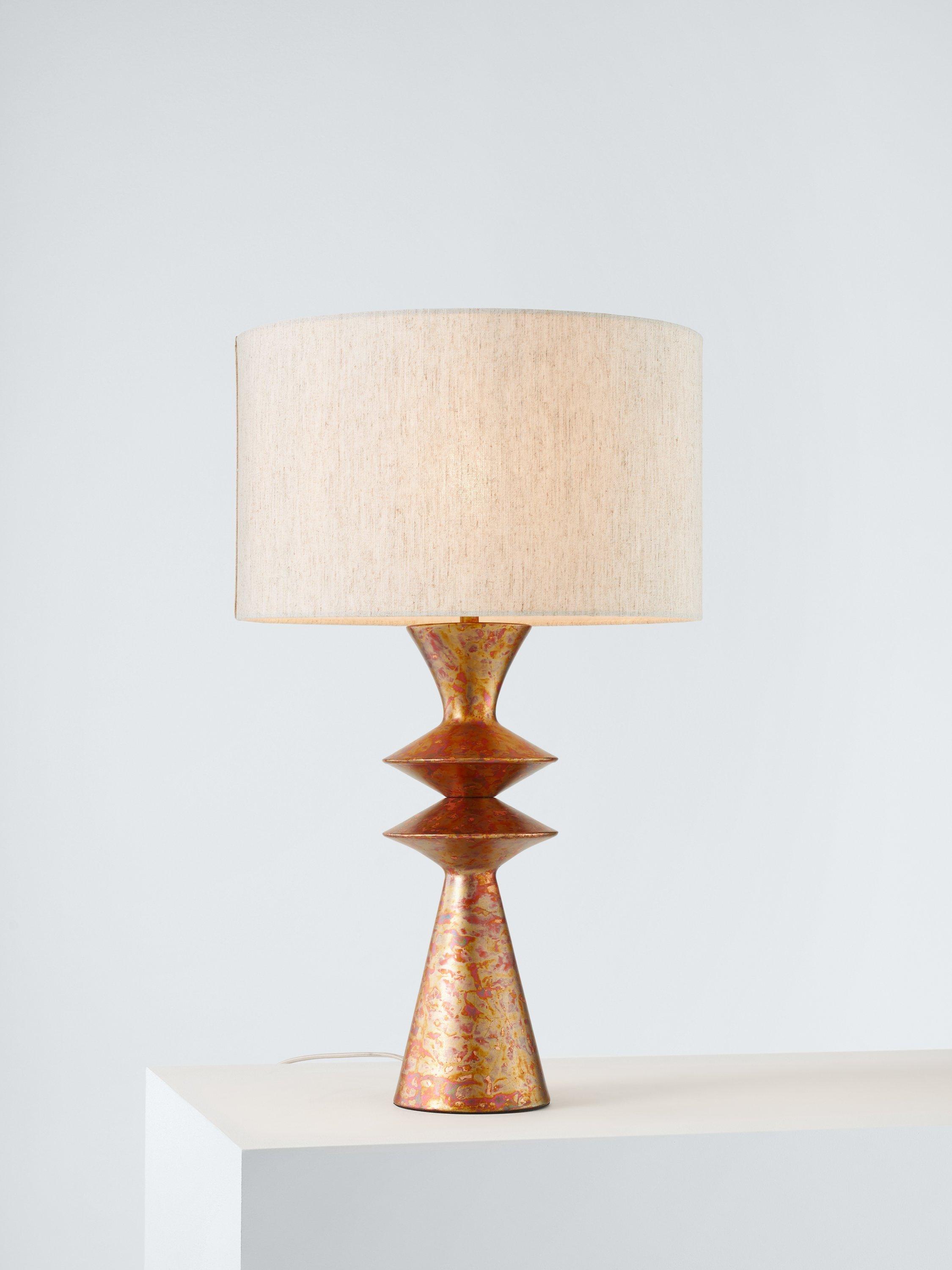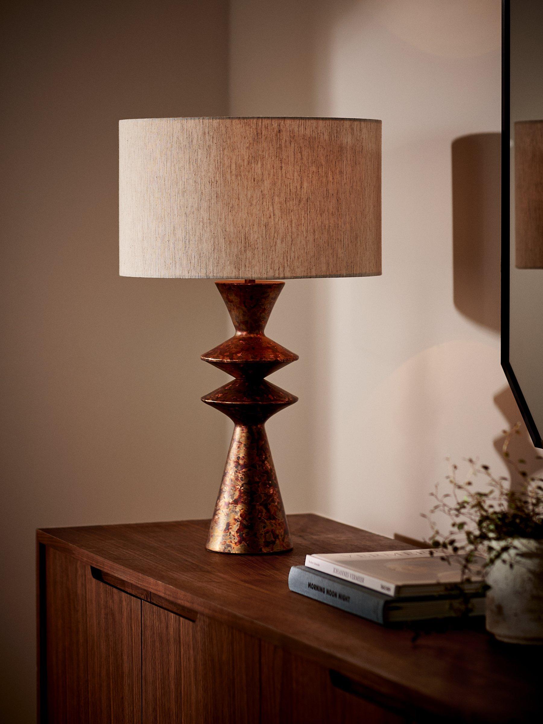Elevate your home lighting with the stunning Ethan table lamp. Crafted from iron into a striking, multi-layered silhouette, this eye-catching piece will create a real talking point in any home. Finished with a unique incandescent petrol copper effect that is truly highlighted when switched on, it is combined with natural linen shade and grey fabric flex.