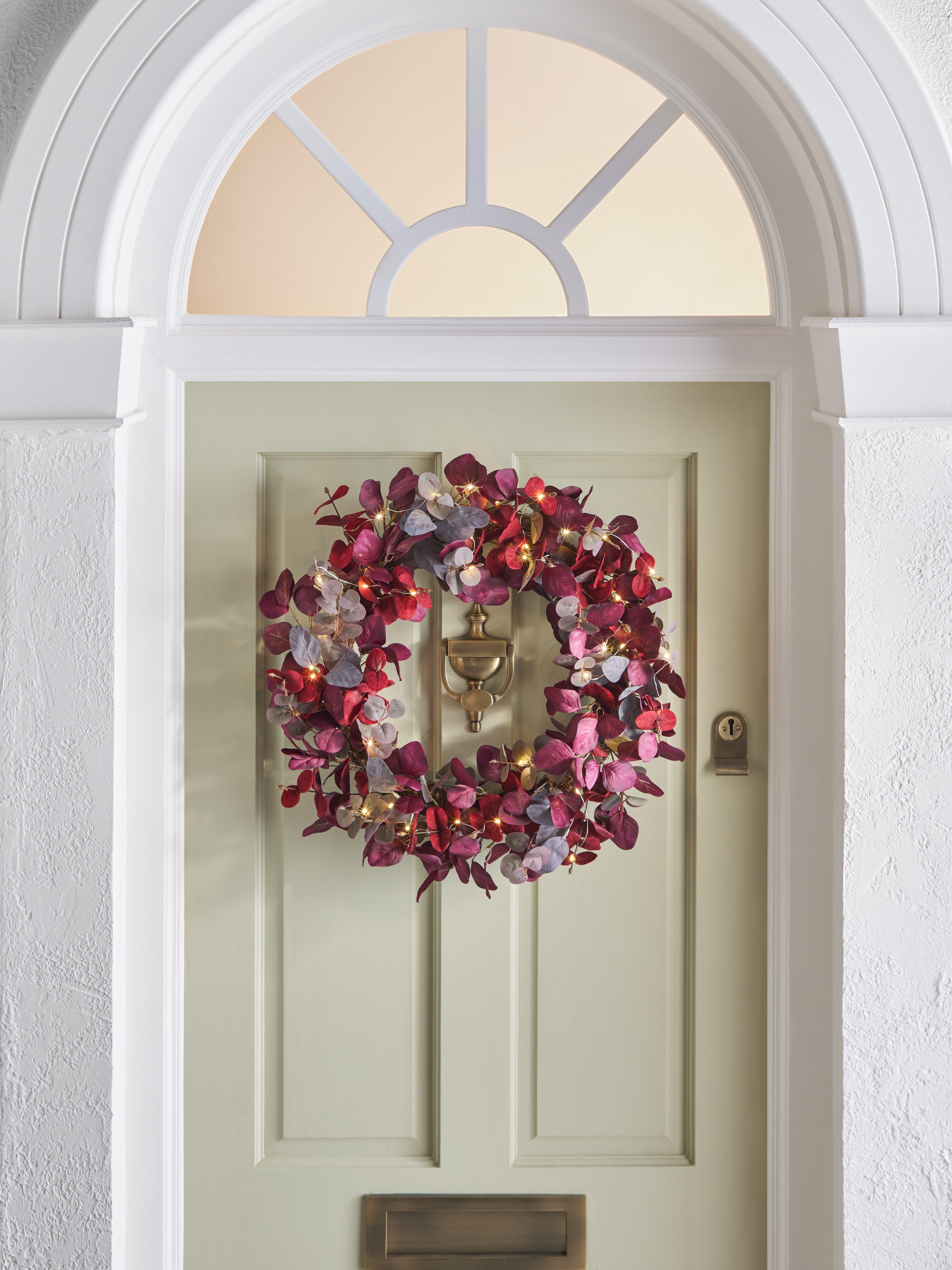 Featuring realistic eucalyptus foliage and warm white LED lights, this wreath offers a serene, modern twist on festive décor. Perfect for doors, walls, or above the mantel, this wreath adds a gentle glow and fresh greenery for a calm, contemporary feel.