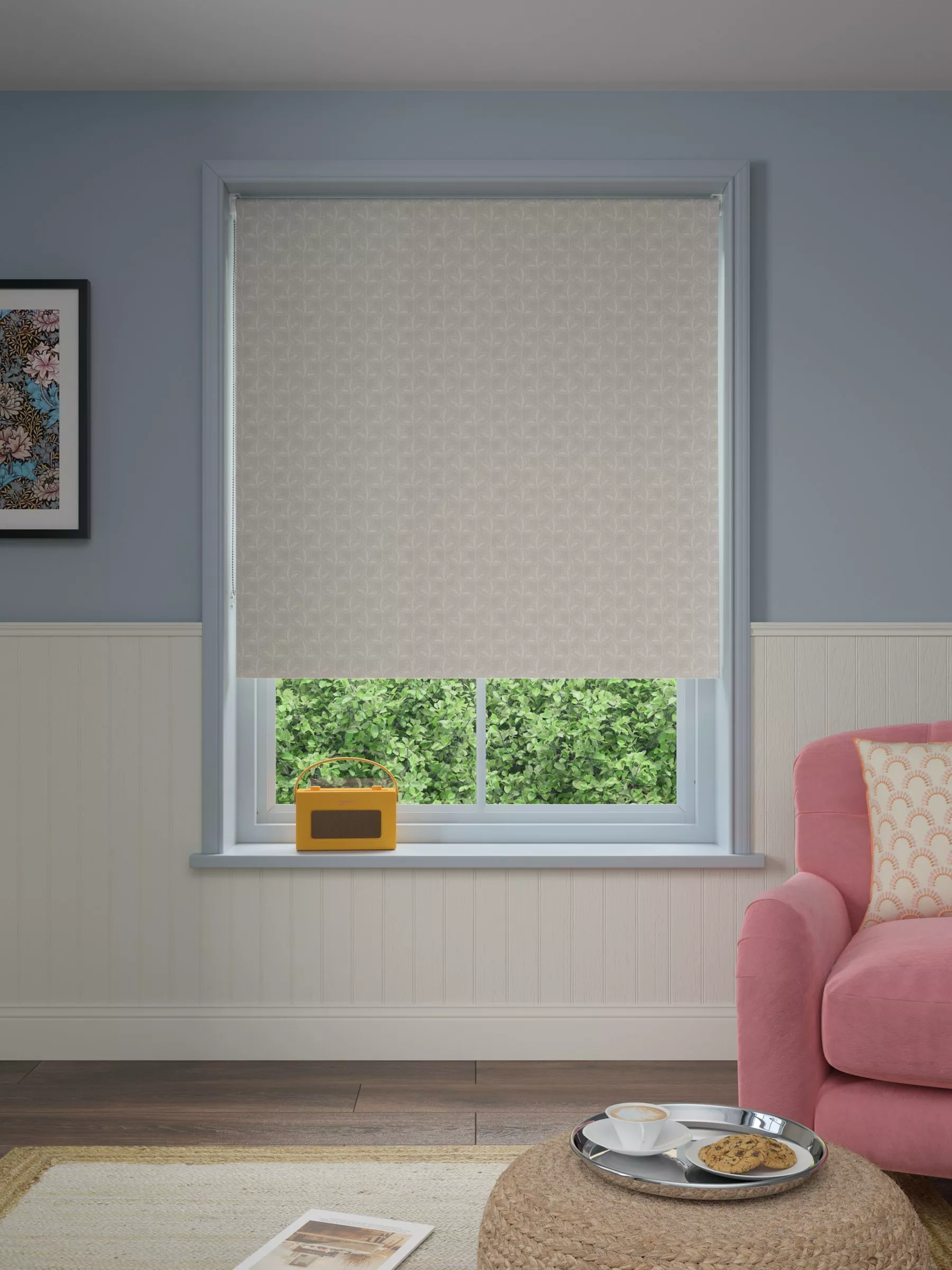 Our Exley Leaf print is a simple repeated motif of leaves in a hand-drawn style. We've used it on this blackout blind which eliminates light and gives complete privacy. You can get a sound night’s sleep and not be disturbed by the early rising sun in the summer months.