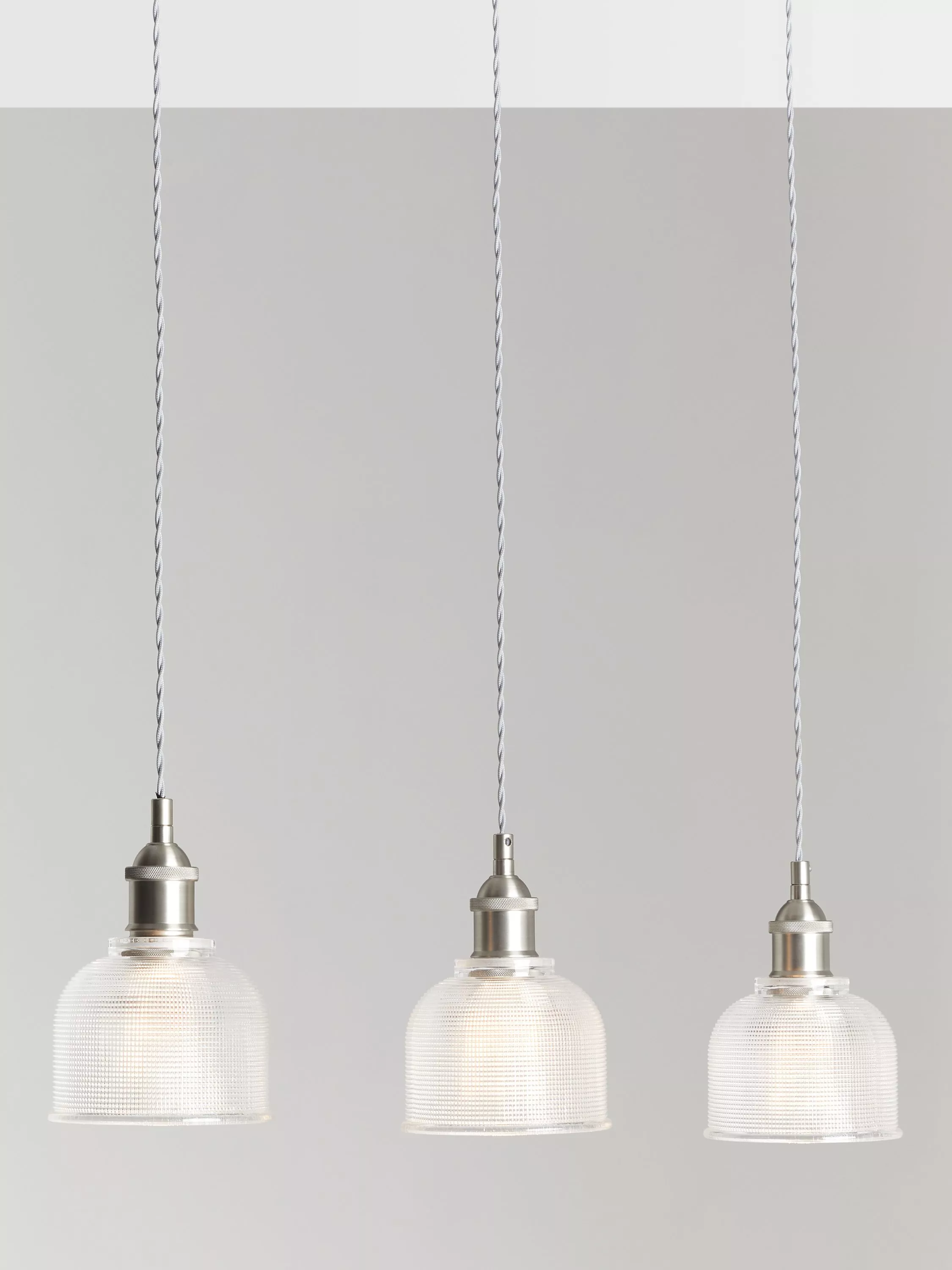 Ideal for fitting above kitchen islands or dining tables, this ceiling bar incorporates three of our Ezra pendants. Each pendant is suspended from an adjustable fabric flex that allows you to fit it perfectly into your space, and the dome-shaped, prismatic glass shades have a clean and contemporary feel. Offering a warm and ambient wash of light, accents of matt-finished metal enhance its timeless design.