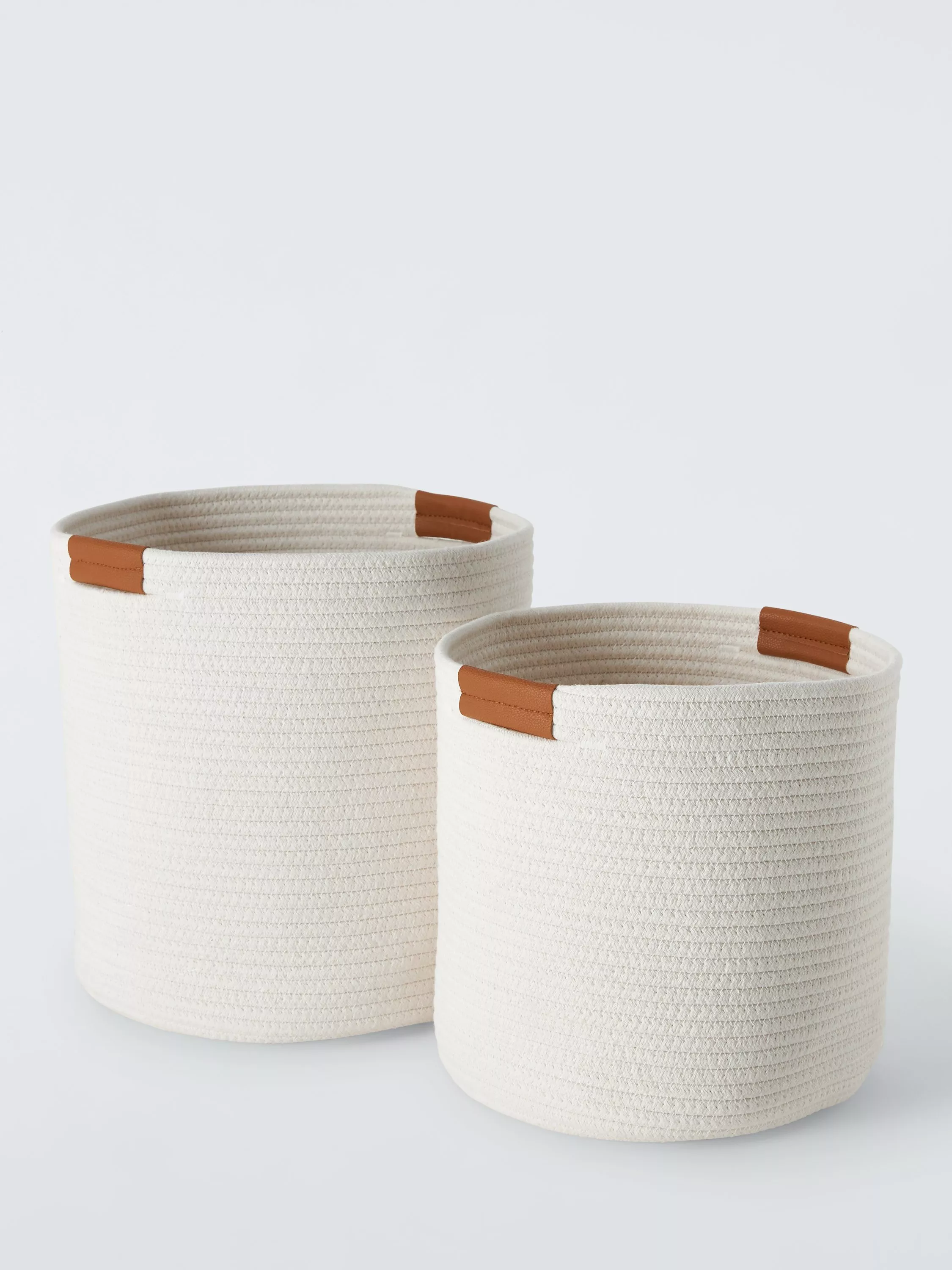 A set of two mixed-size fabric baskets that you can use for storage or laundry. Practically sized and woven in a smart, round shape, they have integrated handles so you can easily move them from room to room.