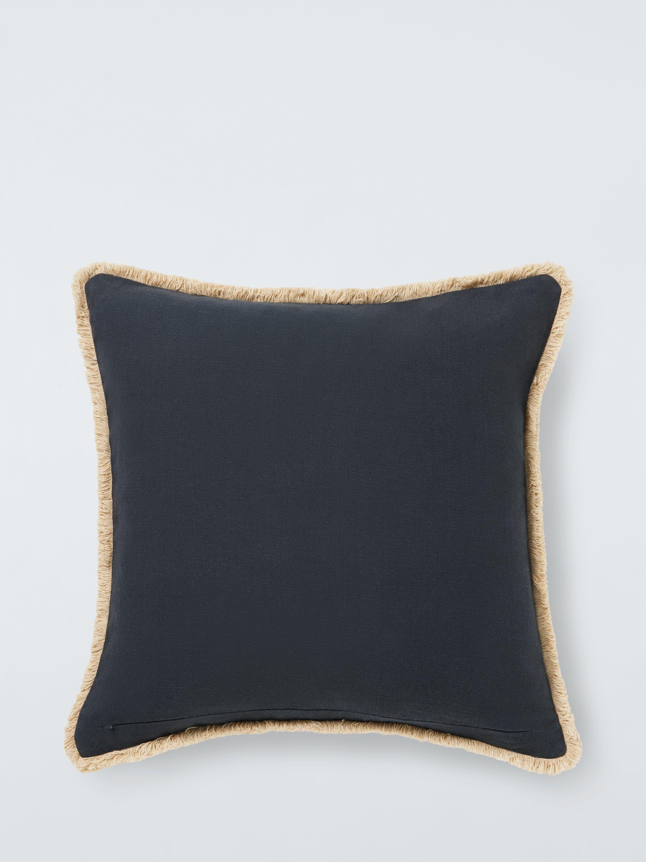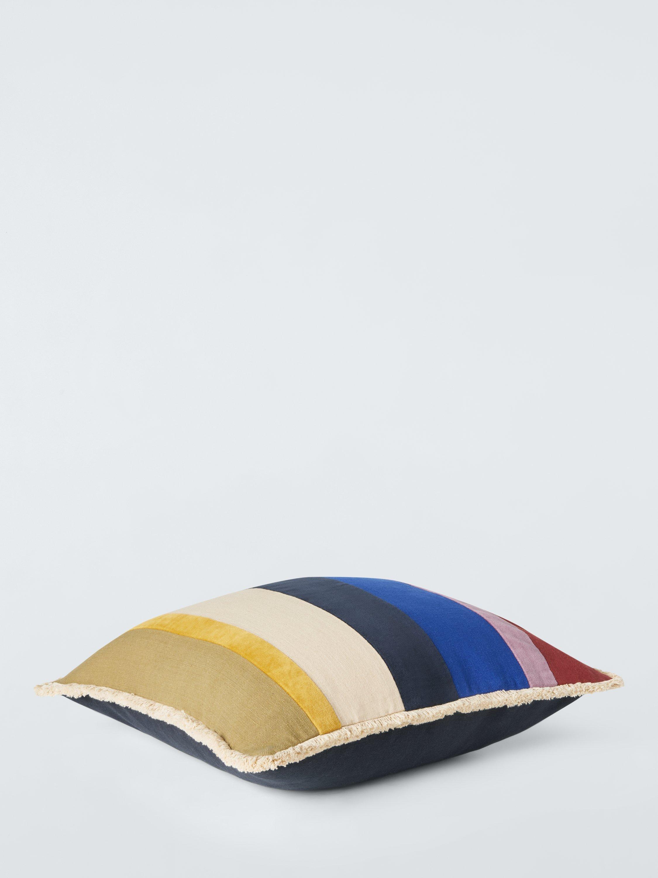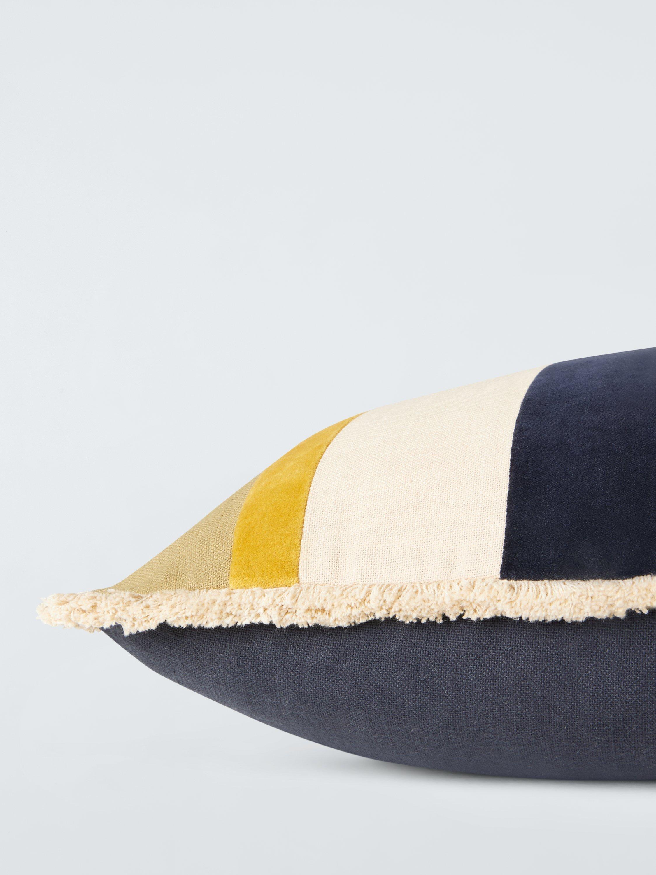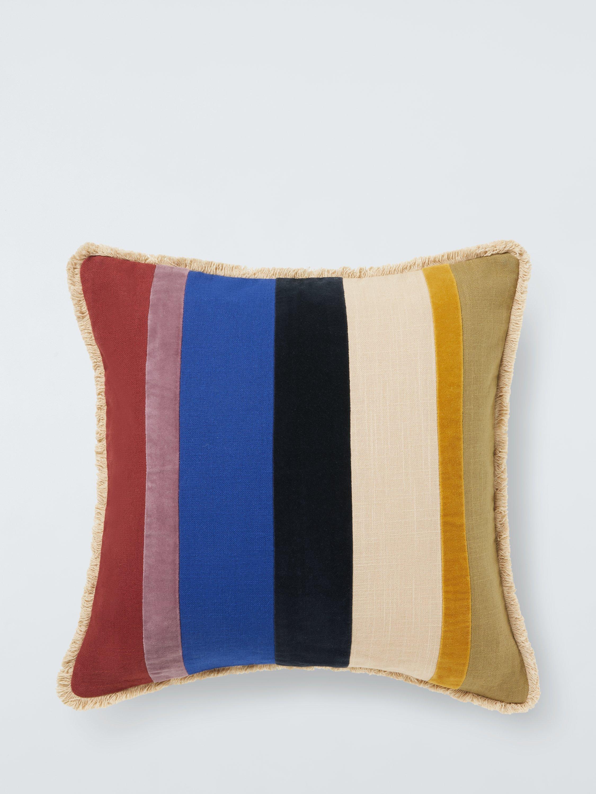 Combining velvet and woven stripes, this colourful cushion makes a bold statement while adding tactile texture.