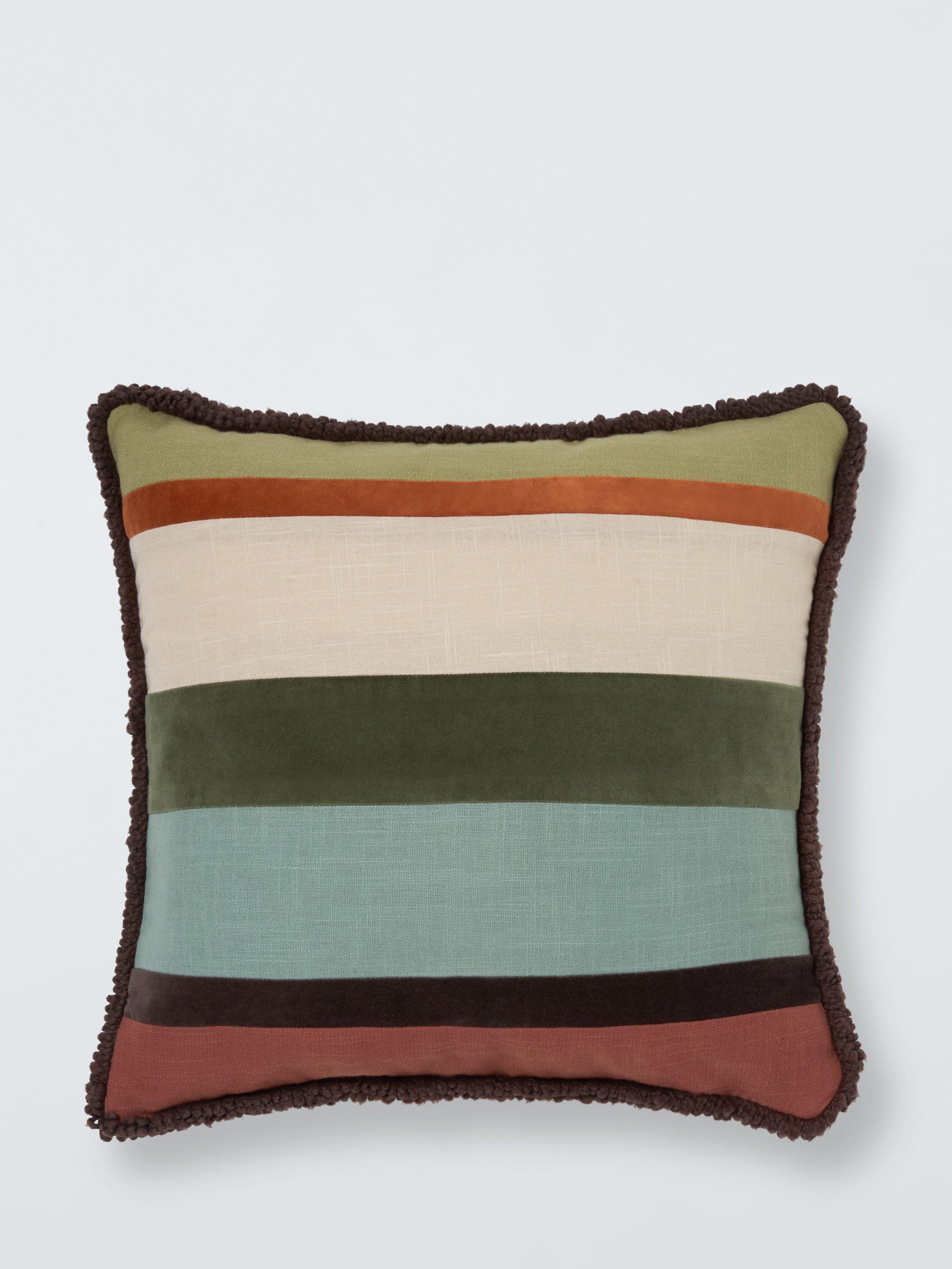 Woven stripes, a natural reverse and a soft, bobbly fringe give this colourful cushion a distinctly retro look.