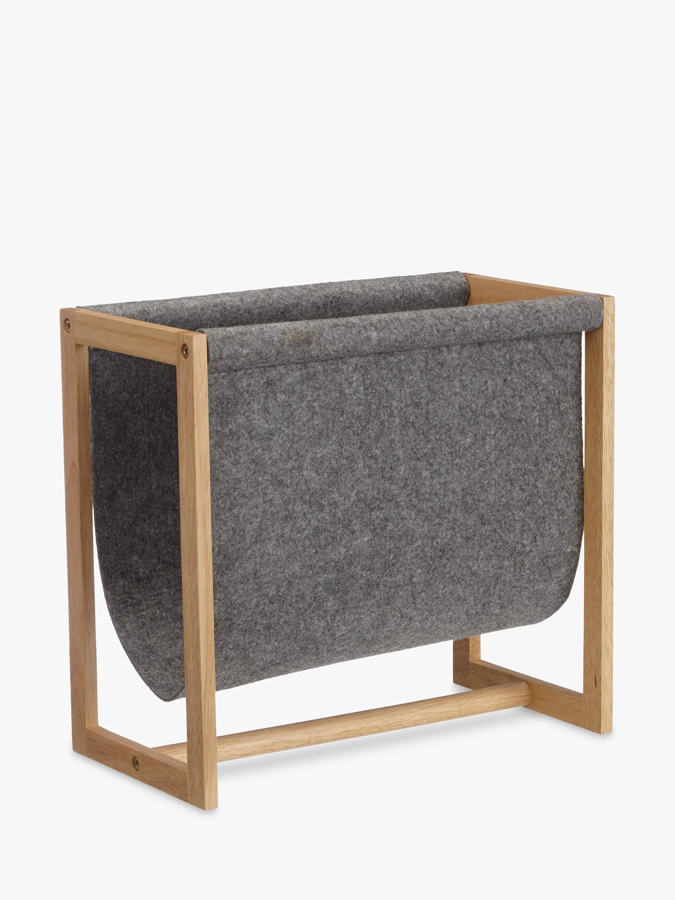 A grey felt sling, hung from a stained wood frame, makes for smart and attractive storage solution for all your magazines and newspapers.