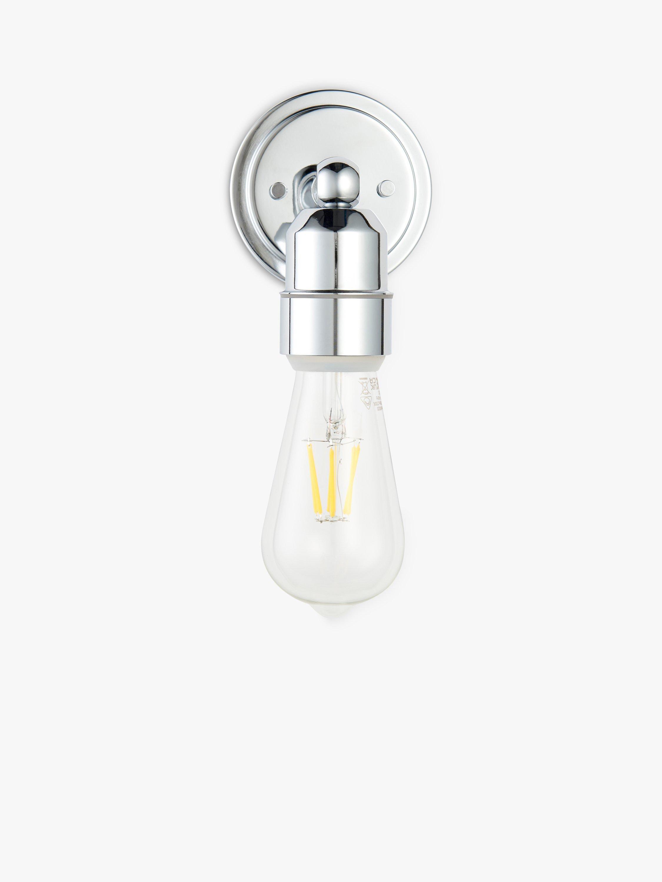Industrial-inspired wall light with an exposed lamp. This wall light keeps water out when a bulb is installed, so it's happily IP44-rated and bathroom-safe.