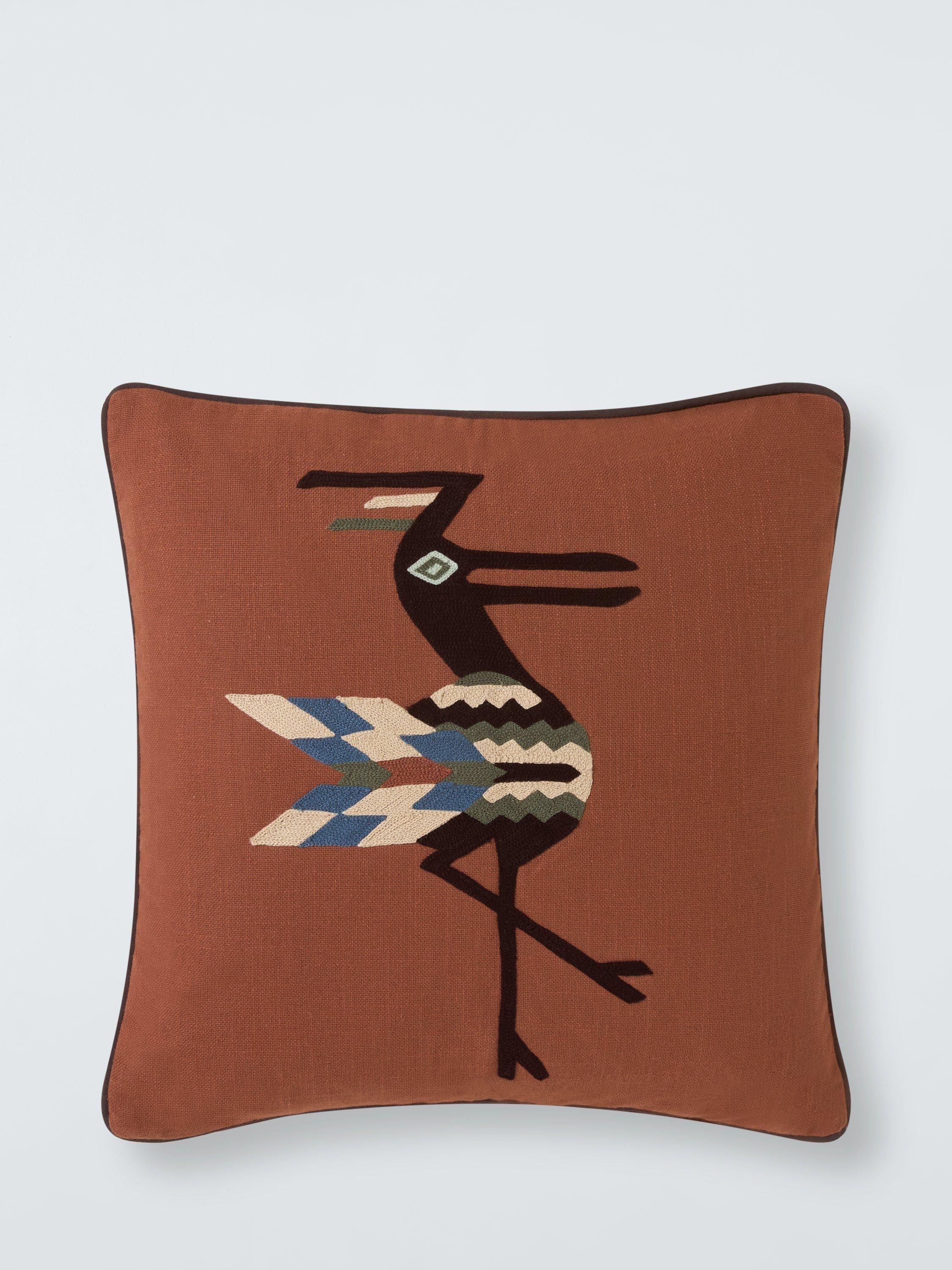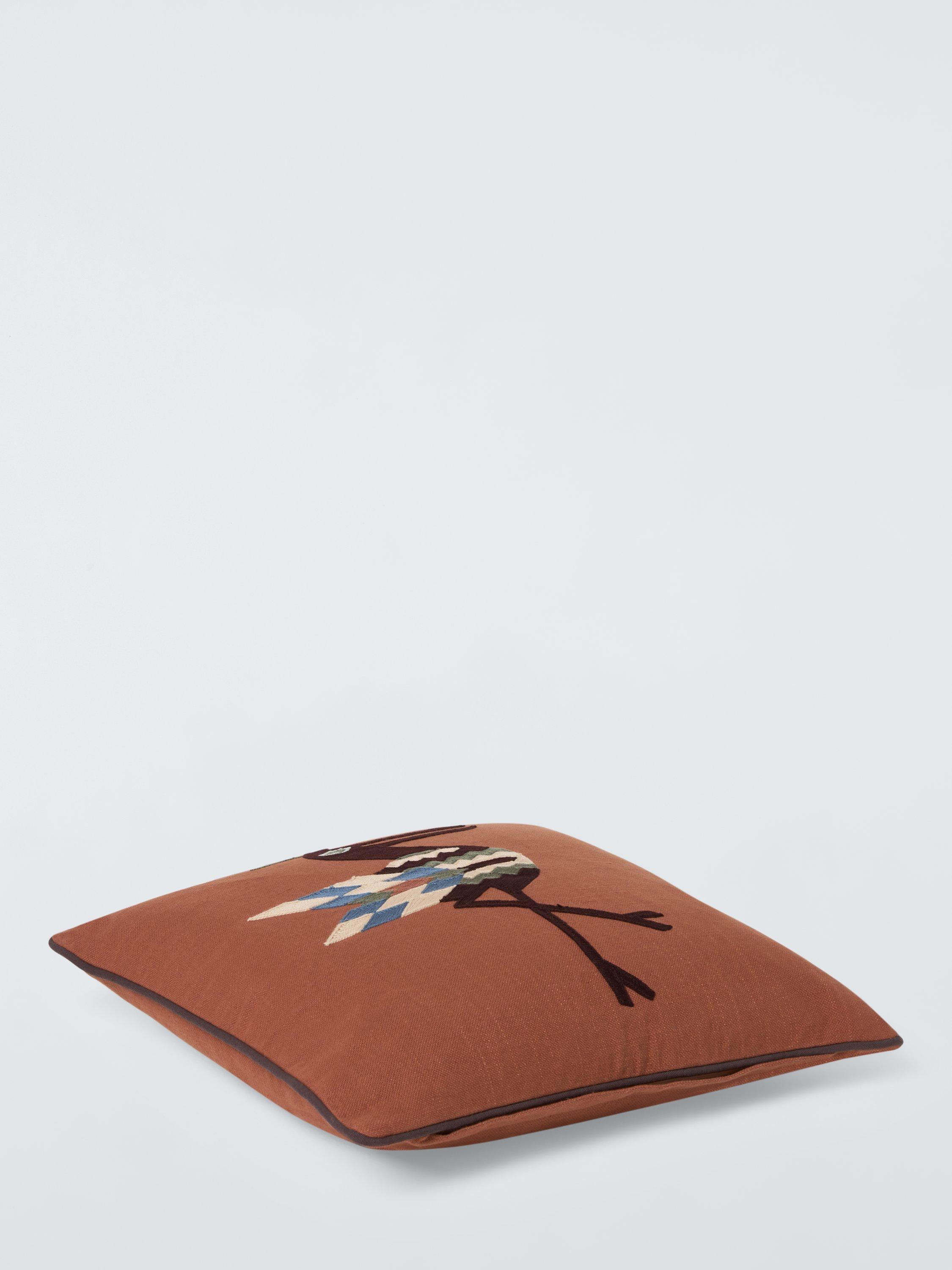 Geometric woven Fifi Bird struts her stuff on this playful cushion.