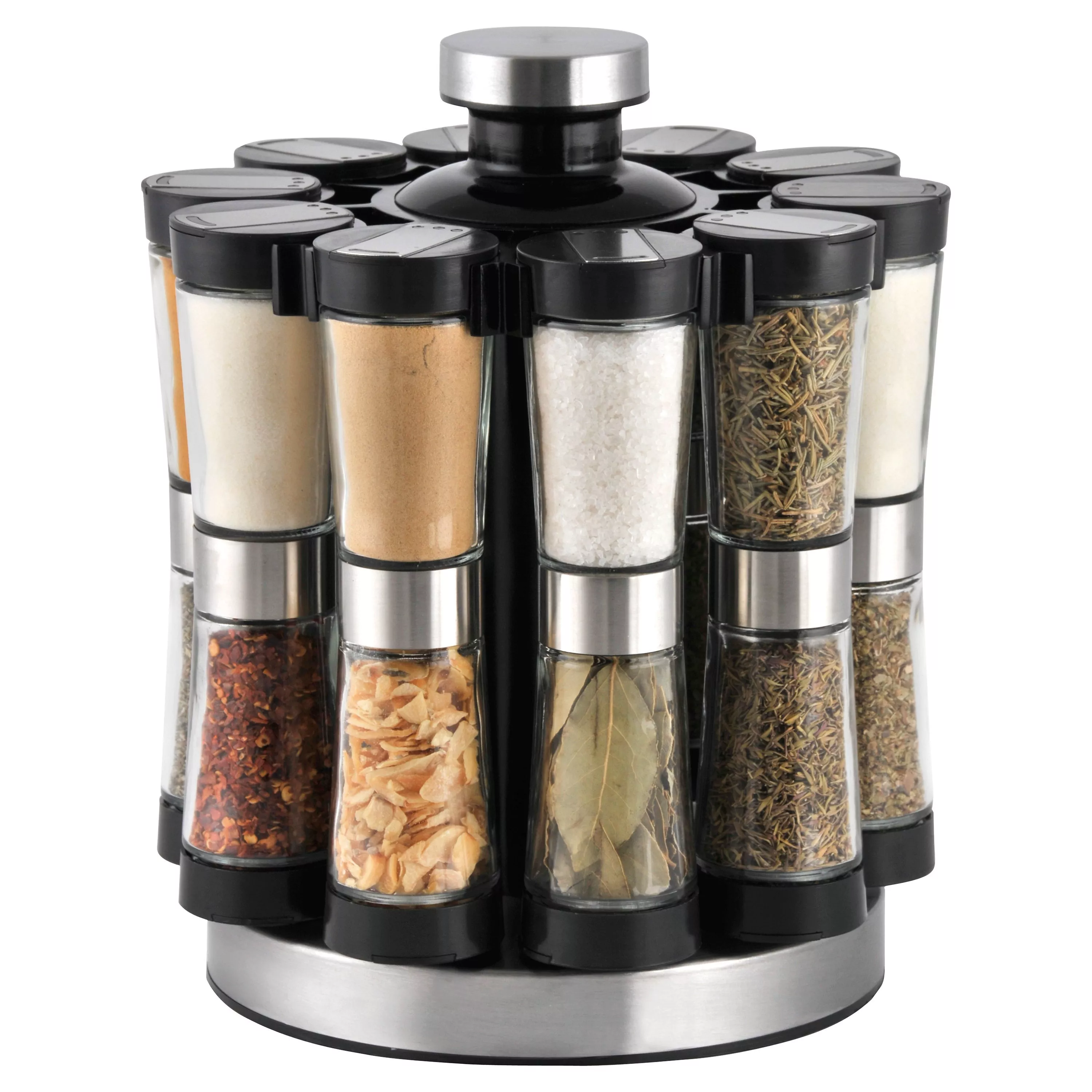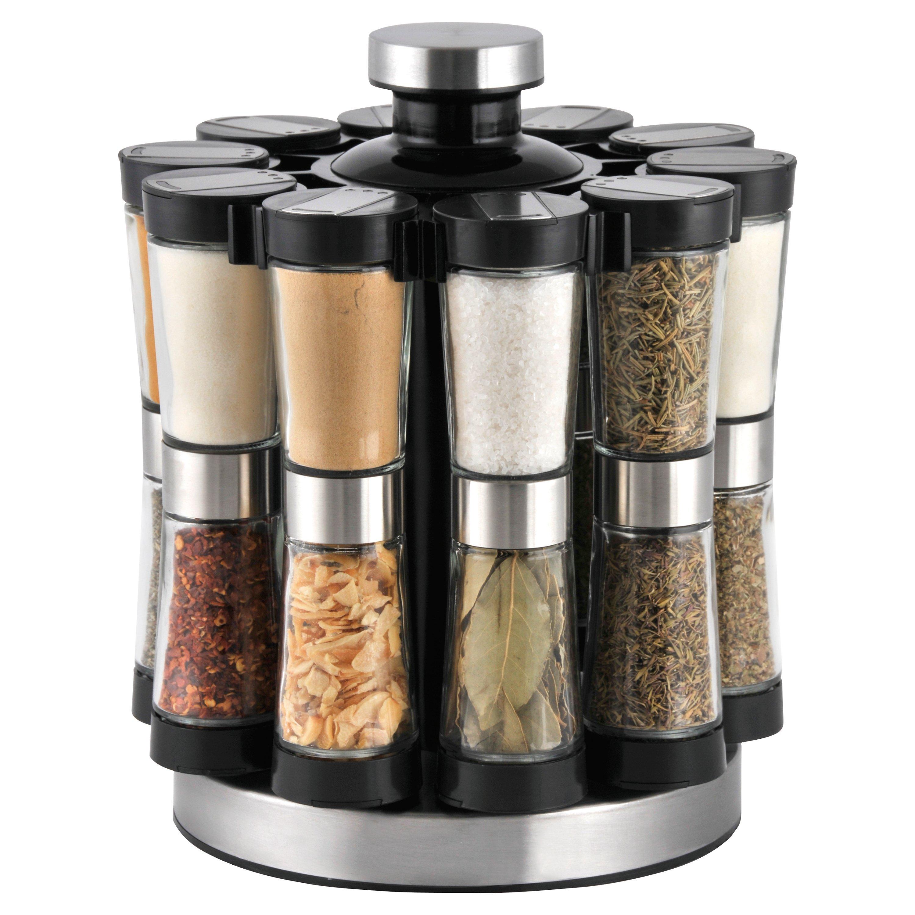 Keep all your seasonings close to hand with this practical carousel rack, made of chrome and glass. Comes ready filled with 20 jars of spices, which are refillable and can be replaced when empty, with flip lids for easy pouring. The revolving stand has a carry handle, so that it can be transported without fuss.