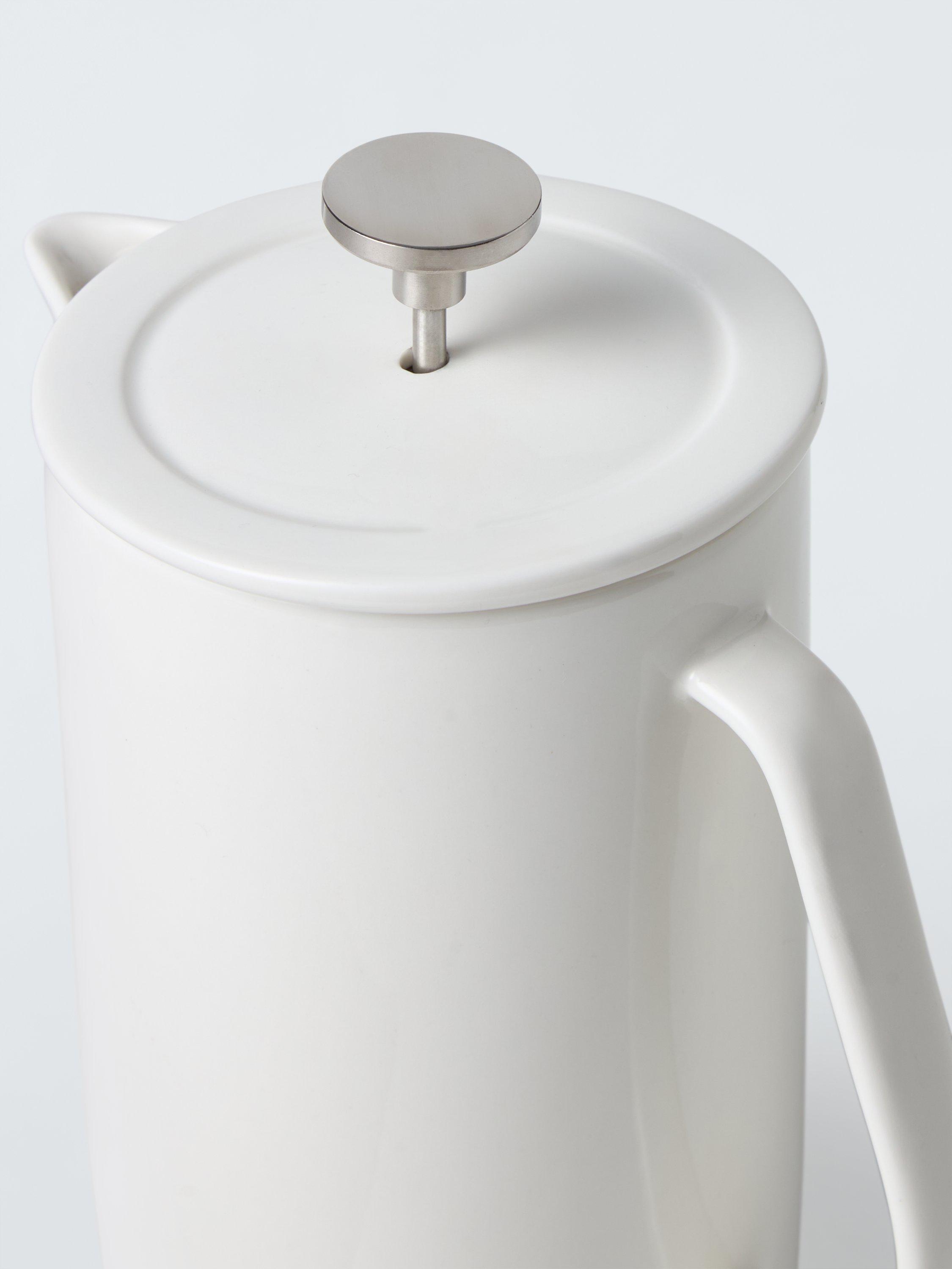 A traditional-style coffee press made of fine china. This contemporary take features a large handle that's easy to hold.