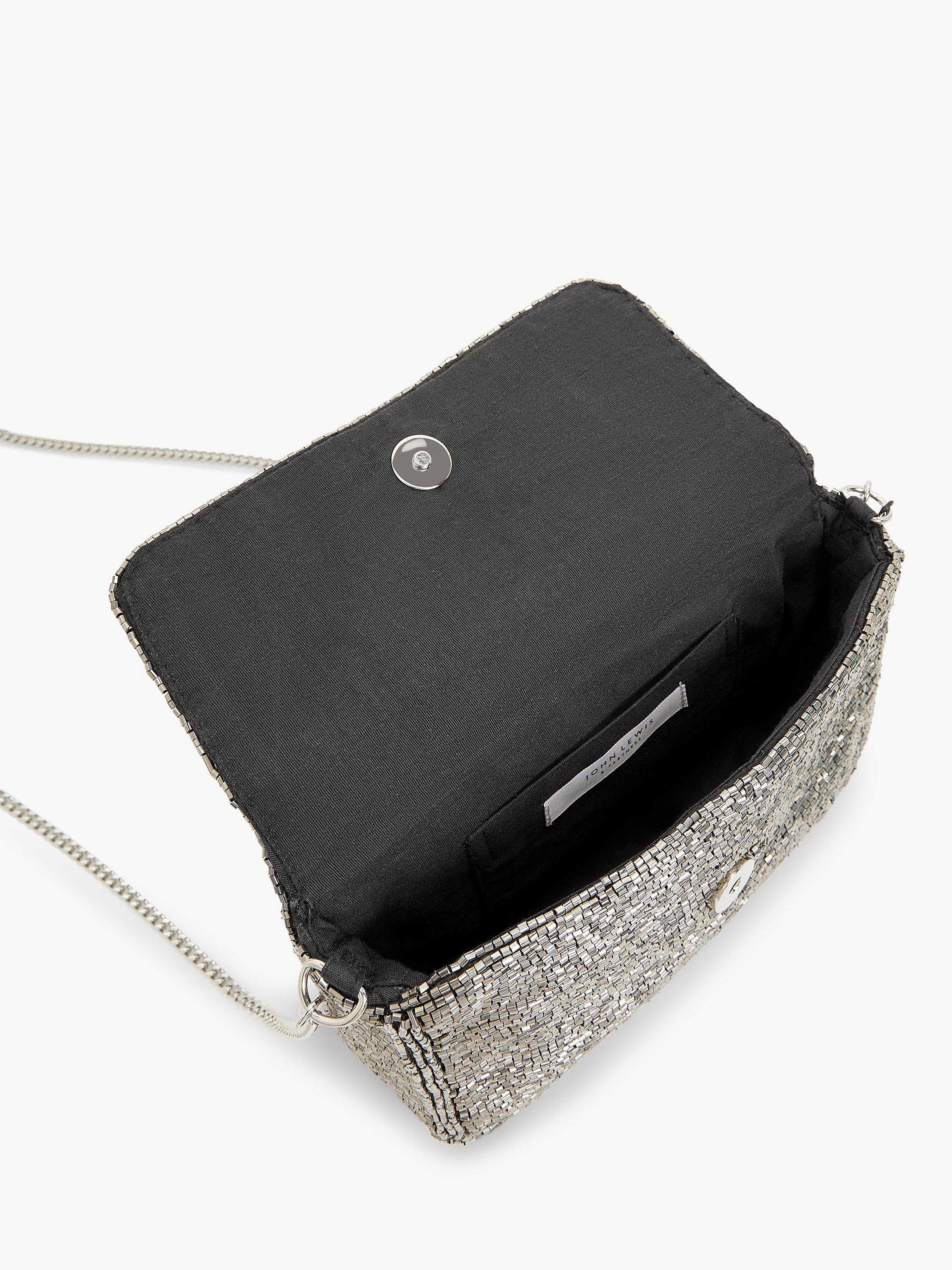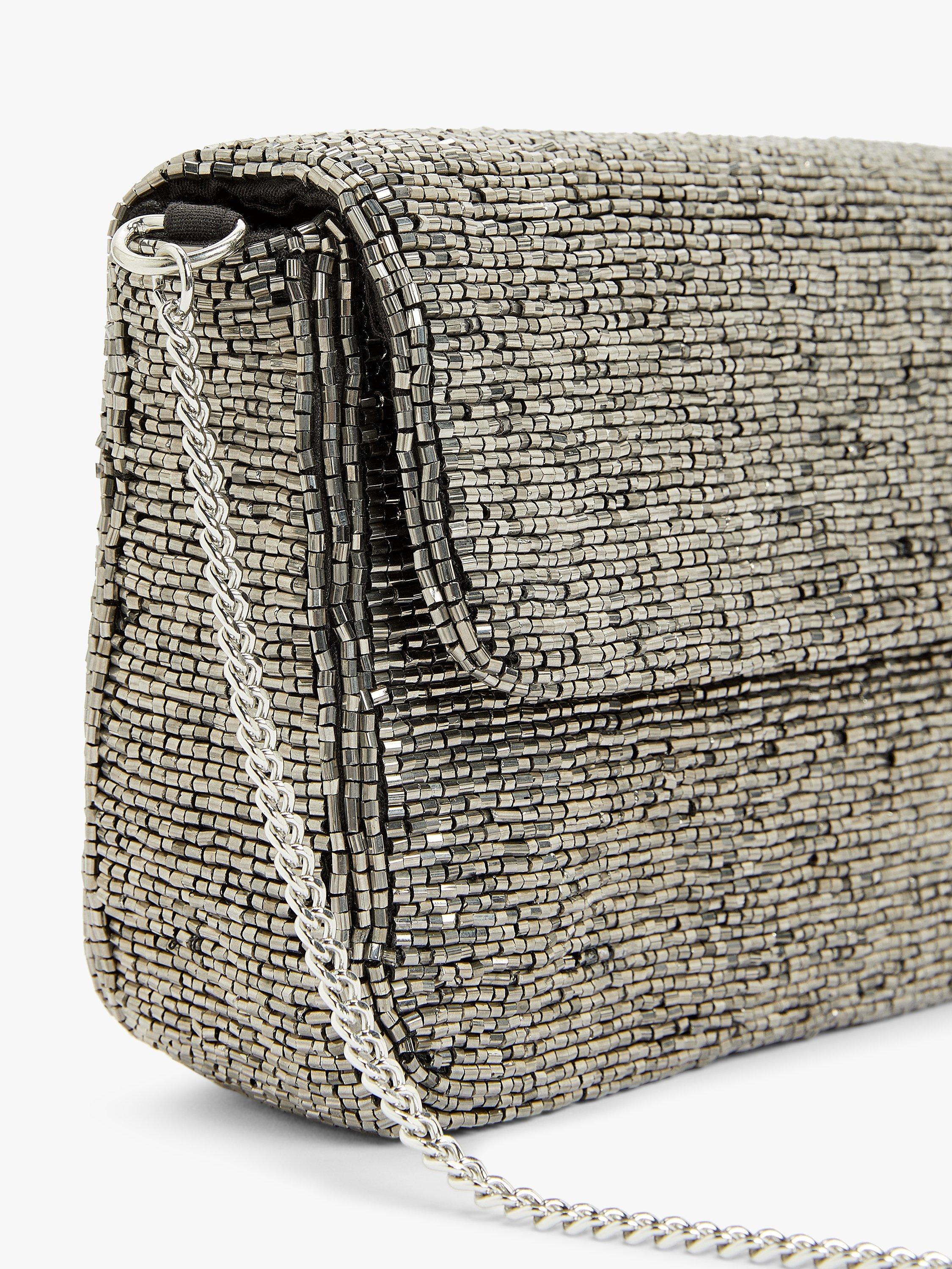 Add some sparkle to your outfit with our silver beaded clutch bag.