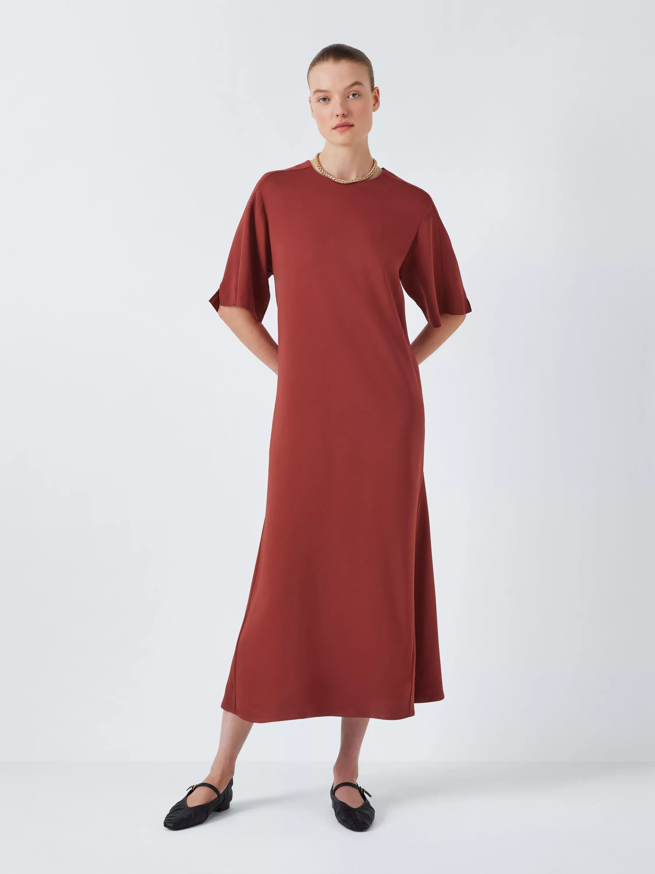 A flared midaxi-length dress with a short sleeve and a plain design. Styled with a round neck and made in lightweight viscose blend.