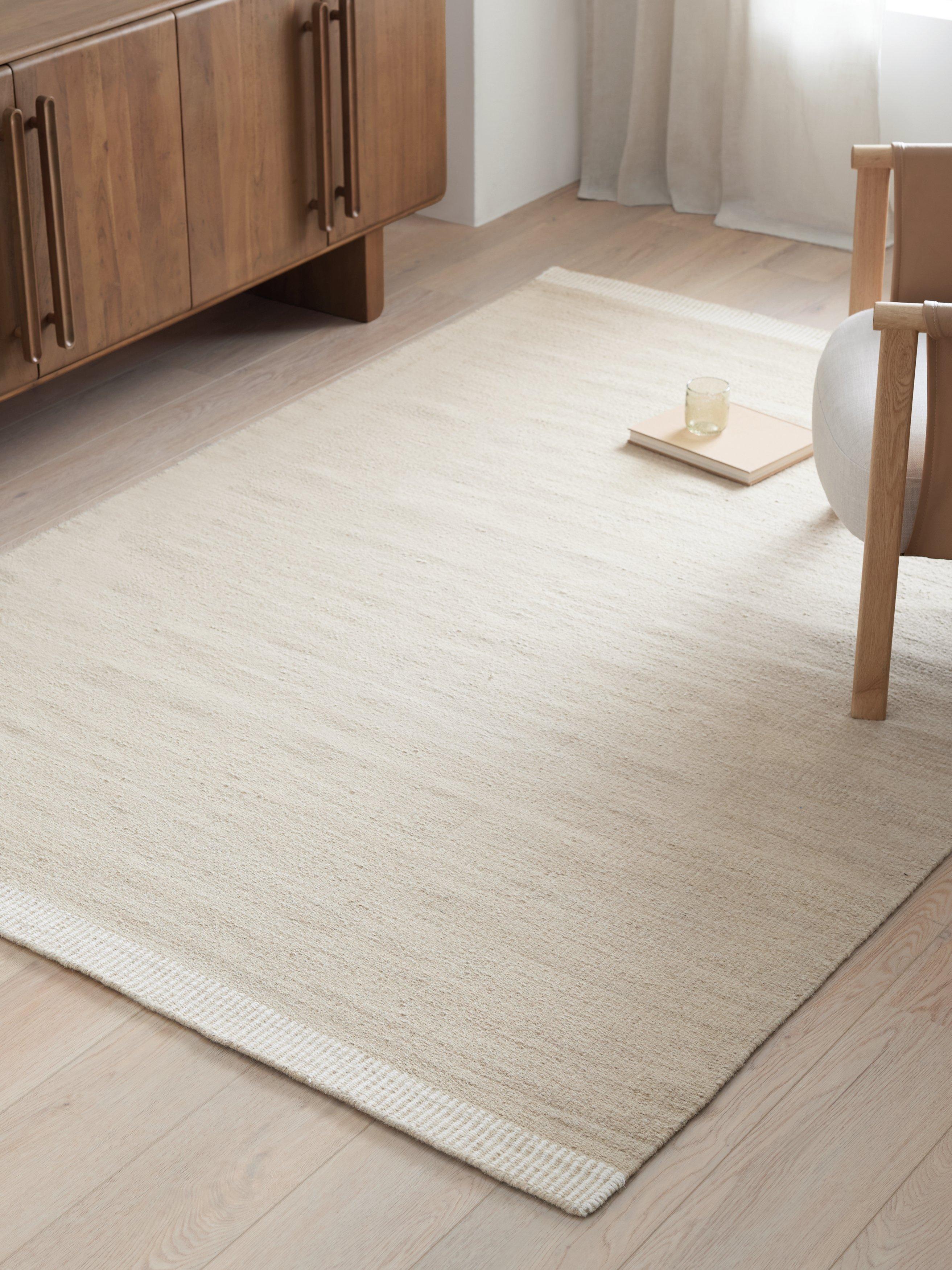 In a hard-wearing and long-lasting wool-rich weave, our flatweave rug comes with an elegant stripe trim.