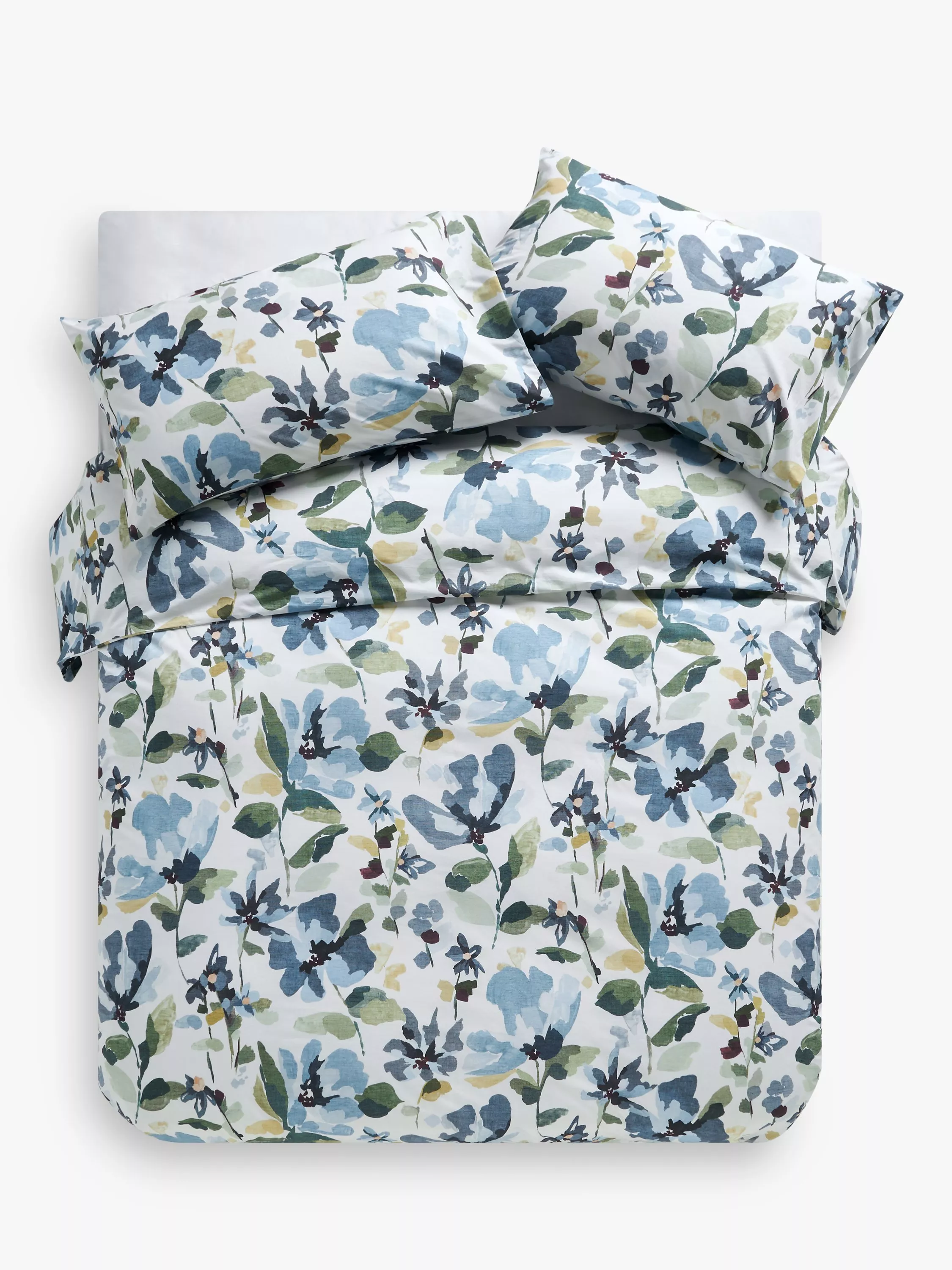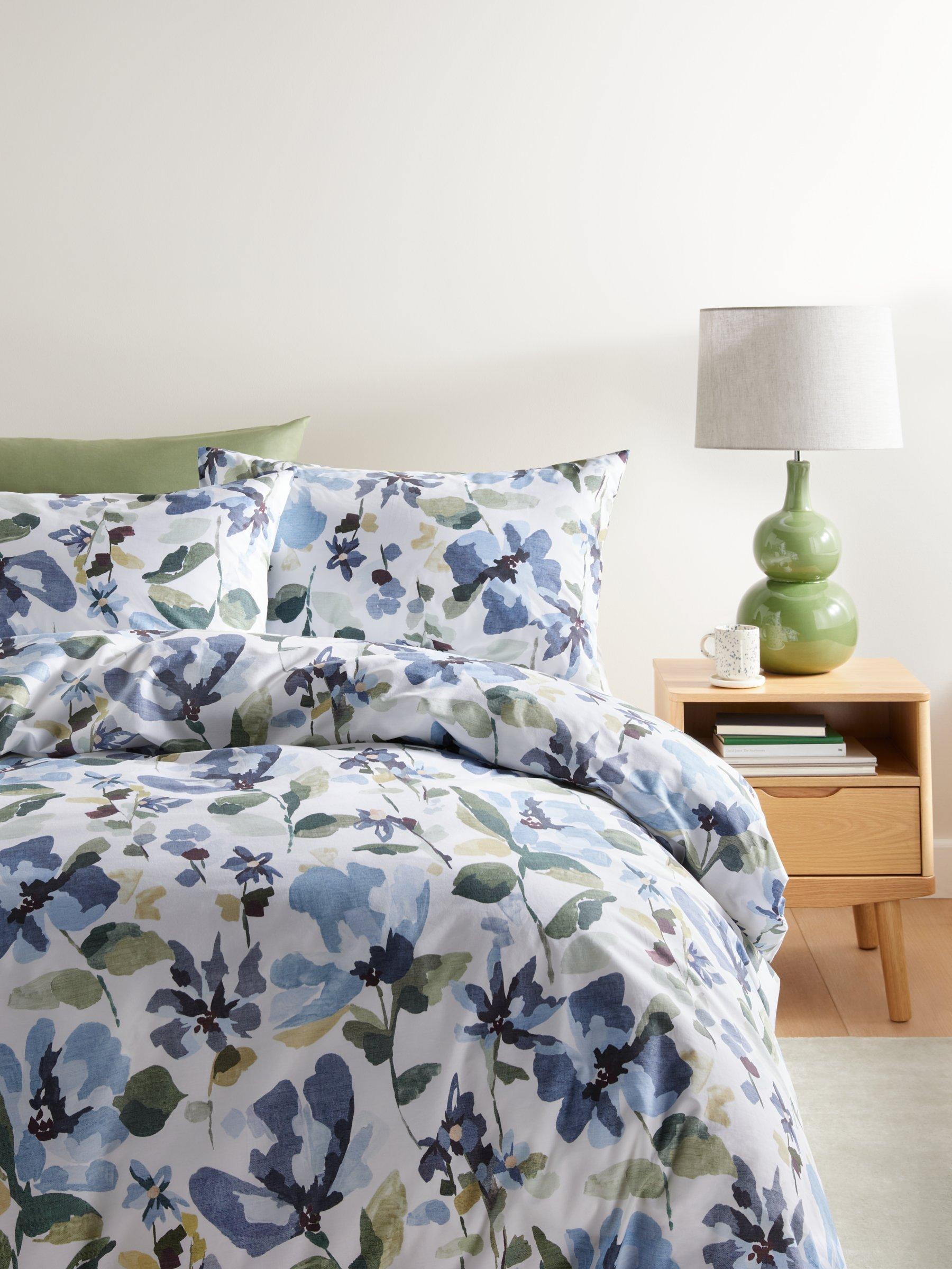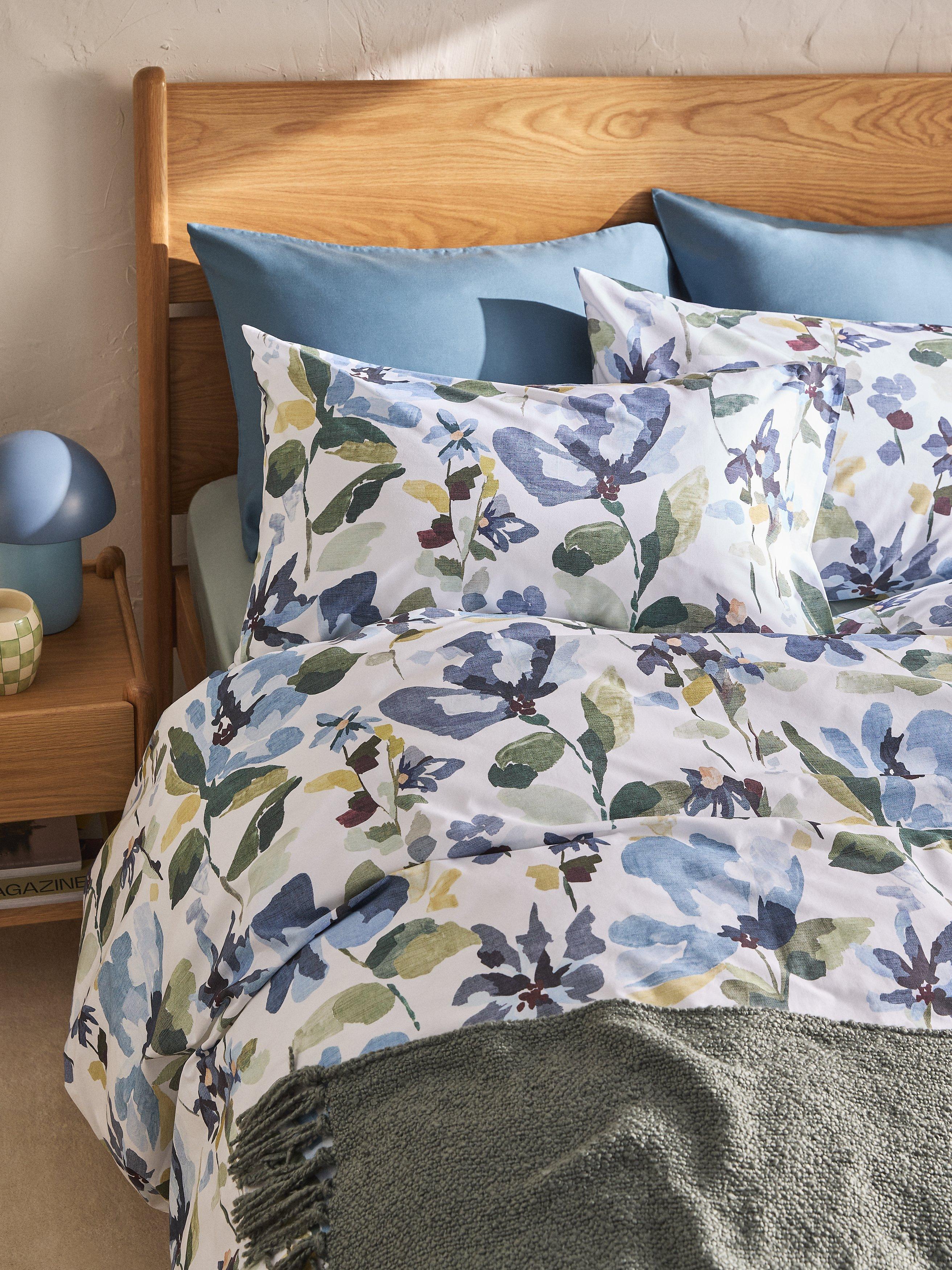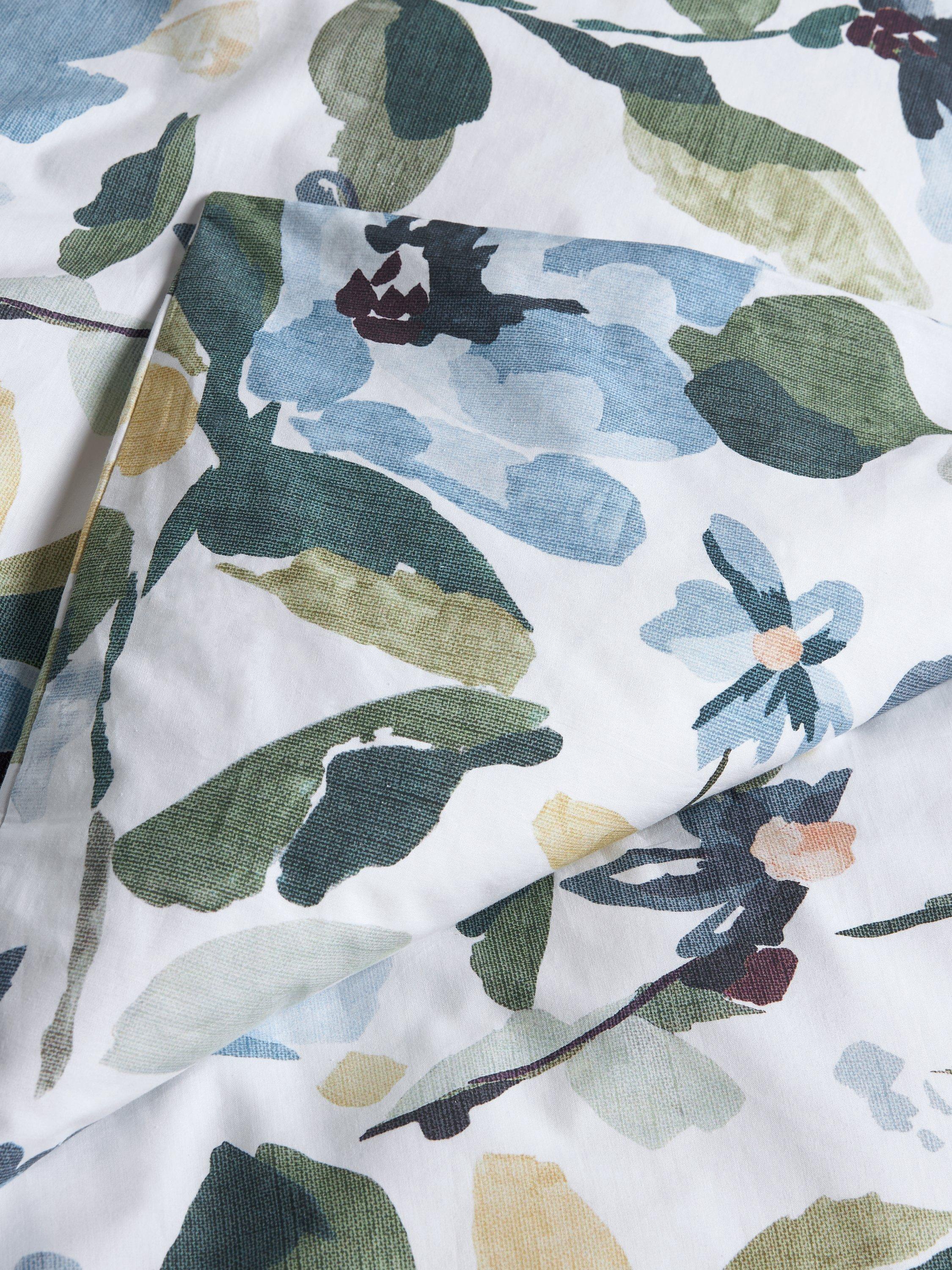 A painterly floral on a woven background. The muted tones of natural, blue and green lend a restful look for the ideal bedroom ambience.