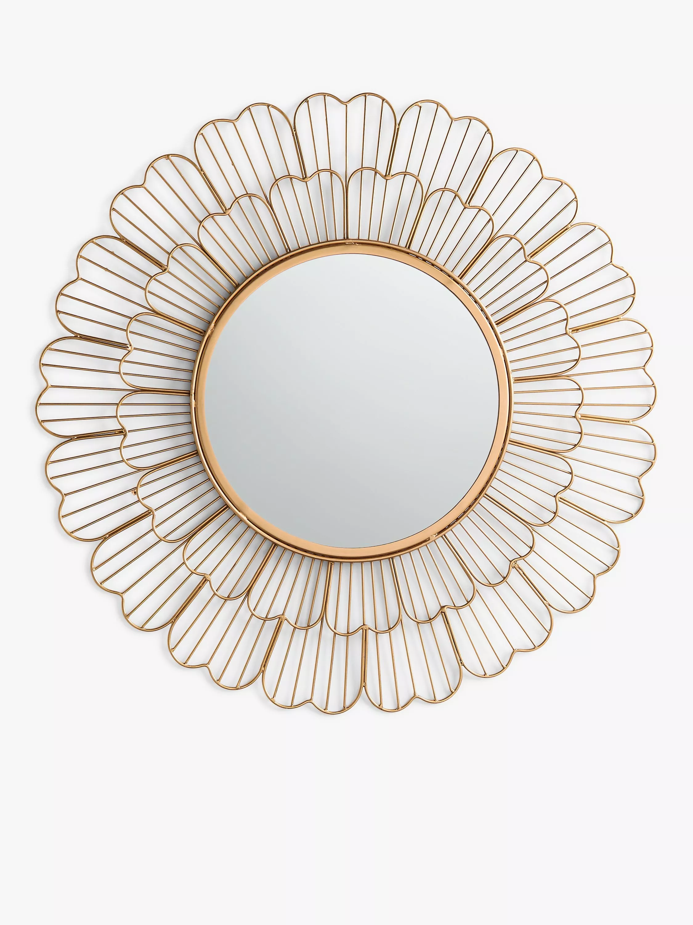 Our Fleur mirror, on the wall, just might be the fairest of them all. Inspired by flower petals, its pretty, intricate metal frame has an eye-catching gold-toned finish that brightens any room. It really comes into bloom on a plain wall with the colour of your décor showing through the frame.
