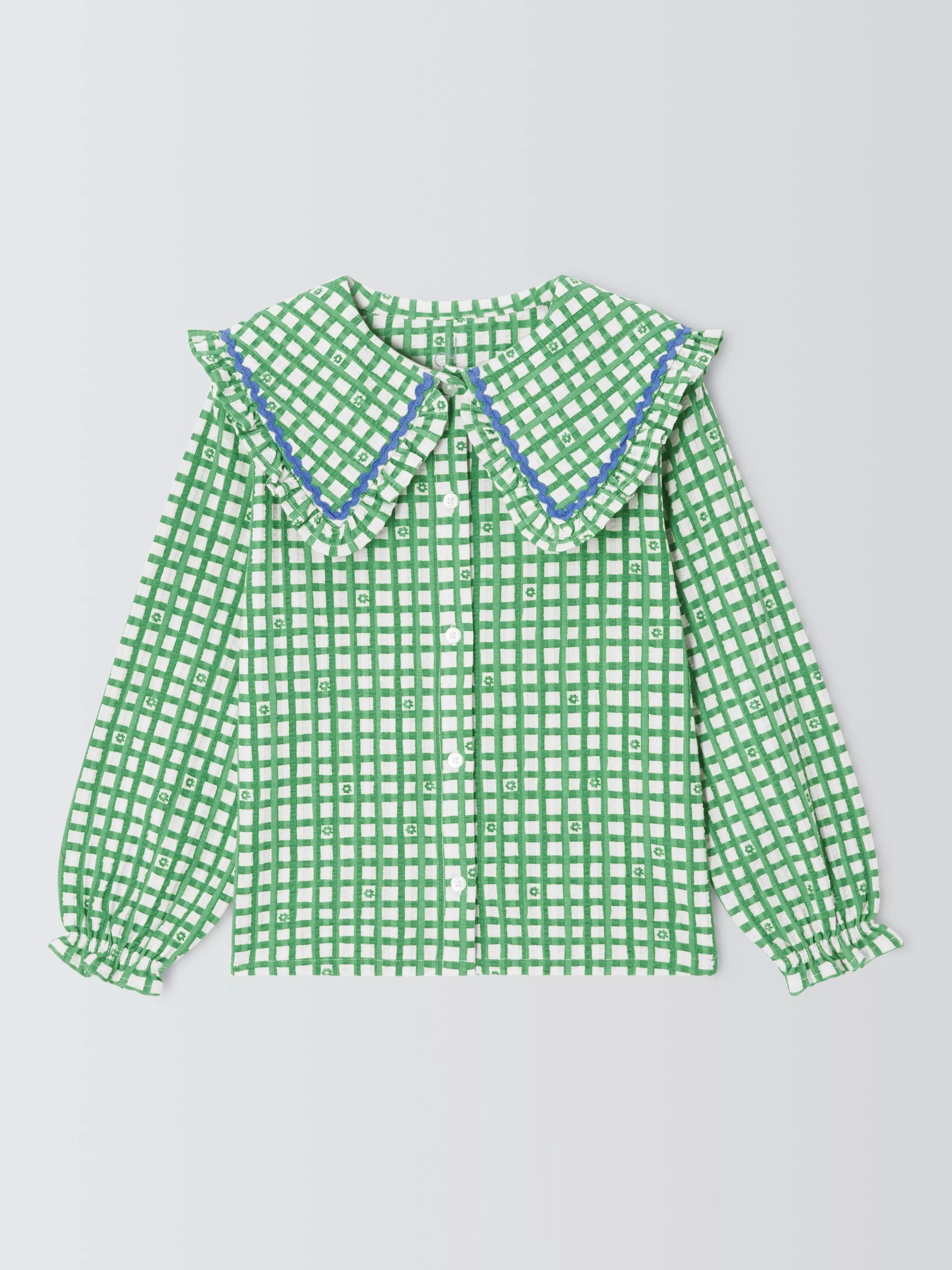 A vibrant, floral gingham check shirt with oversized collar featuring ric rac trim.