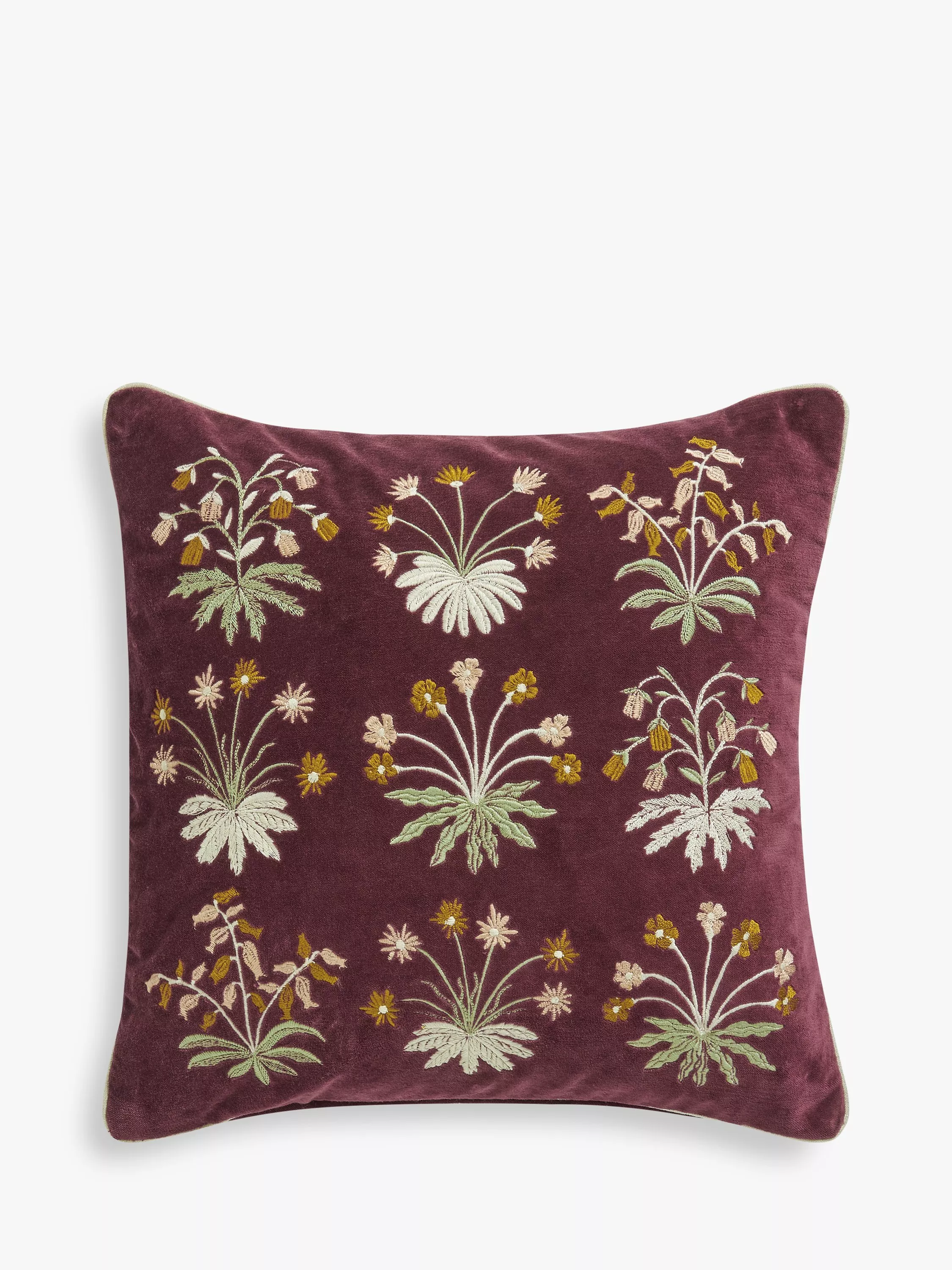 This cotton velvet cushion has a hand-guided machine embroidery design of woodland flowers.