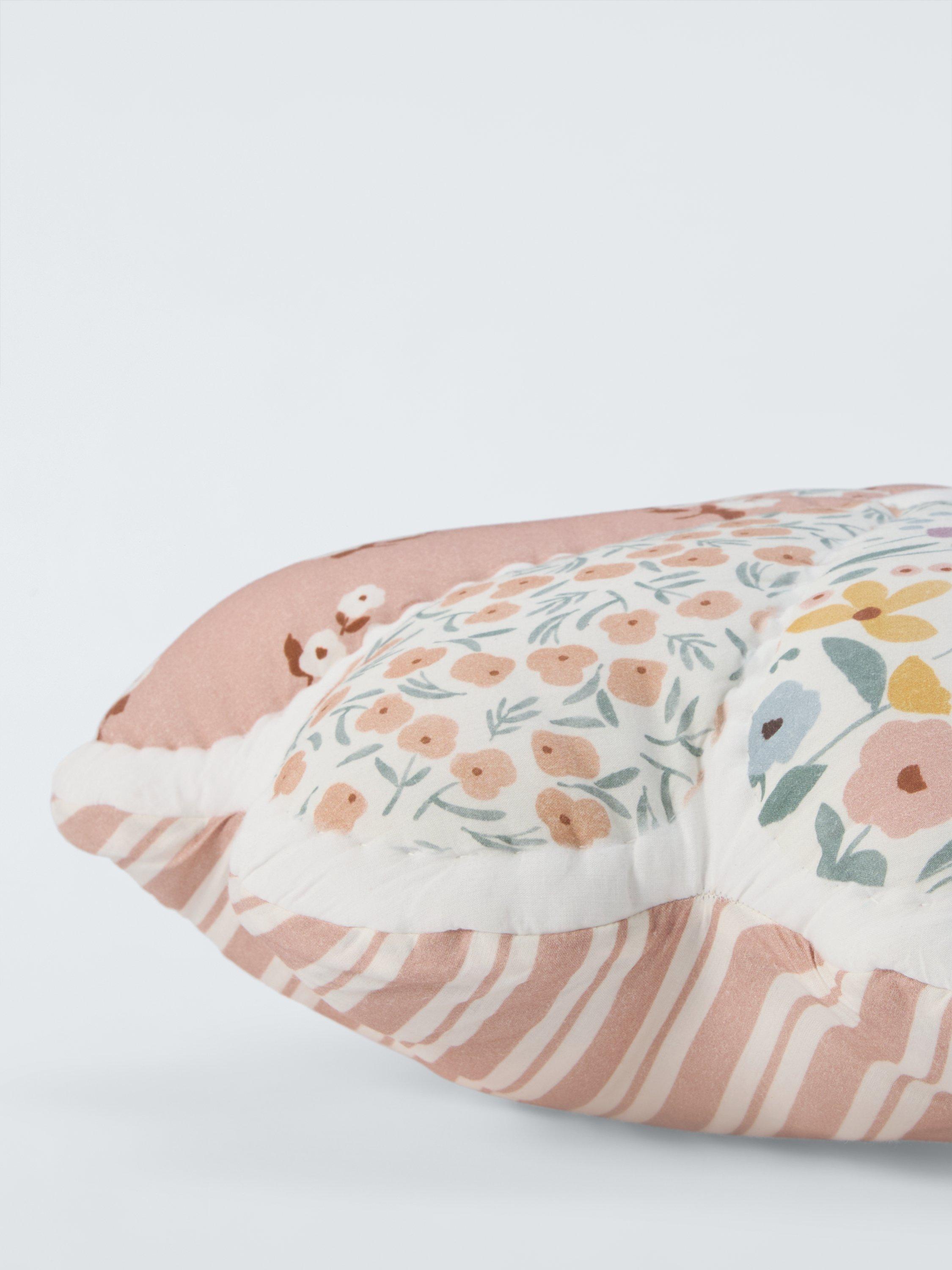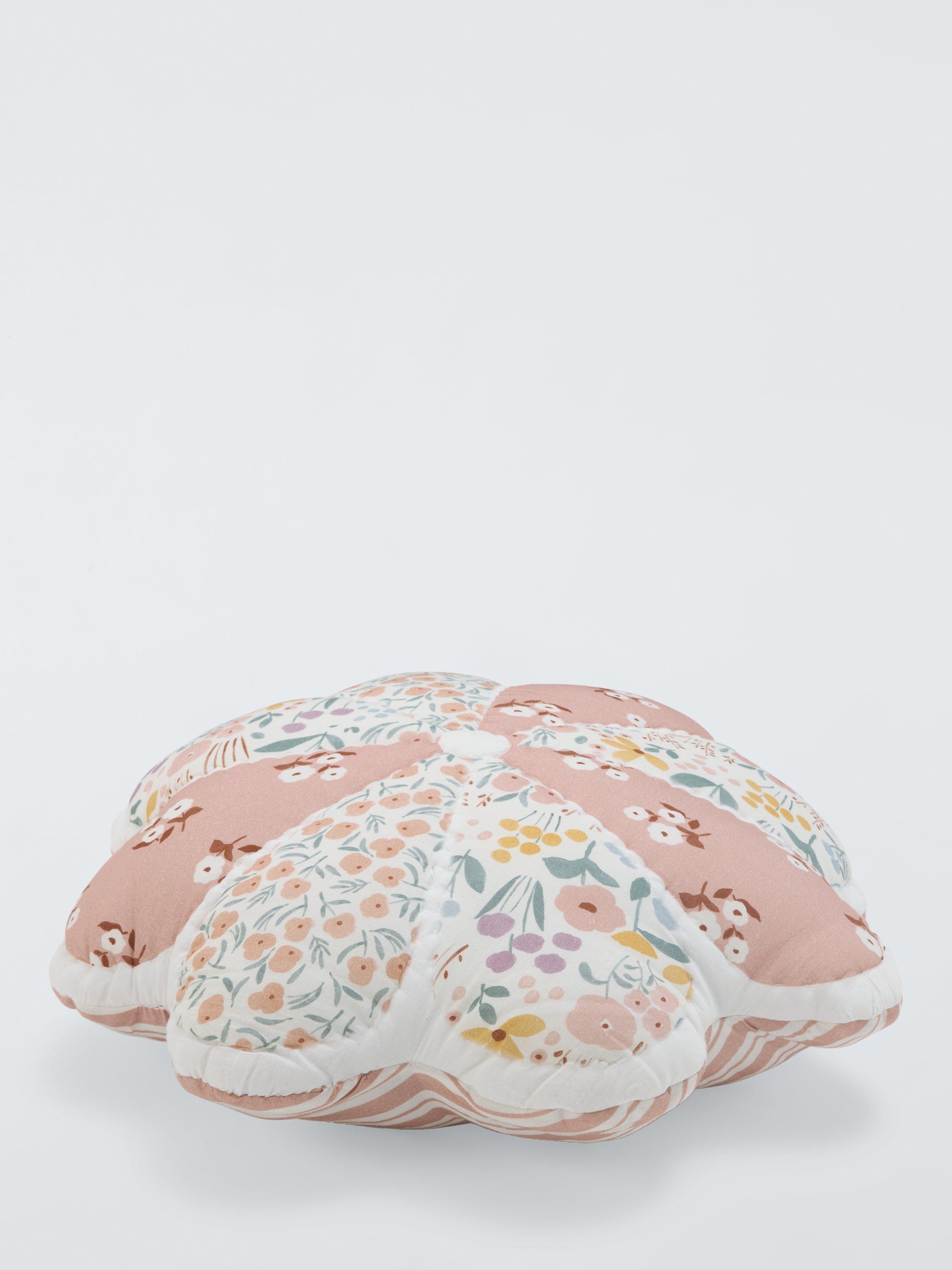 Flower-shaped cushion, with a quilted cotton cover of patchwork floral prints.