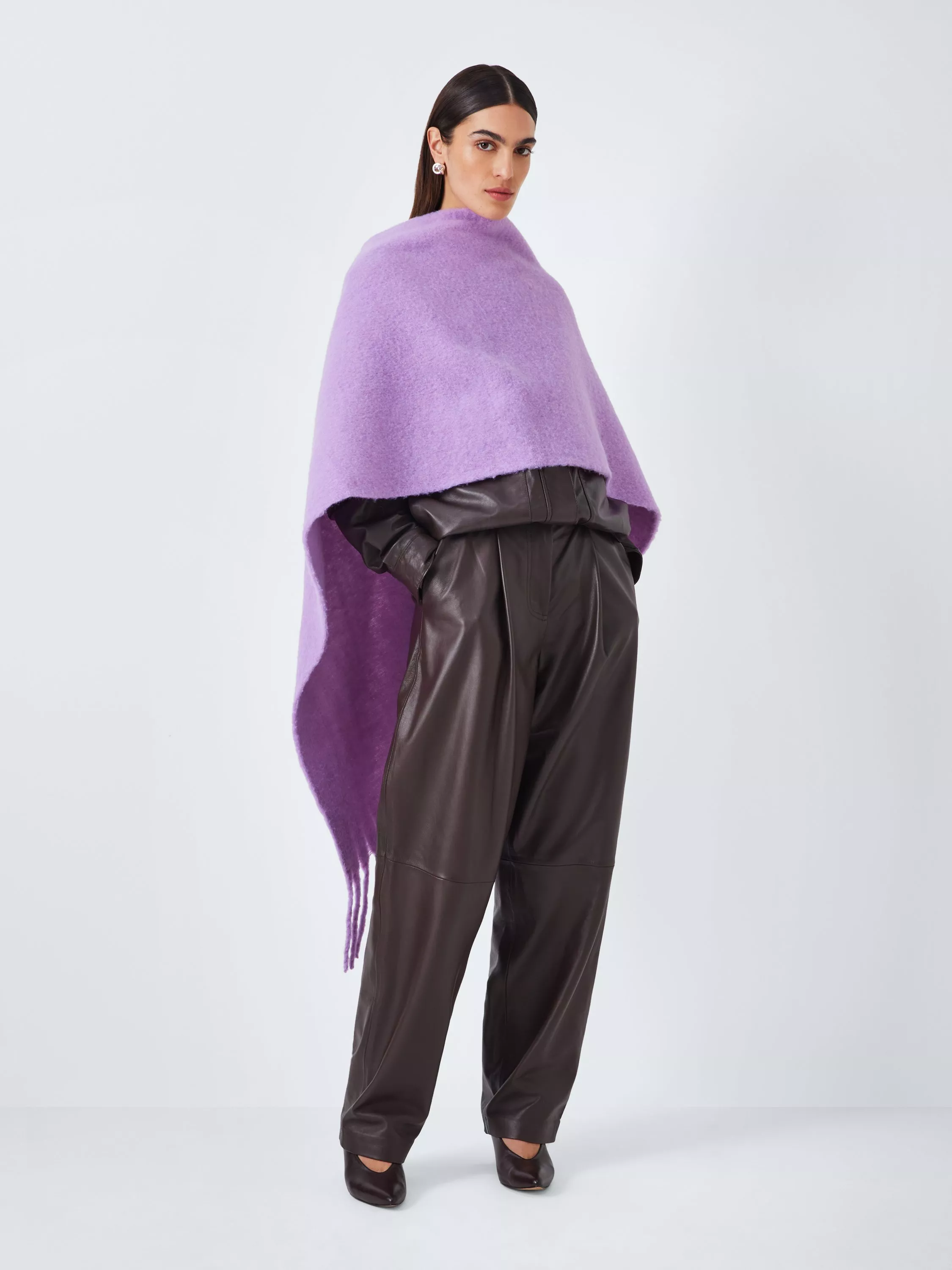Cosy knitted wool-blend scarf, fluffy and tasselled for texture.