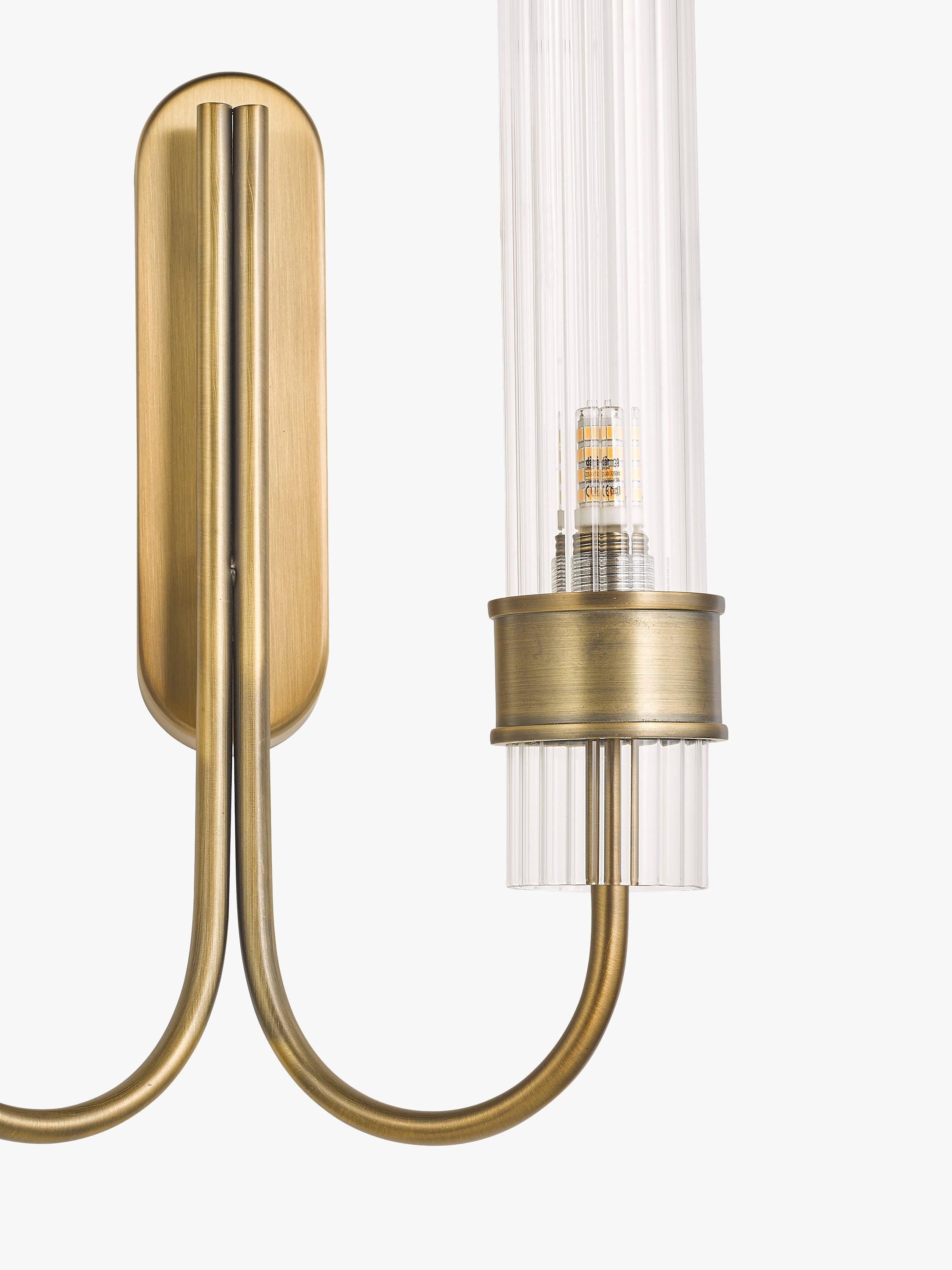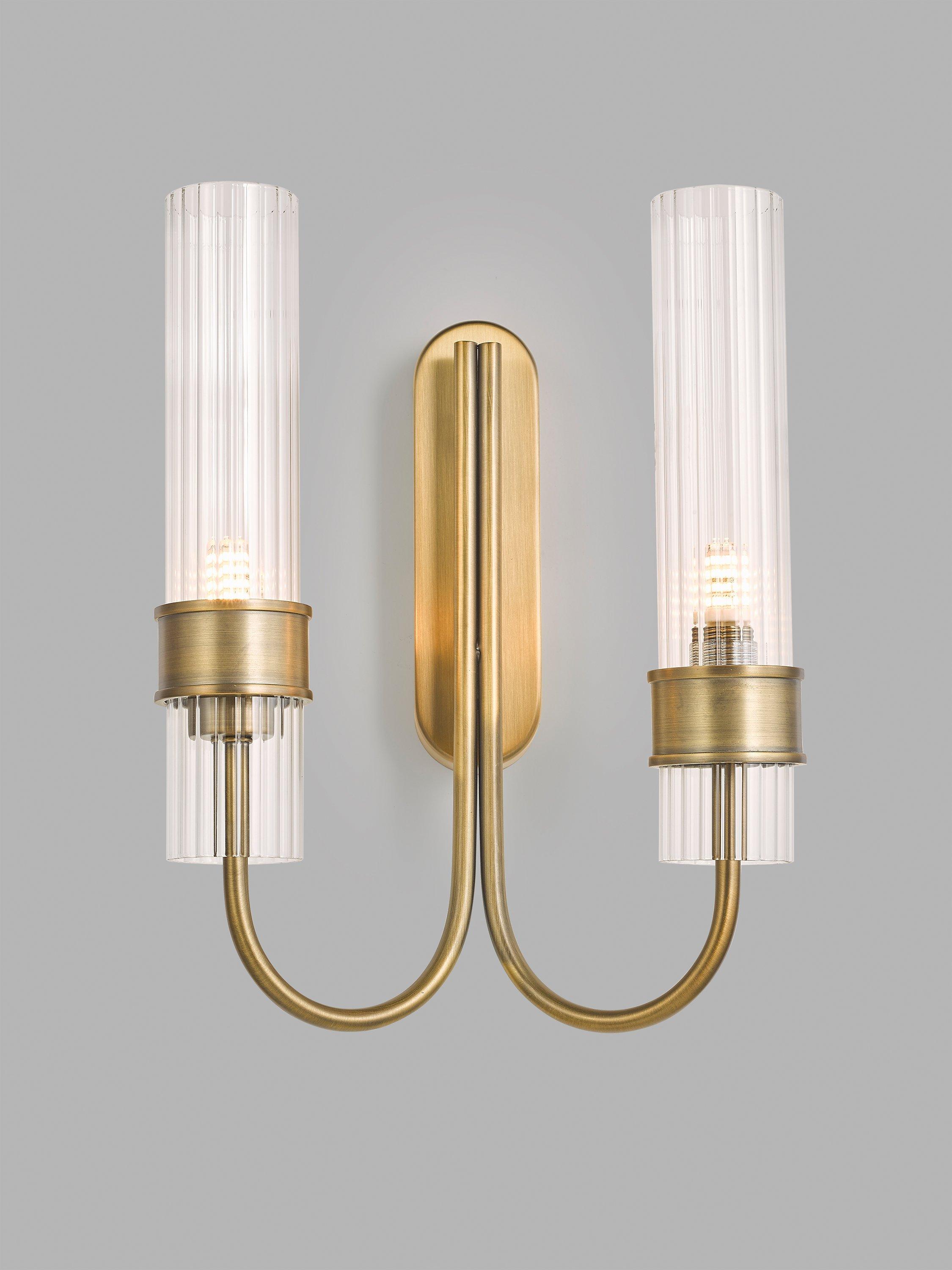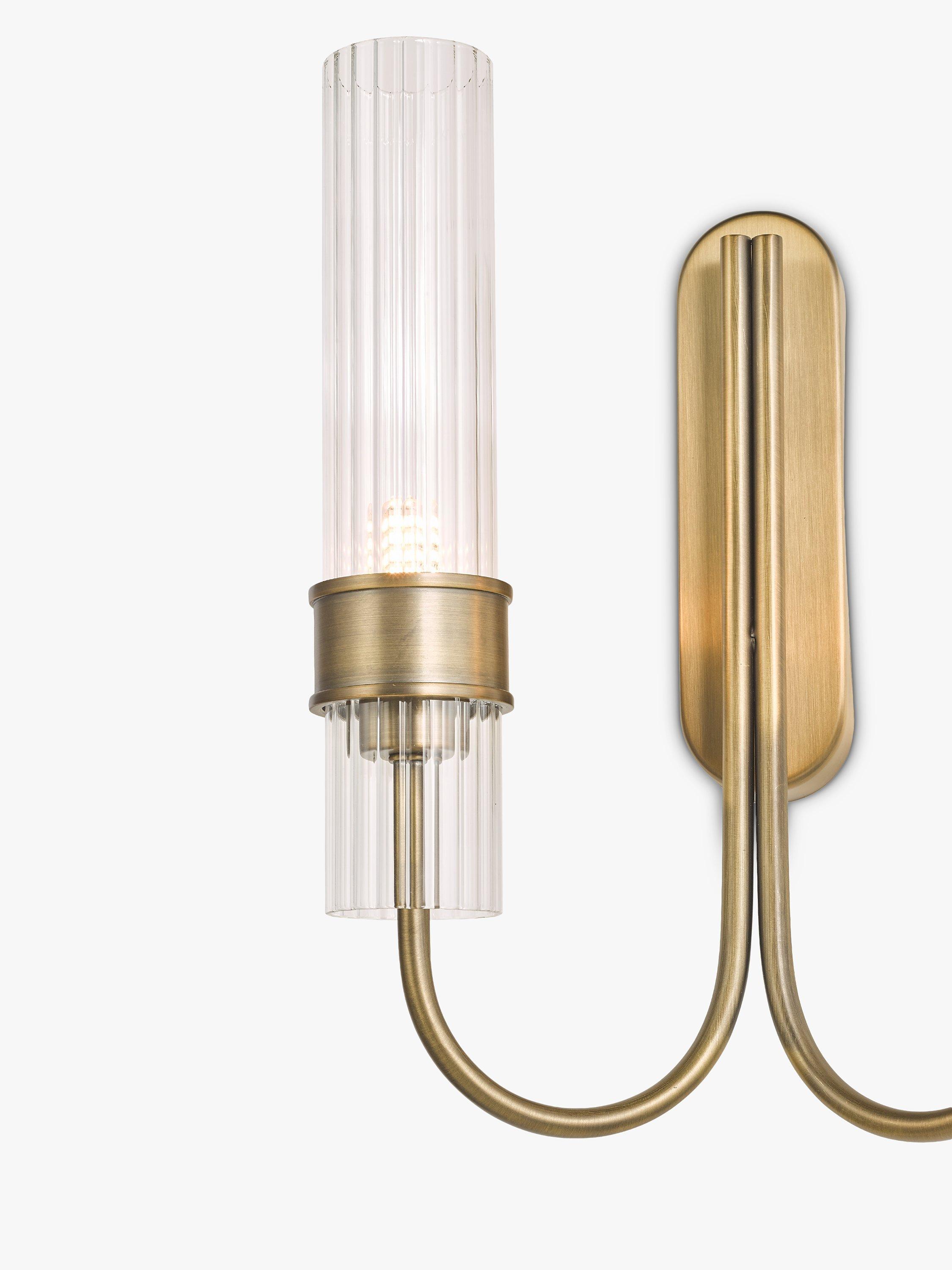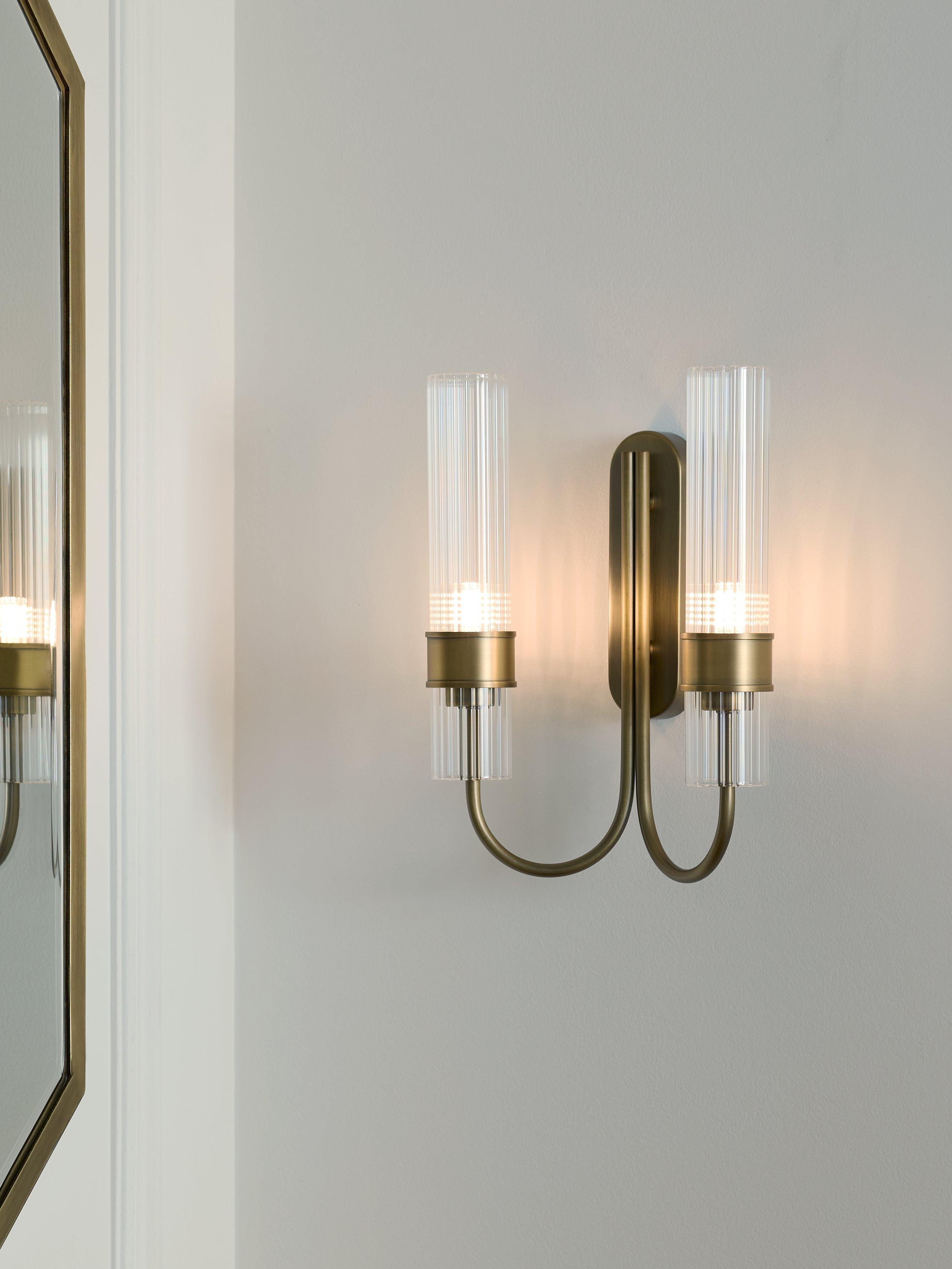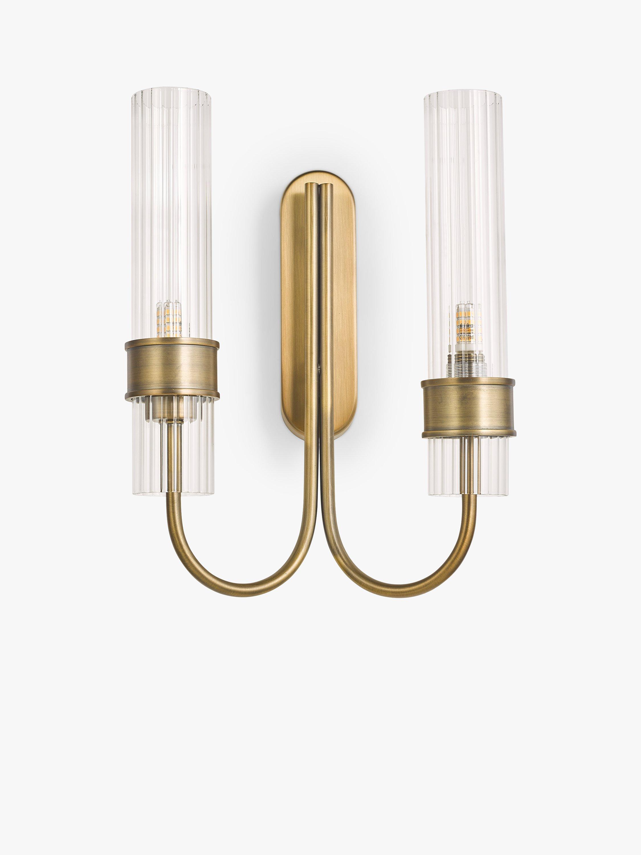 We love the Fluted Glass Wall Light. It oozes timeless appeal with its soft, flowing arms that curve down into two tall shades. Stunning, clear ribbed glass shades sit on either side of the two brass lamp holders.