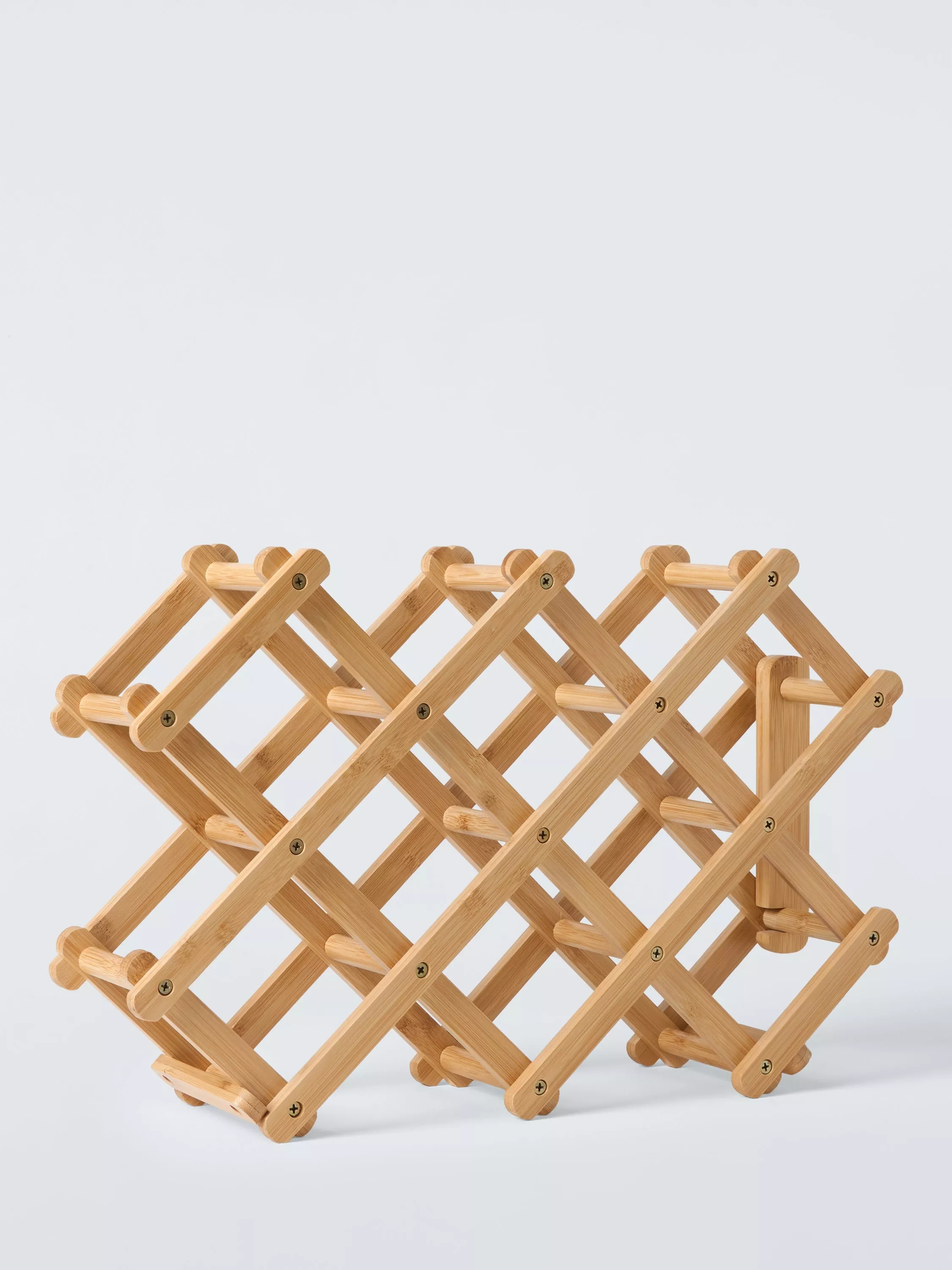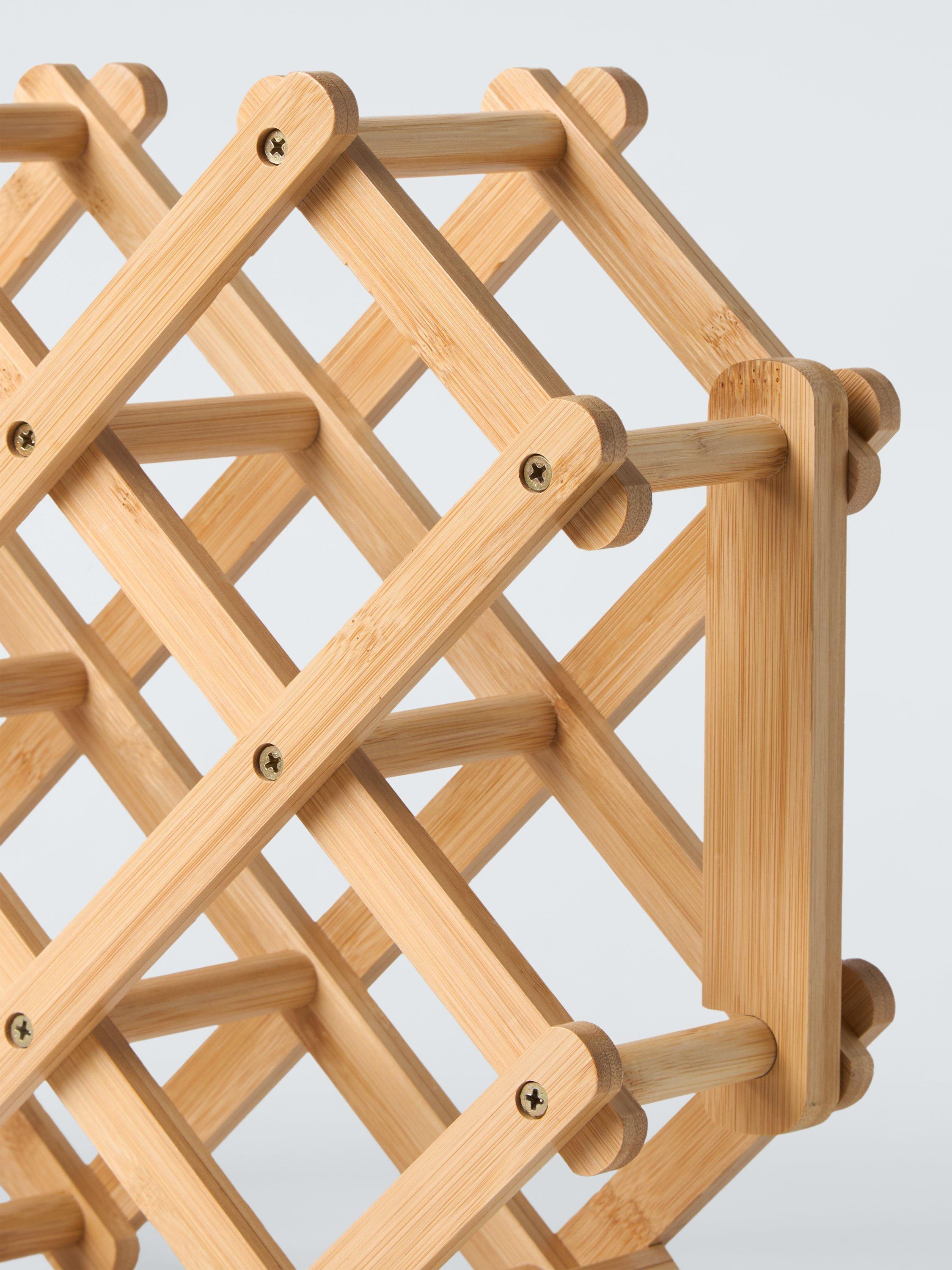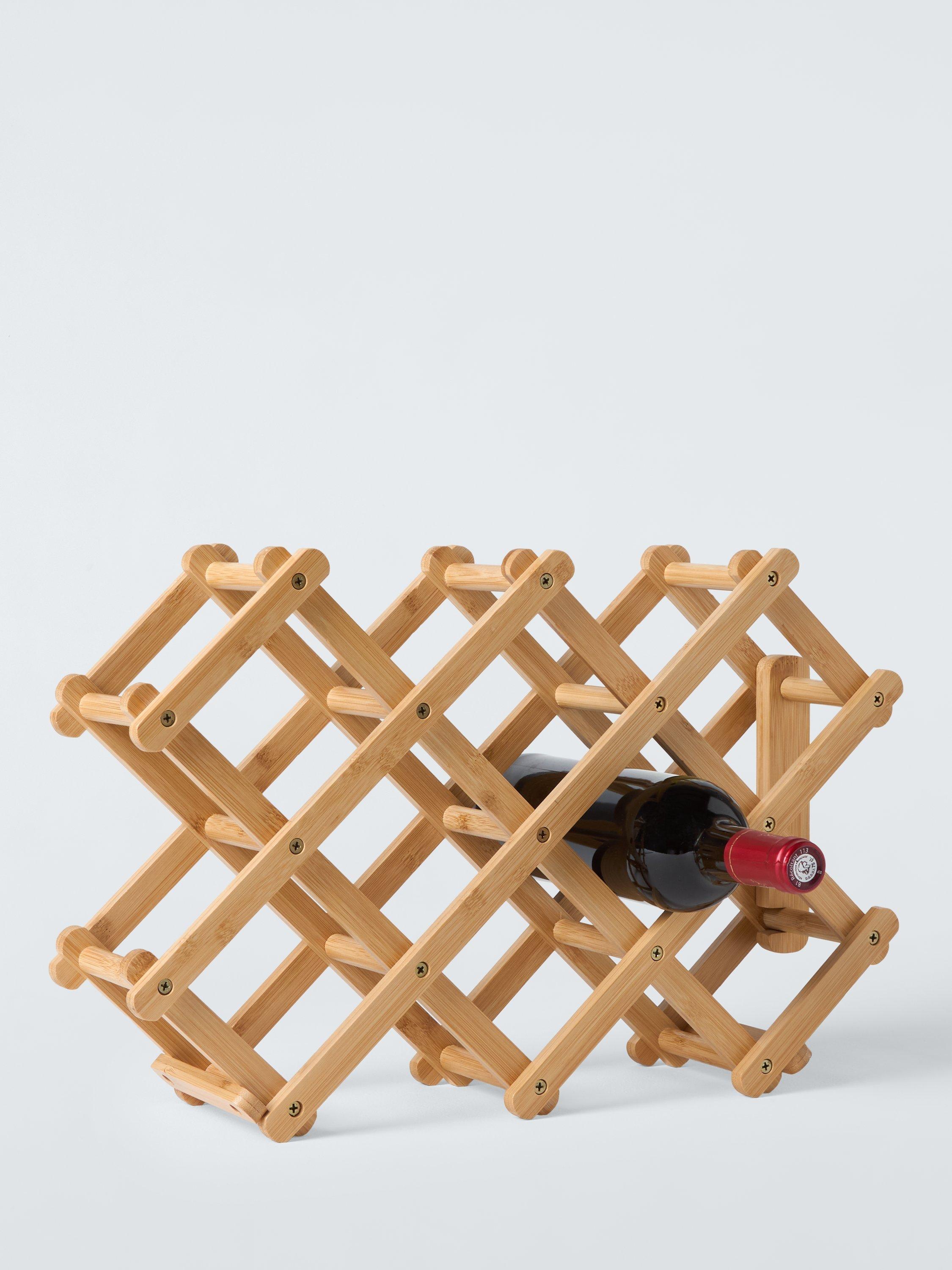 Space-saving bamboo wine rack that folds for compact storage. Open it up to hold up to eight standard-sized bottles.