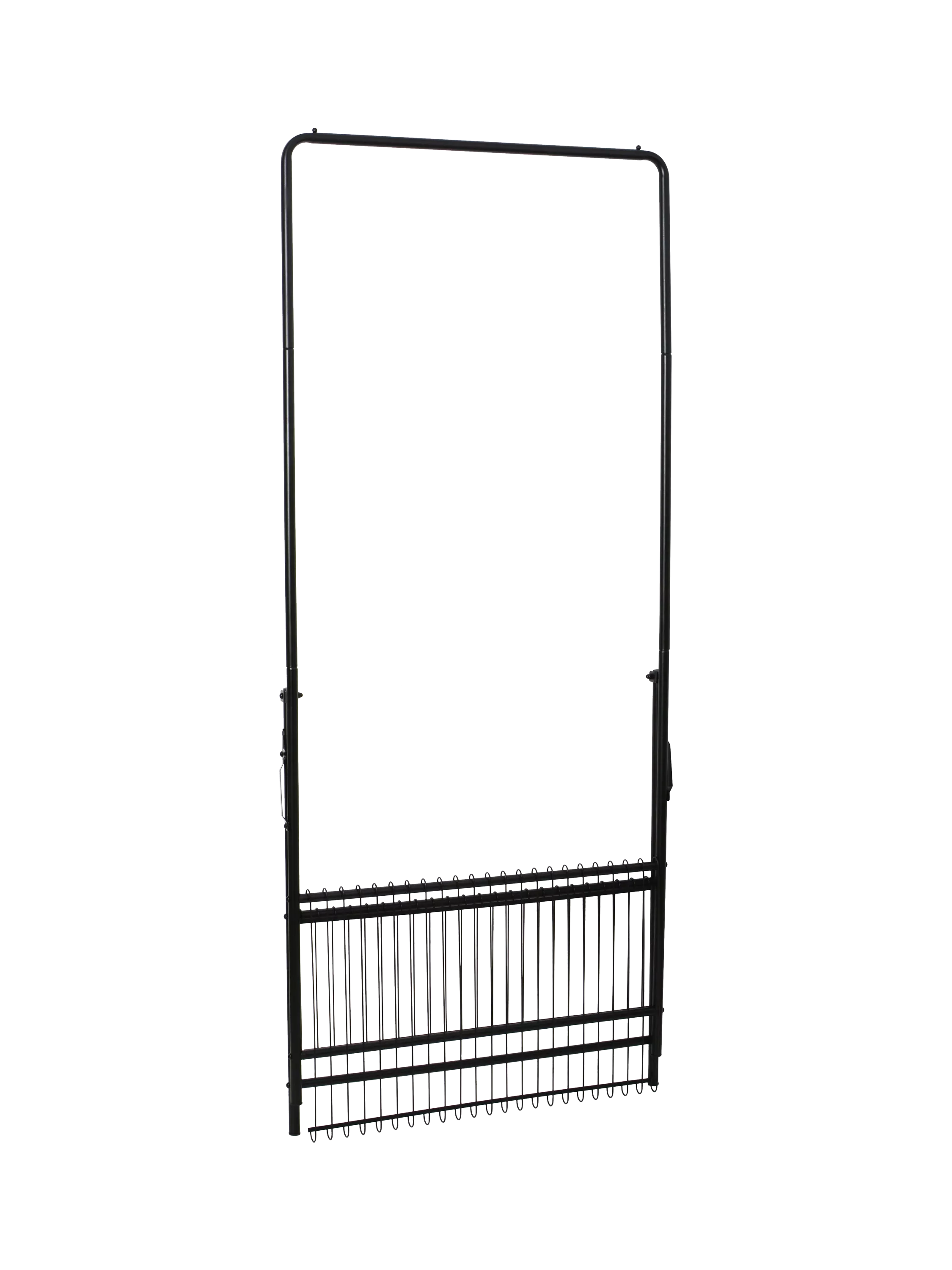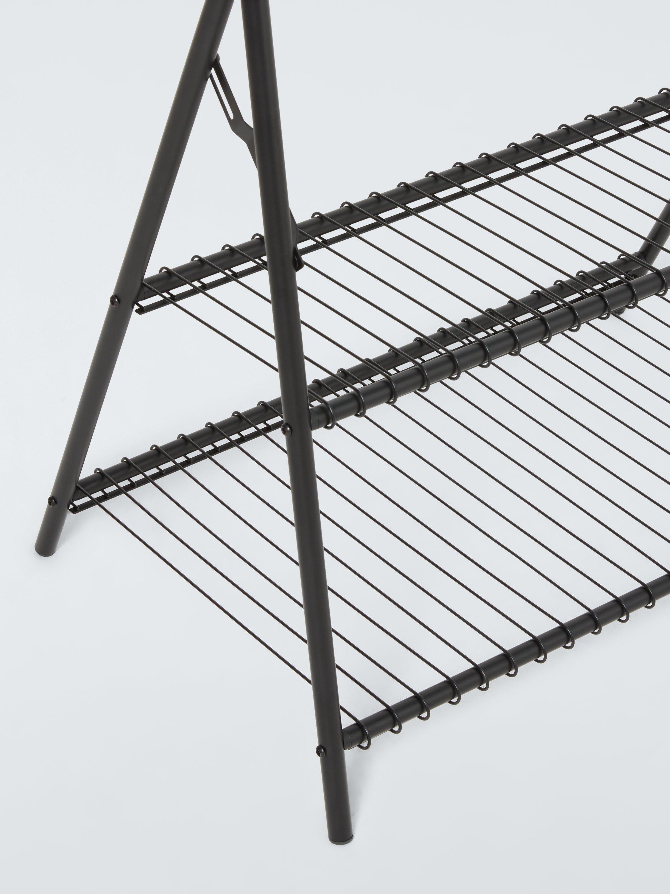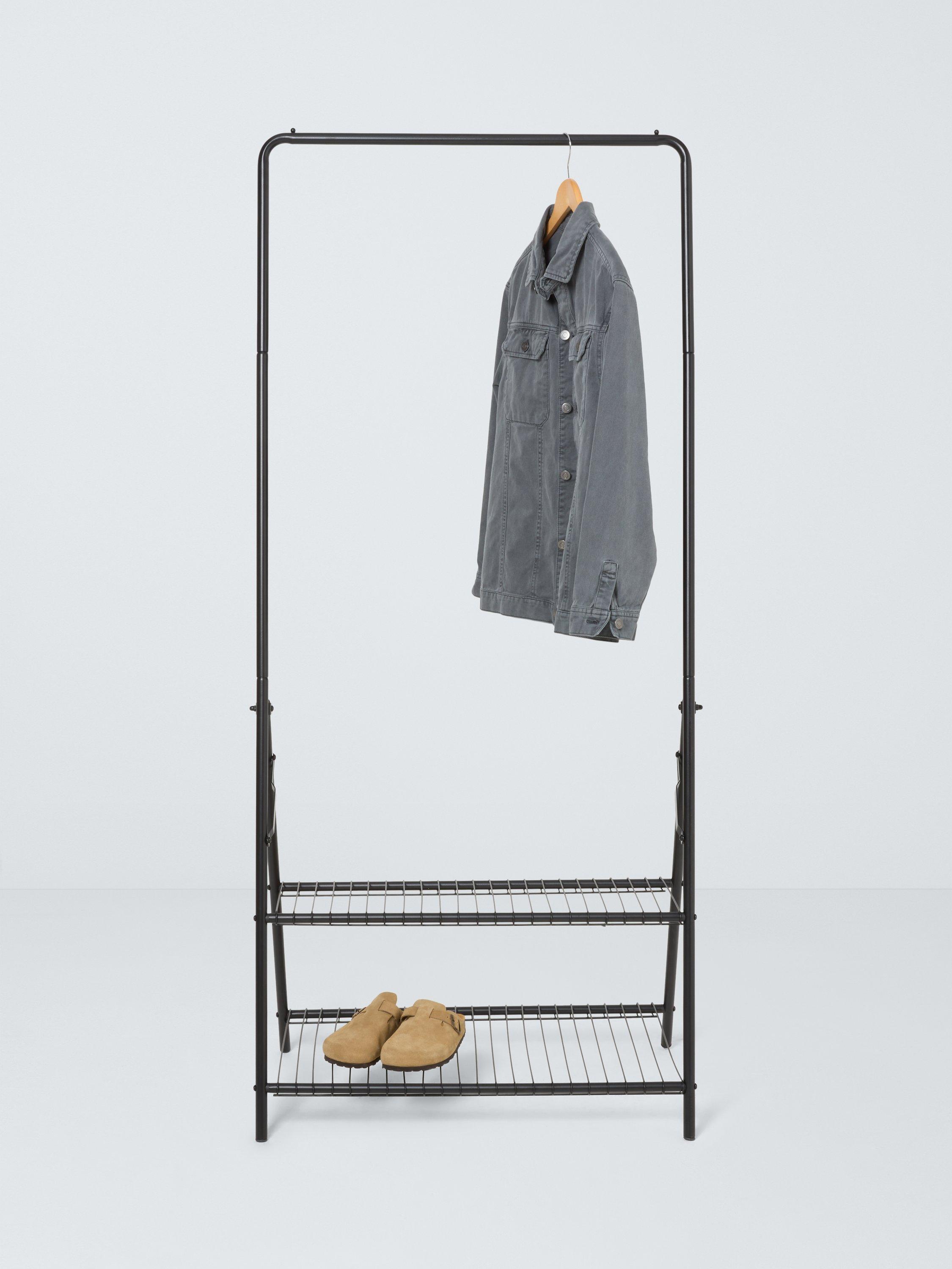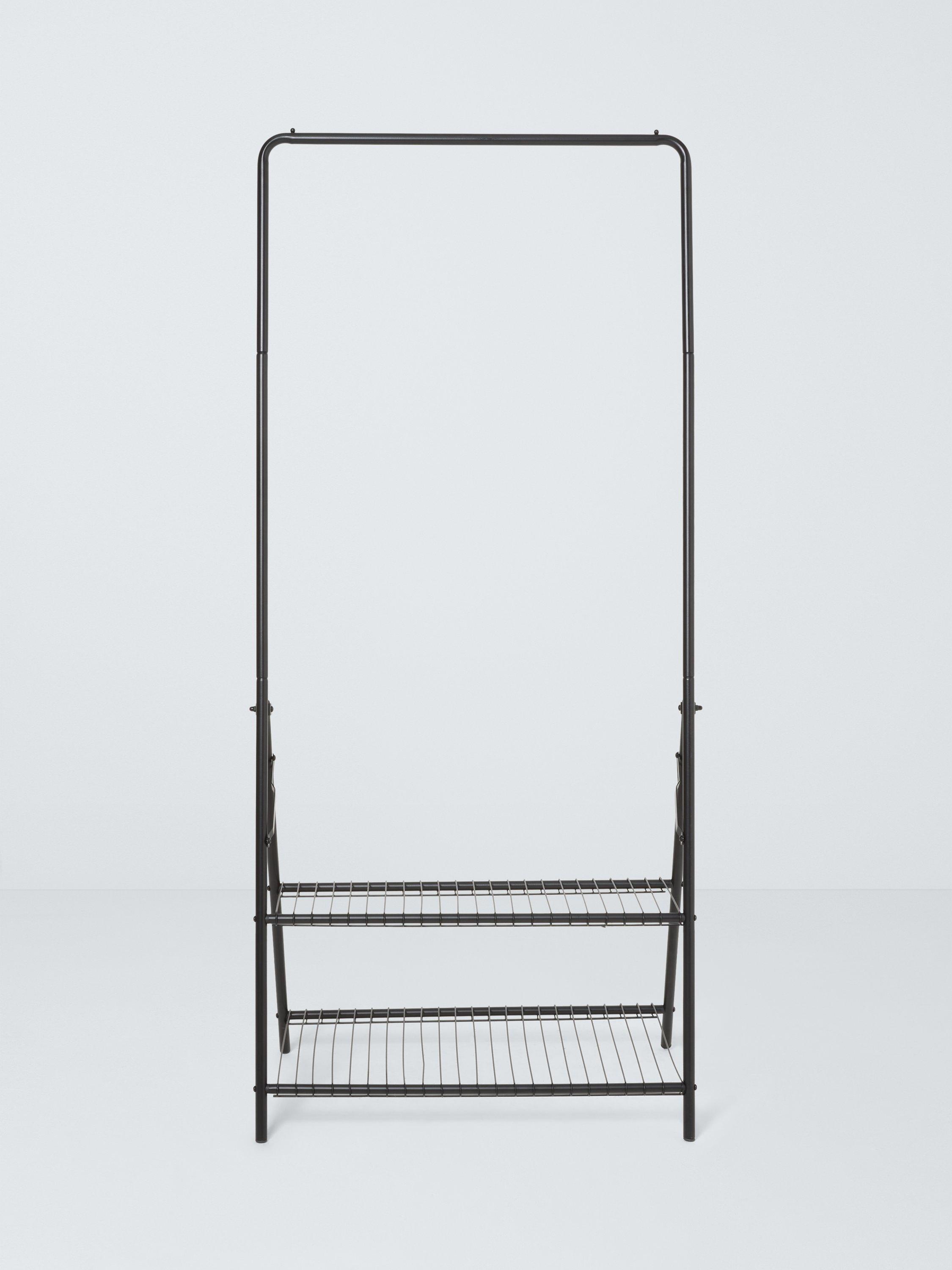 Great for guests, this tubular steel clothes rail has two mesh shelves at the bottom and folds flat when not in use.