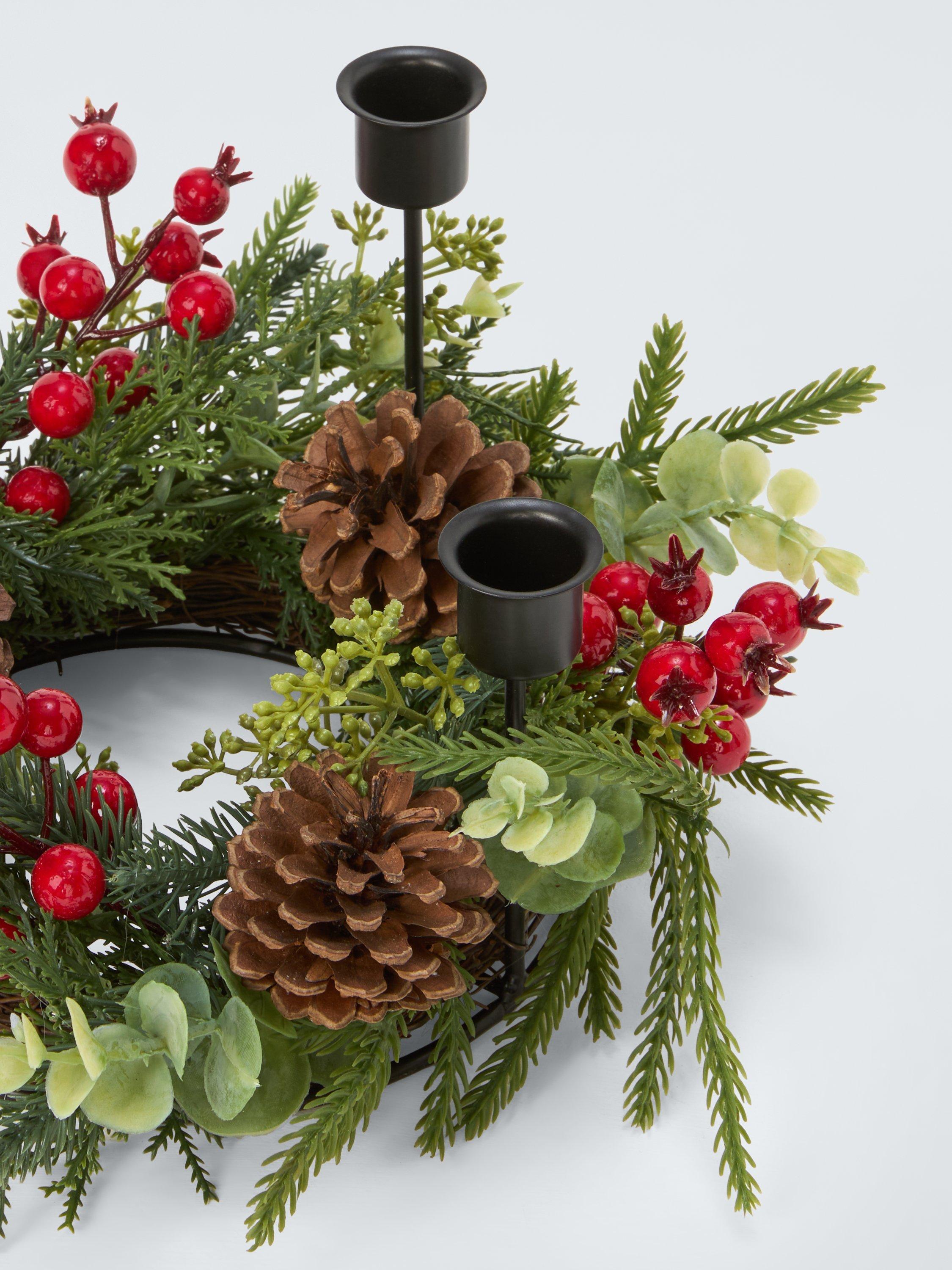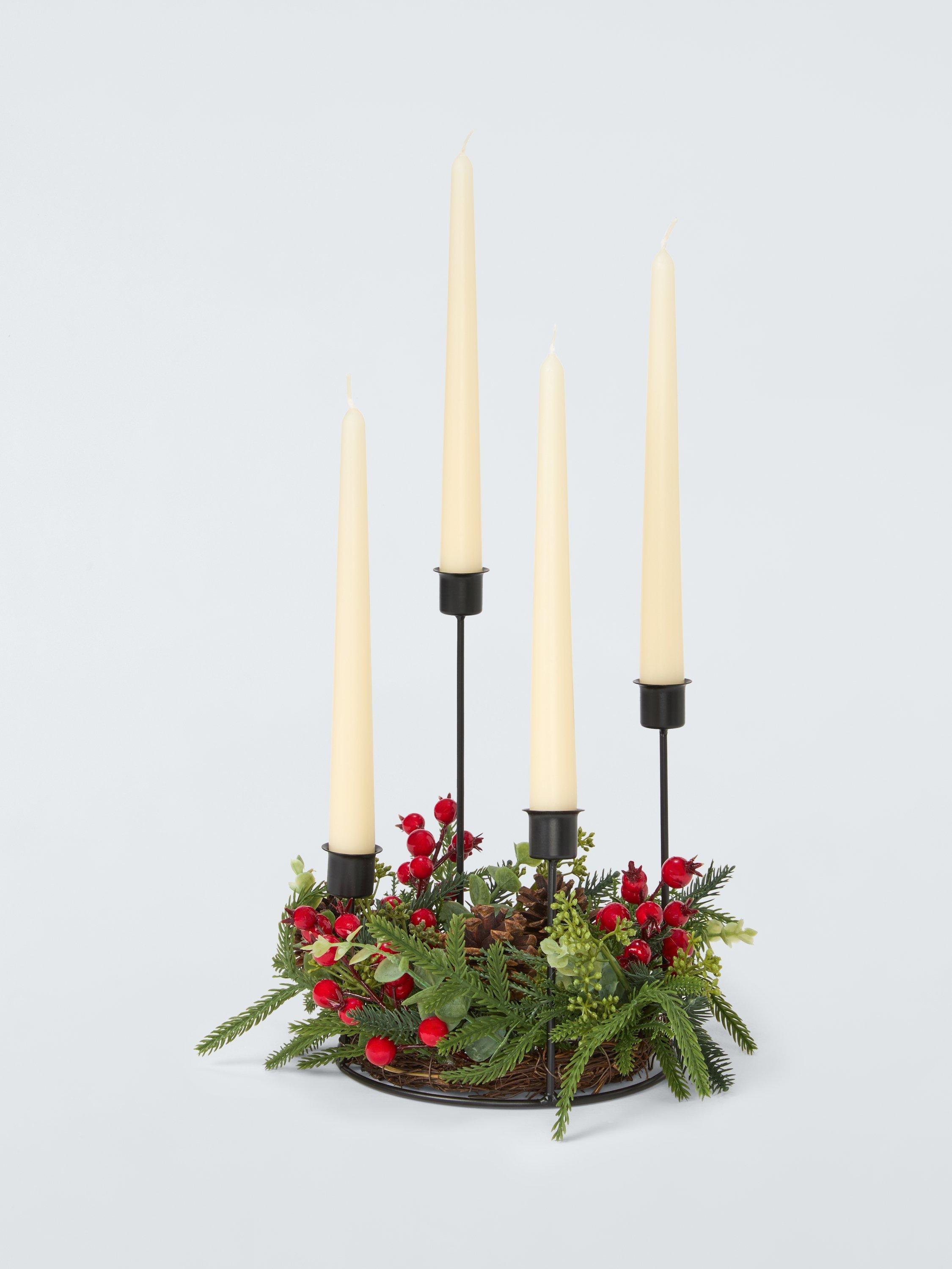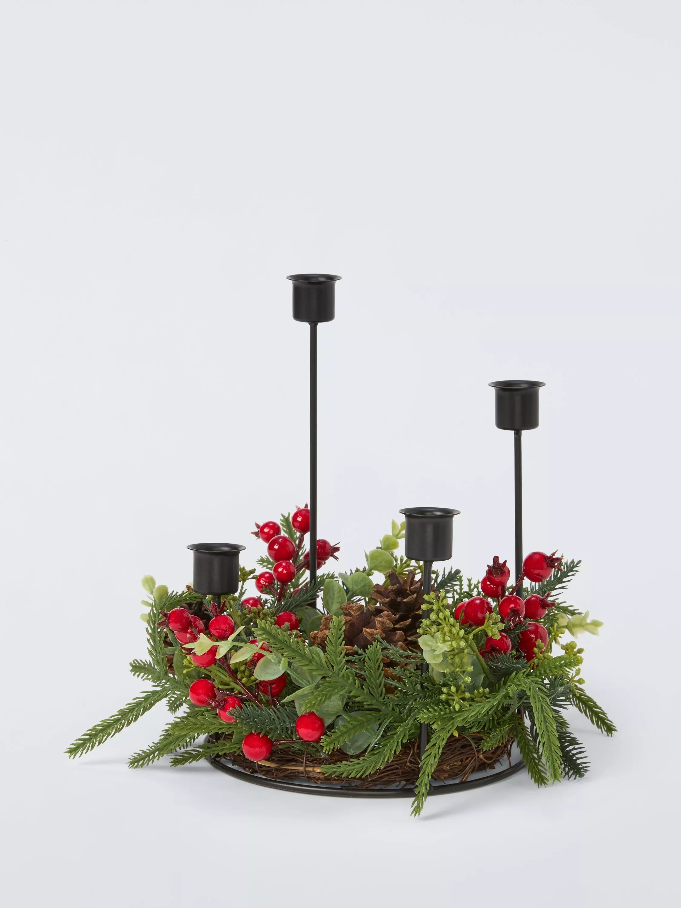 Trimmed with festive foliage, berries and real pine cones, this centrepiece features four dinner candle holders set at a different heights for an attractive winter display.
