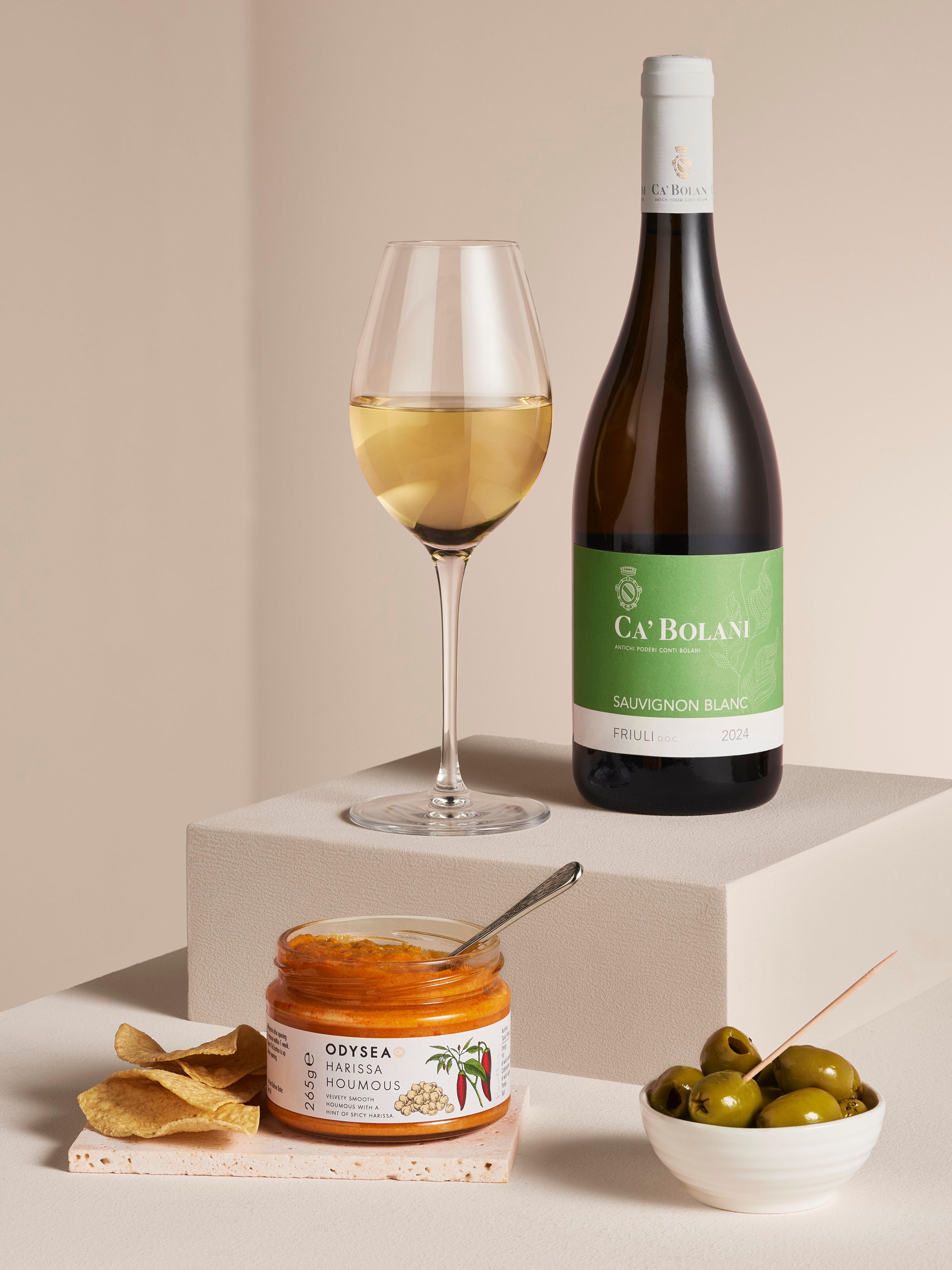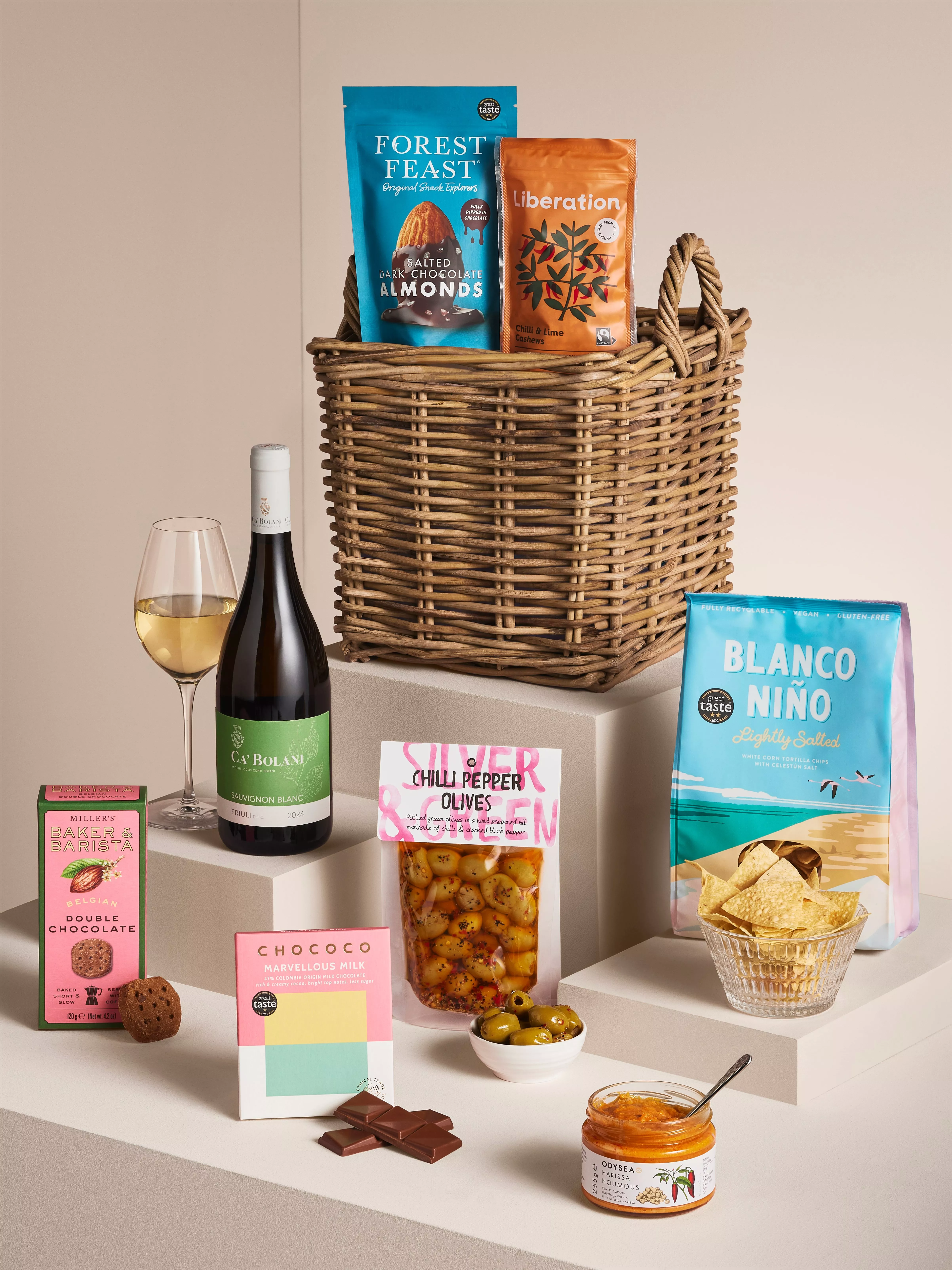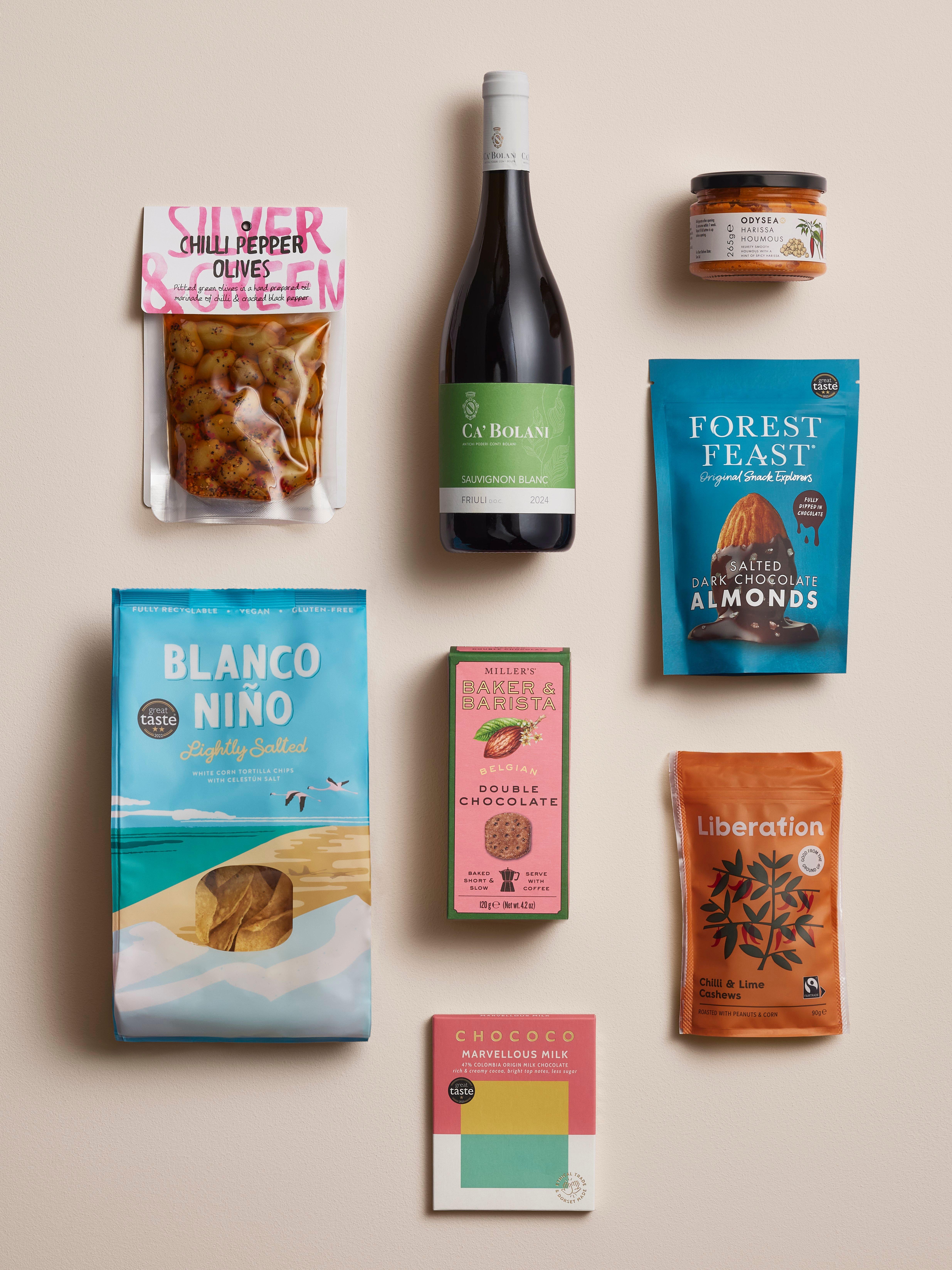 - Ca' Bolani Sauvignon Blanc 75cl Odysea Harissa Houmous 265g Silver & Green Chilli Pepper Olives 220g Blanco Nino Lightly Salted 170g Forest Feast Salted Dark Chocolate Almonds 120g Miller's Baker & Barista Belgian Double Chocolate Biscuits 120g Liberation Chilli & Lime Cashews 90g Chococo Marvellous Milk Tablet Bar 75g