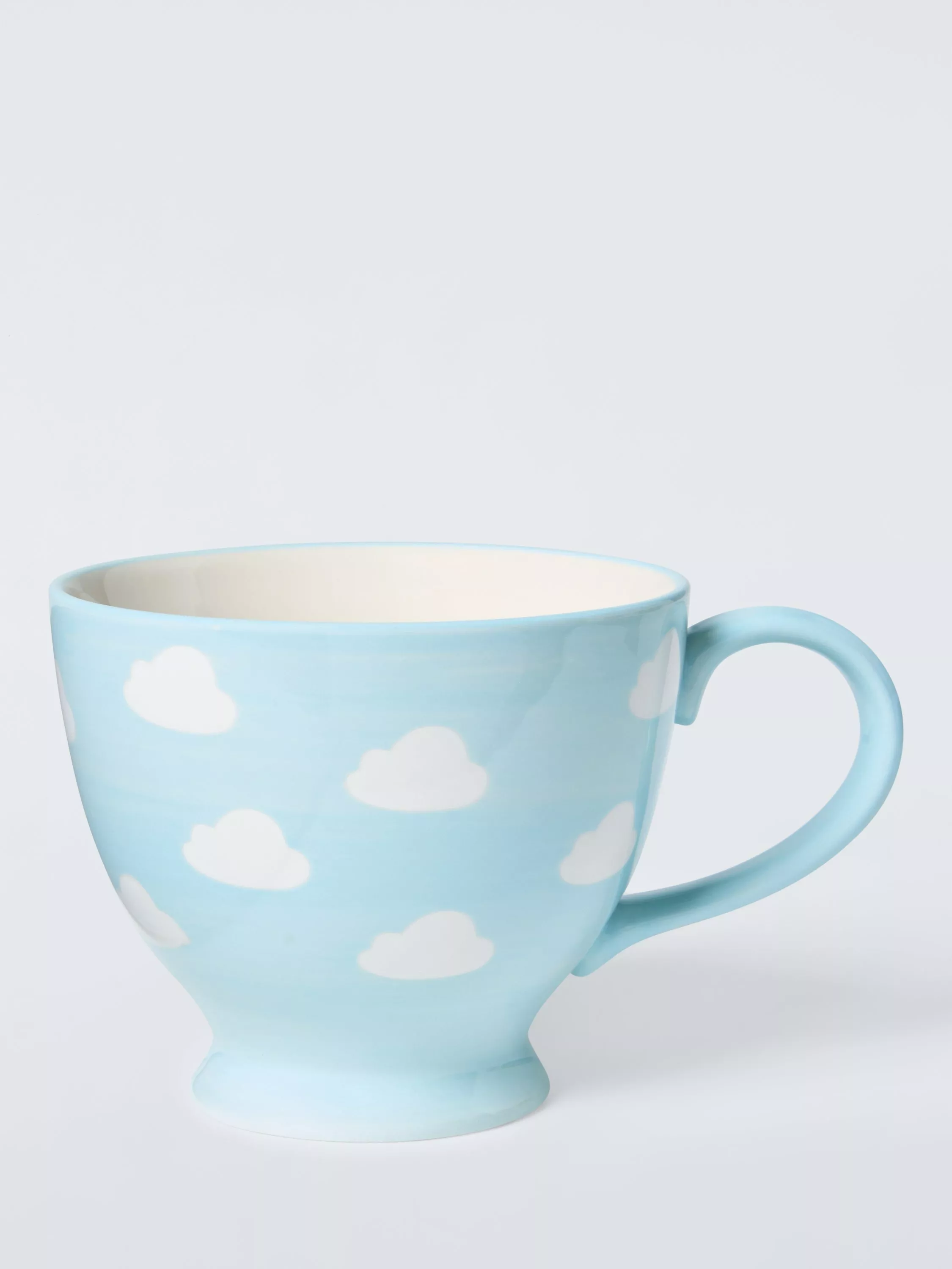 The traditional teacup with a footed design and large, elegant handle gets an update. A generous capacity combines with a hand-painted Blue Sky print. Made of stoneware, it's dishwasher and microwave safe for everyday use.