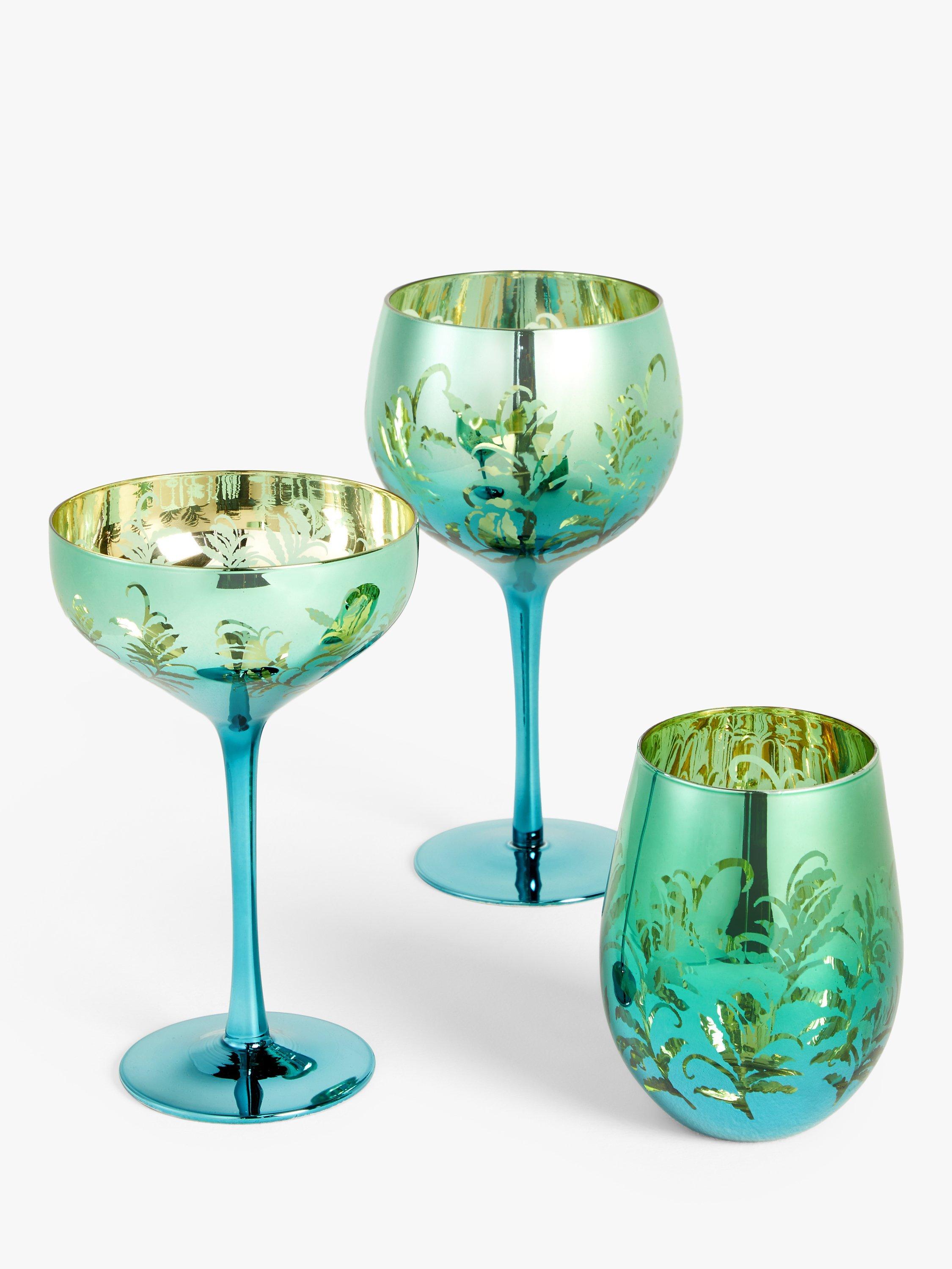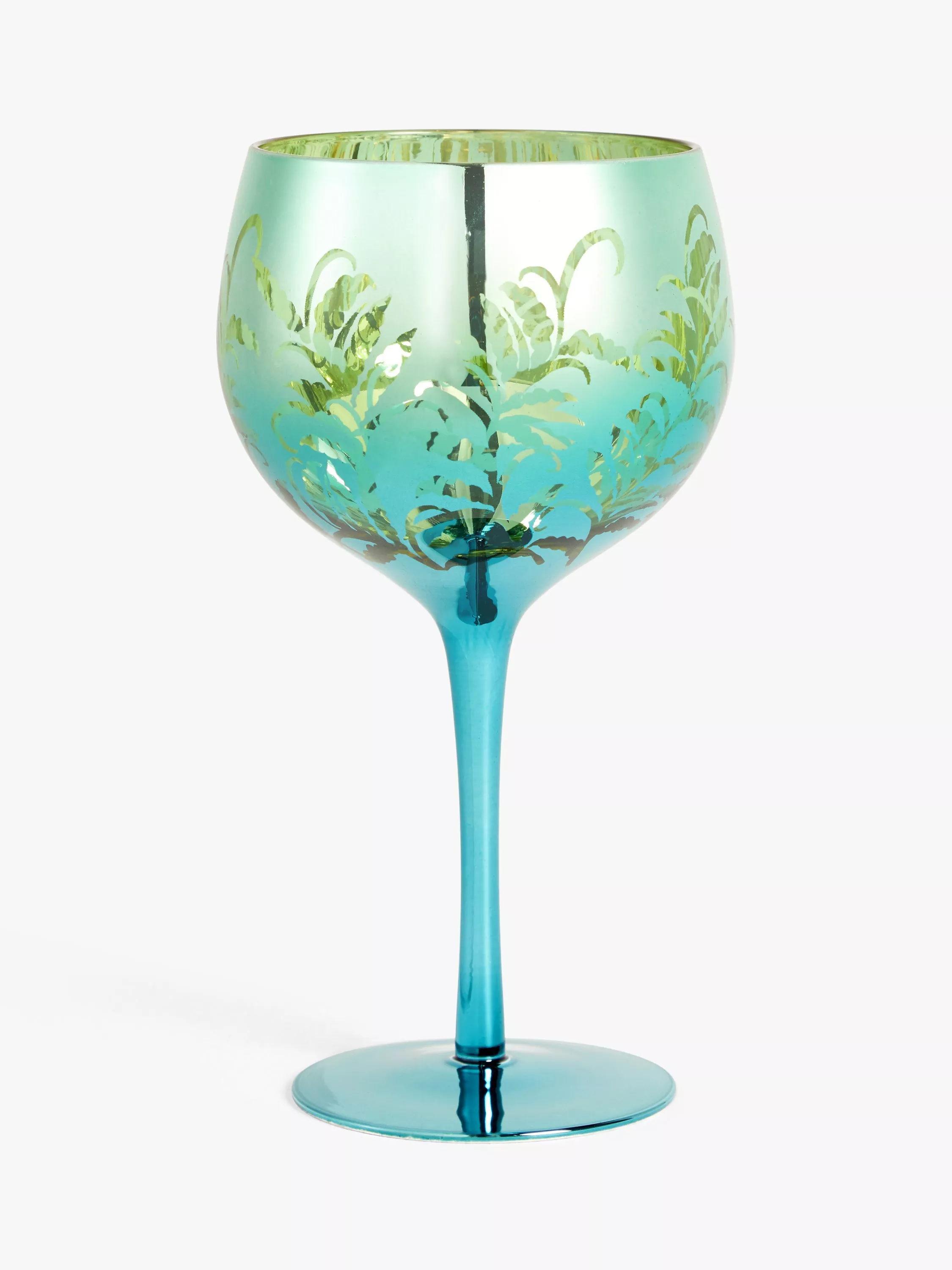 This colourful gin glass has a metallic forest leaf pattern that beautifully catches the light. It's part of an electroplated range that includes matching cocktail glasses, flutes and tumblers.