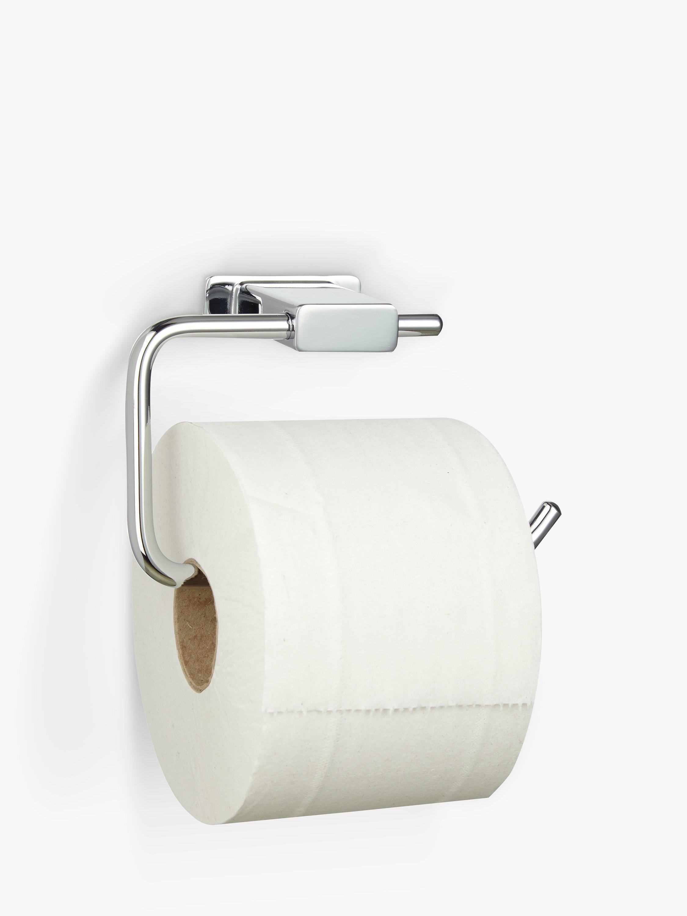 A swing toilet roll holder made from plastic but with a painted finish that gives the illusion of polished steel.