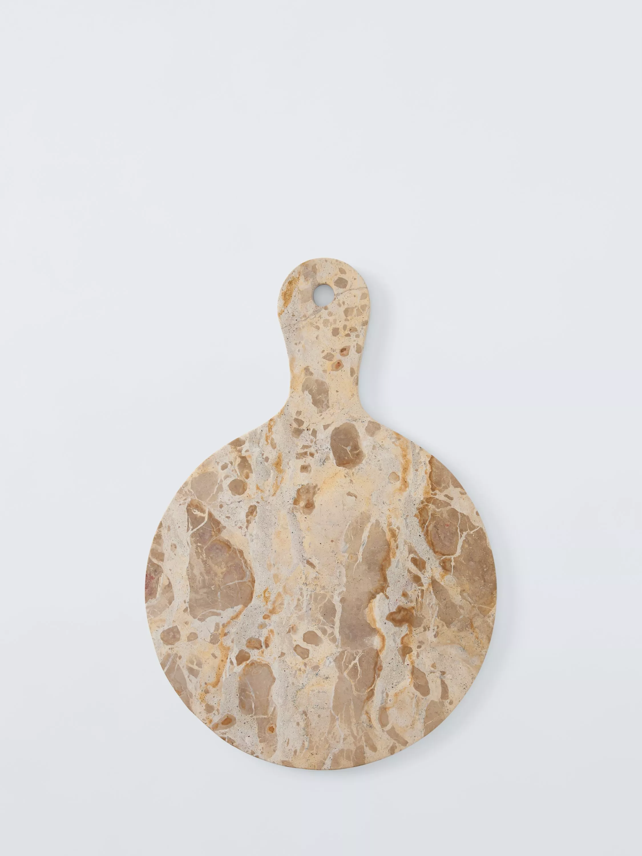 Handmade using traditional techniques, this round marble serving board has a short handle and hanging up hole. The natural patterns and variations of the fossil beige marble make each one unique.