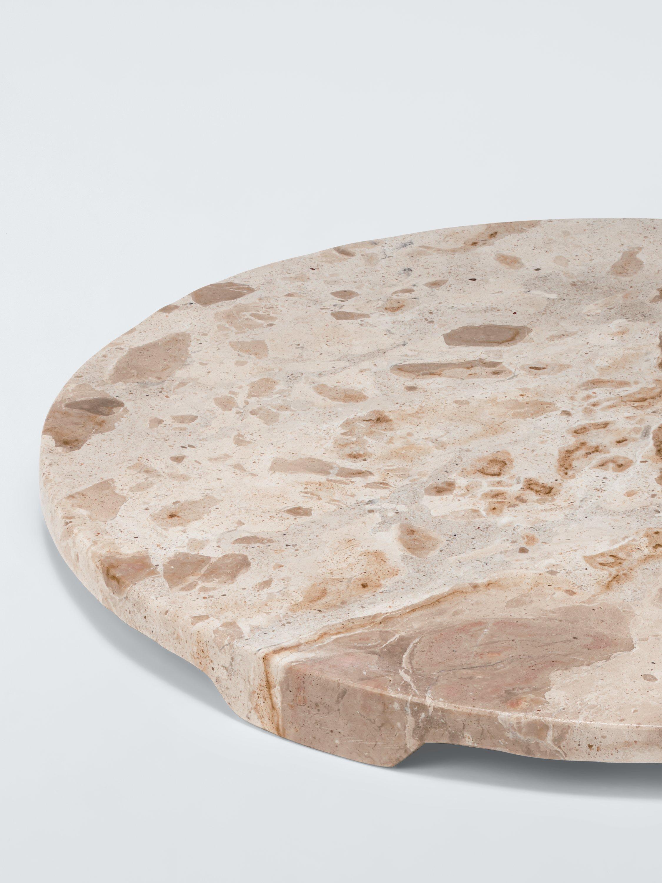 Handmade using traditional techniques, this round marble serving board is subtly footed to raise it slightly off table surfaces. The natural patterns and variations of the fossil beige marble make each one unique.