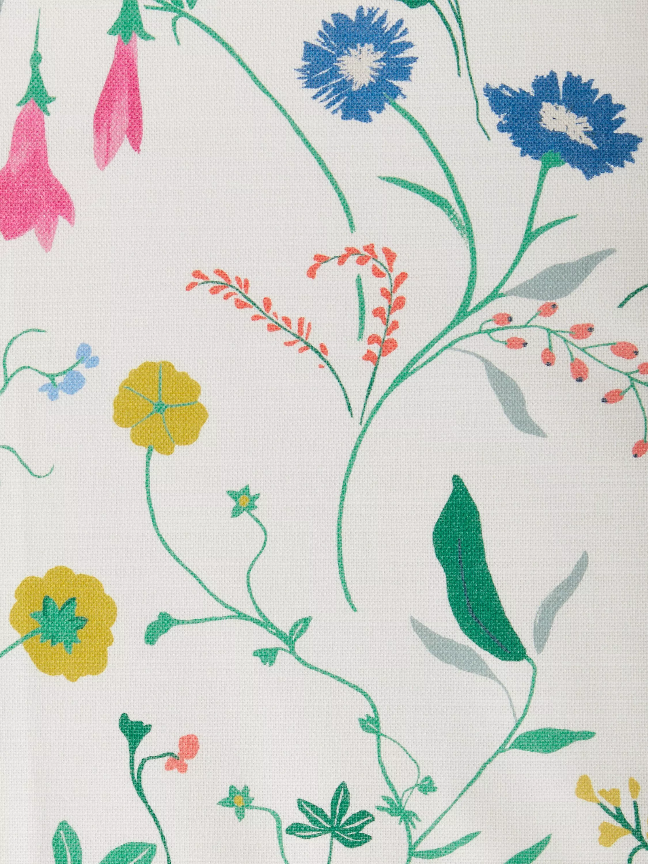 In a riot of colour this fabric features stylised meadow flowers dancing across the plain background.