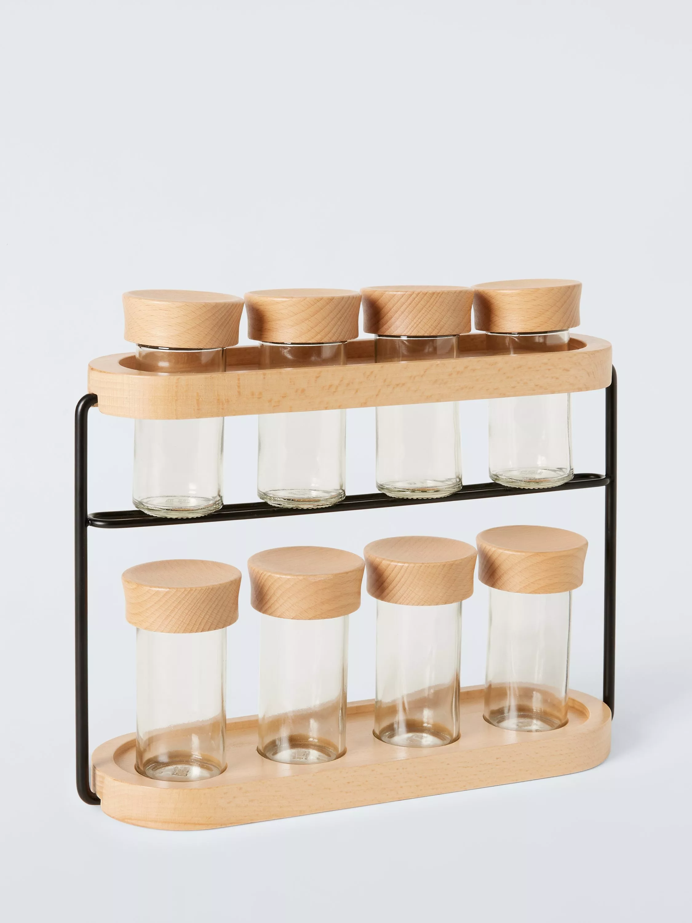 Modern, stylish freestanding two-tier spice rack with eight empty jars. The glass jars have beech wood tops to match the beech wood stand. Ideal for storing herbs and spices so they are organised and within easy reach.
