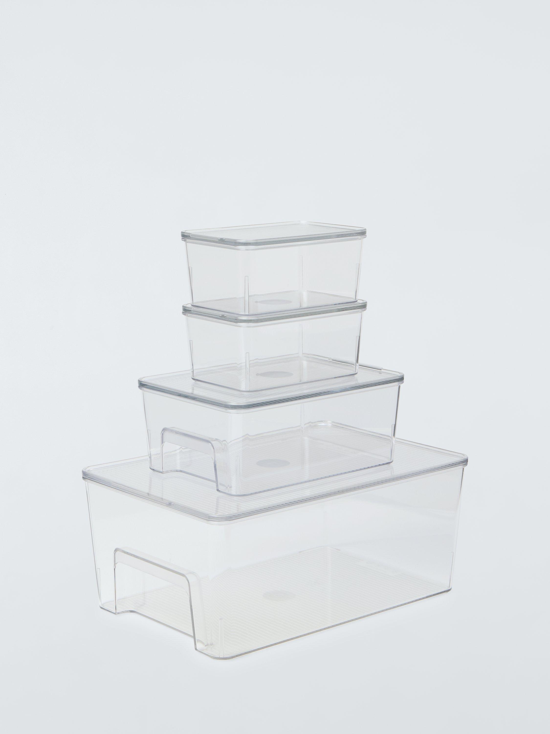 Organise food storage in your fridge or freezer with this set of four containers in key sizes. This set includes two 600ml containers, one 1.6L and one large 5.6L capacity. Made from clear, strong, lightweight and food-safe plastic.