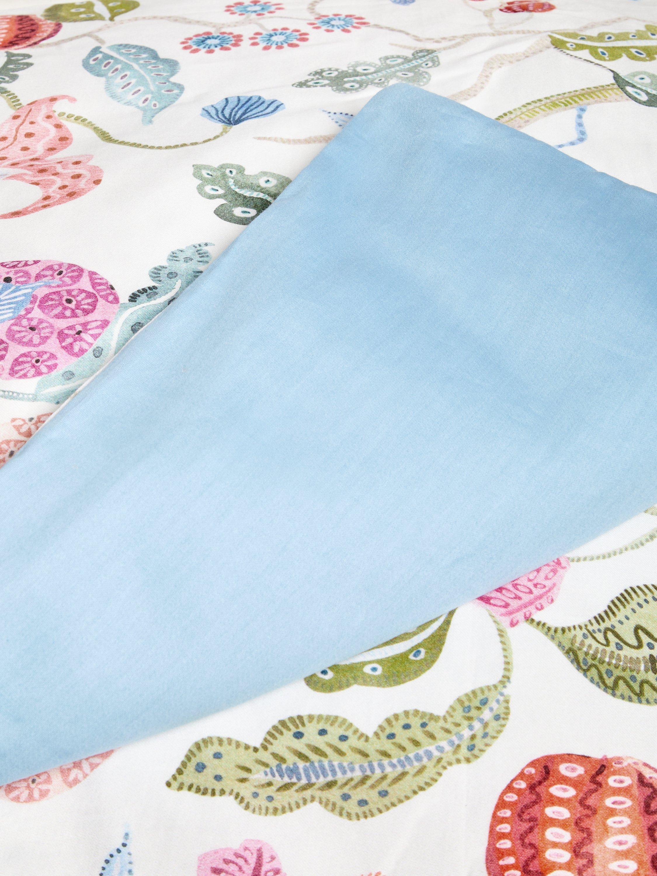A vibrant print of stylised fruits contrasted with a plain blue reverse.