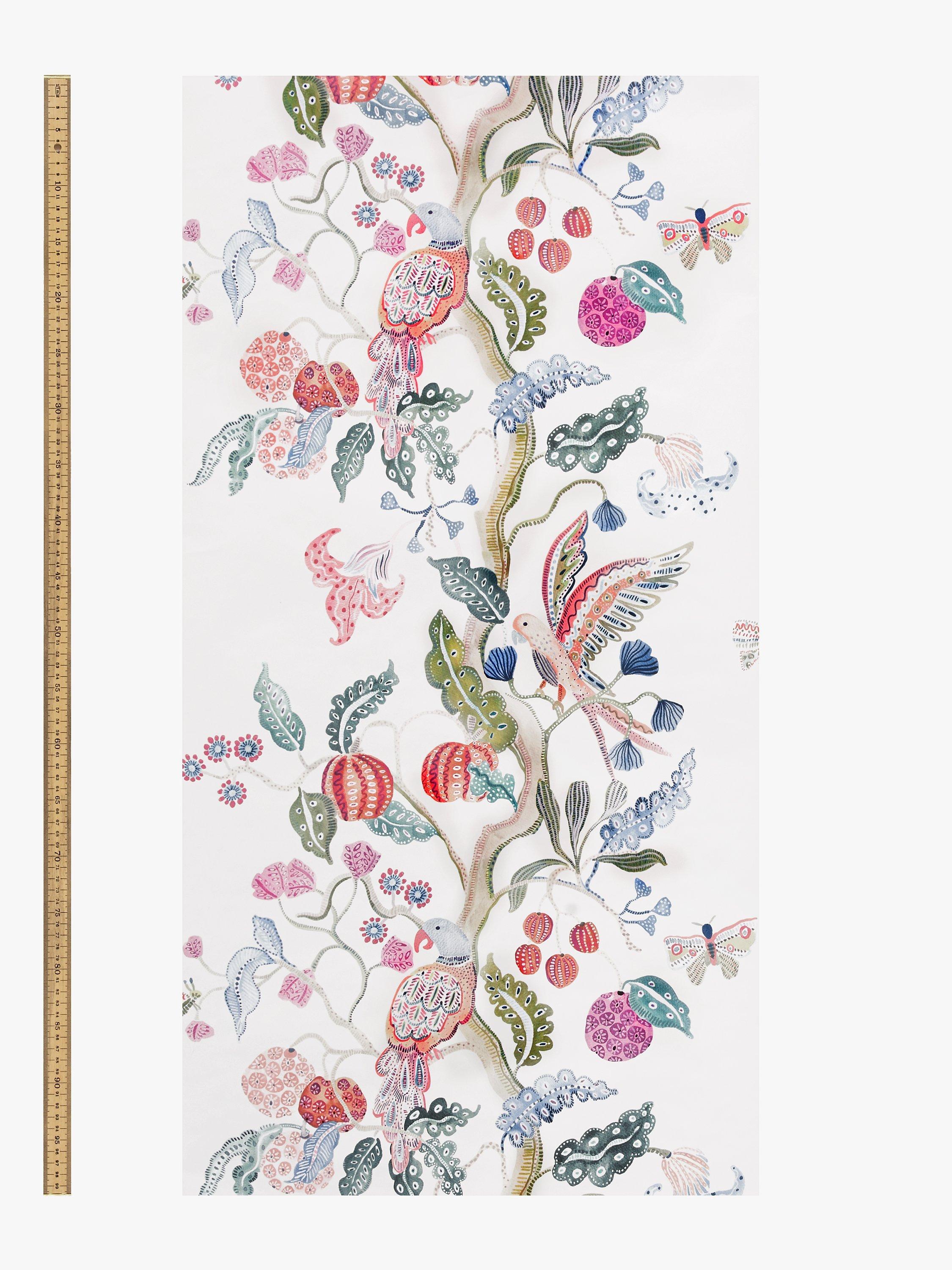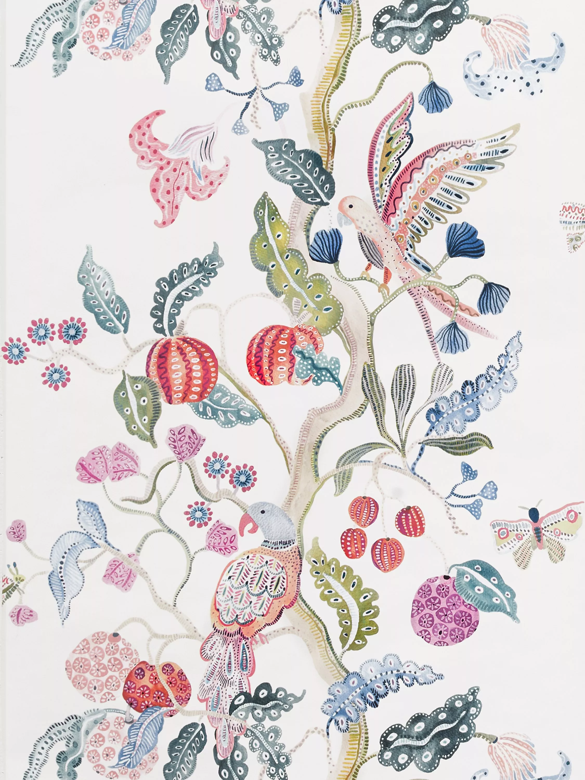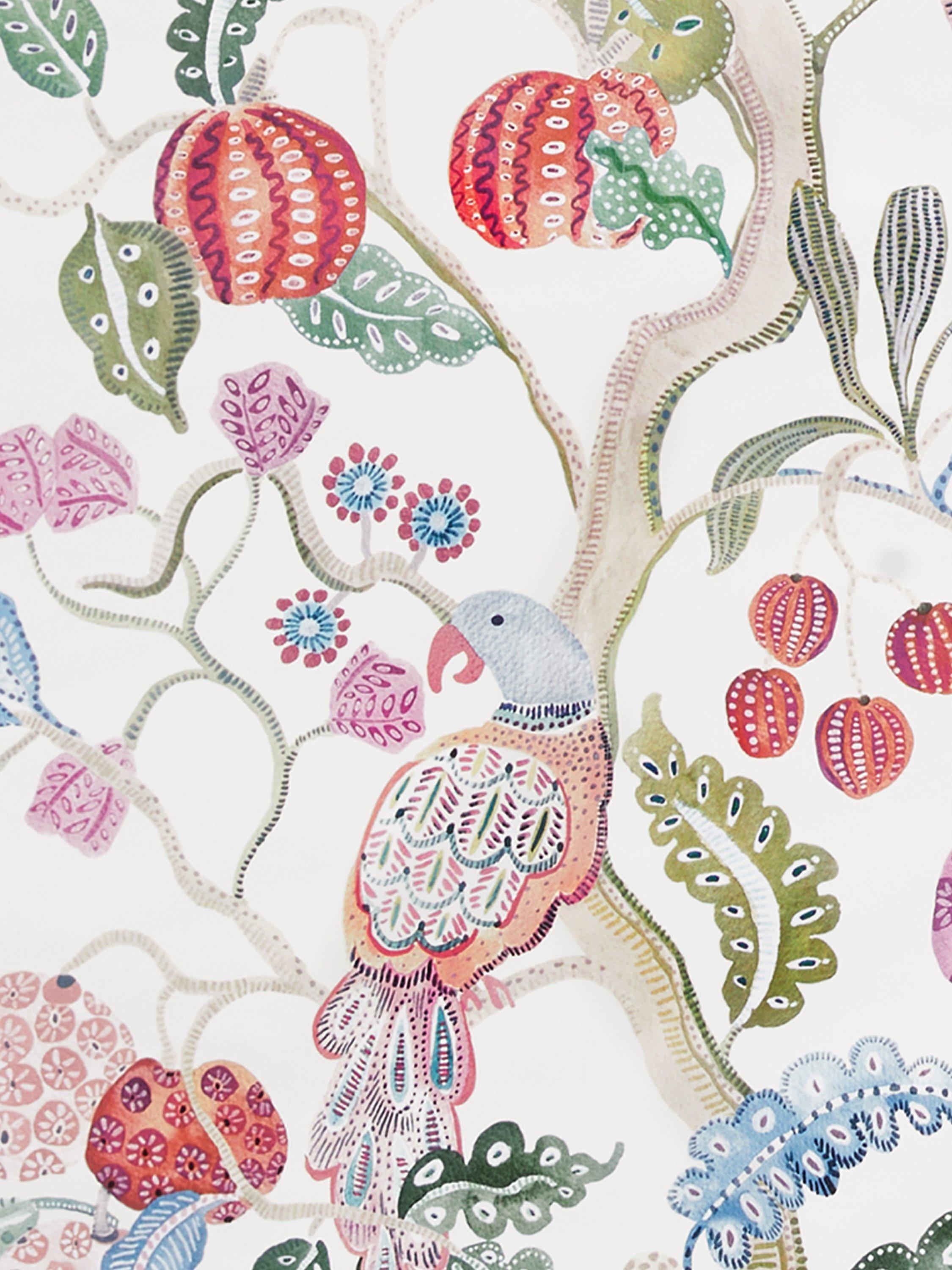 This colourful design was inspired by tropical fruits, flowers and birds from the African jungle. It was hand-painted using watercolour inks and has a lively, tropical colour palette.