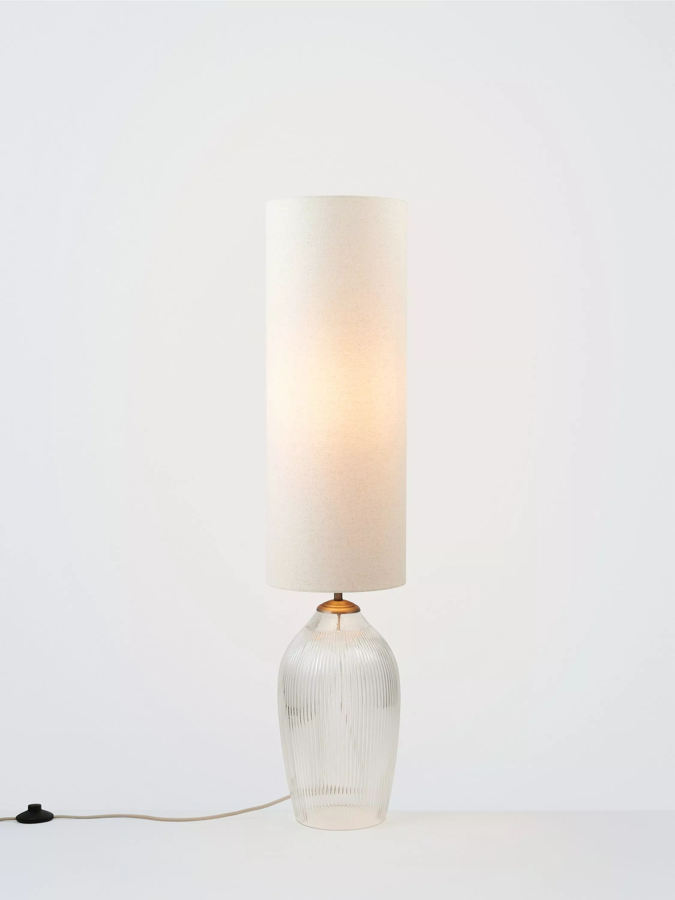 This ribbed glass floor lamp sets a relaxed tone in a modern living room. The textured sculptural base, topped with a tall natural linen-effect shade, gives a warm ambient glow. Finished with plated pewter metalwork and a braided fabric cable.