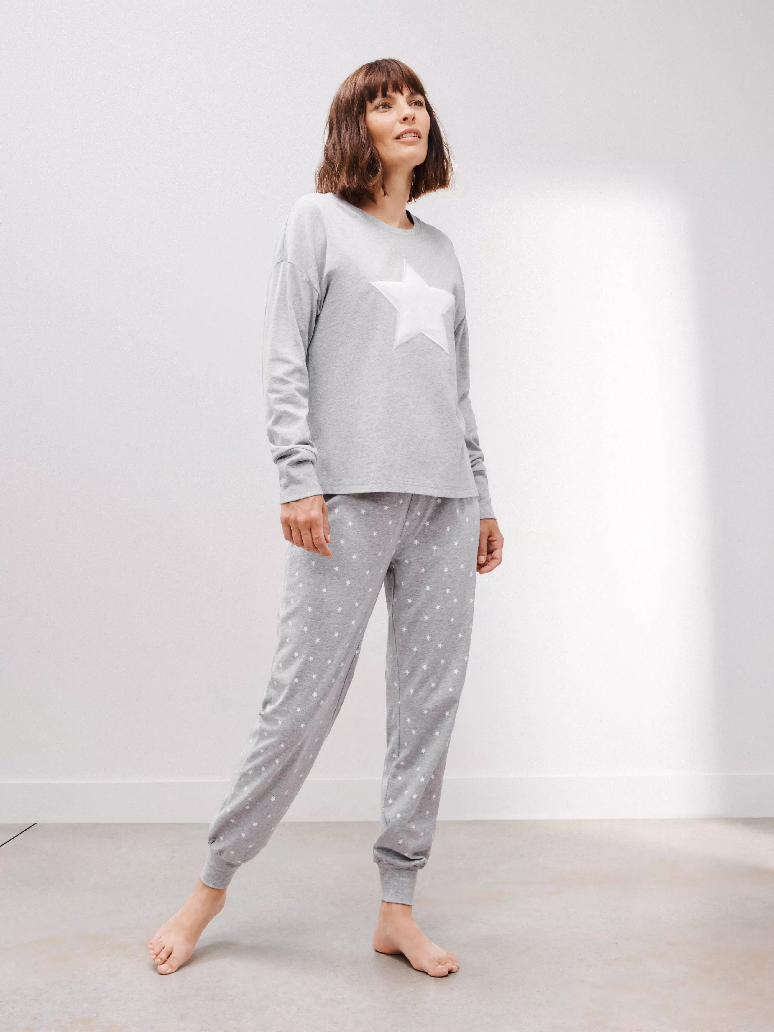 Our Furry Star pyjamas are made for movie nights and midnight feasts as well as bedtime. Made from pure cotton with a big furry star on the top the soft fabric encourages snuggling, and the elasticated cuffs at the wrists and ankles add to the loungewear look. The top is also cut slightly longer at the back with small slits at the side hems so you can move freely.