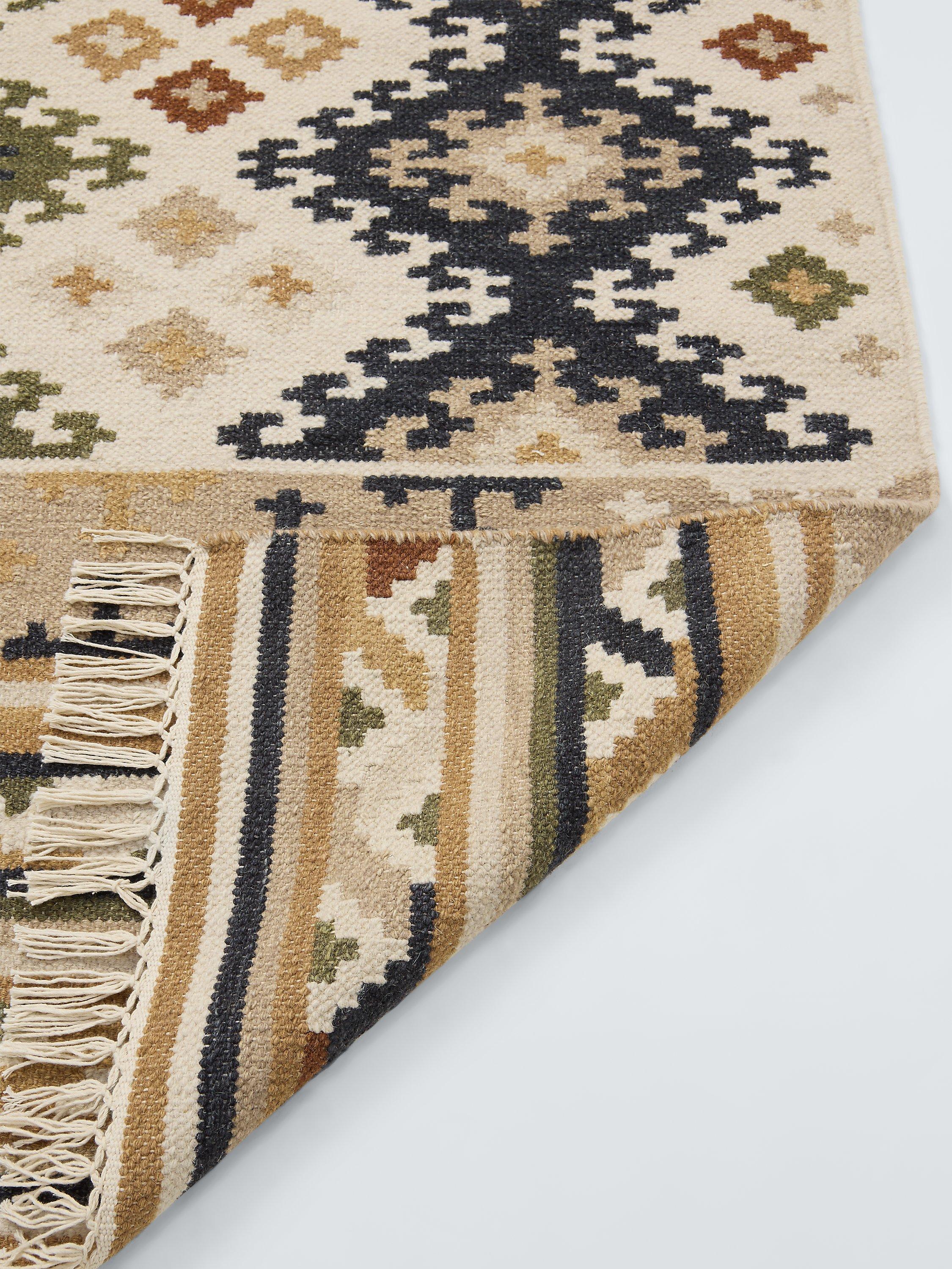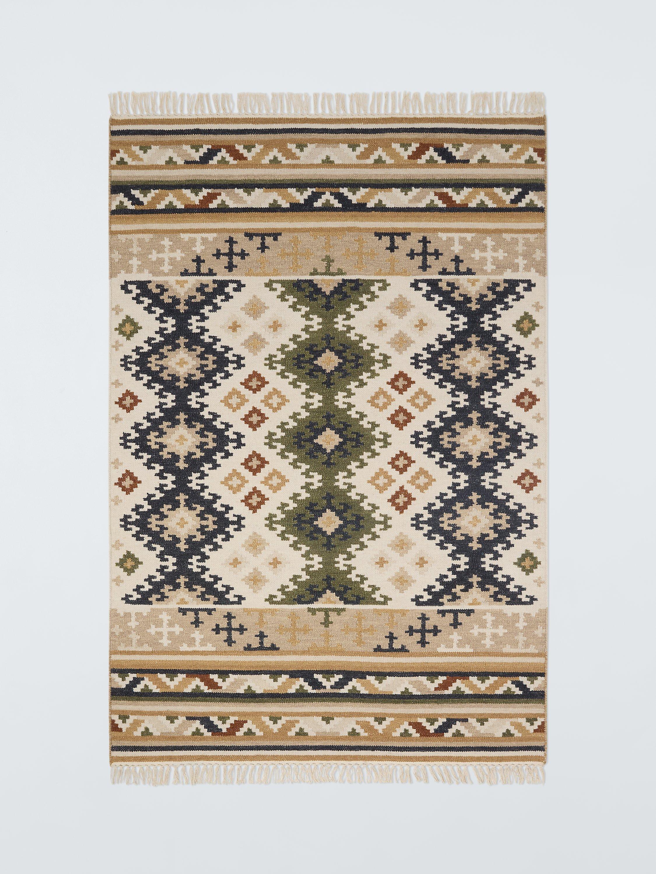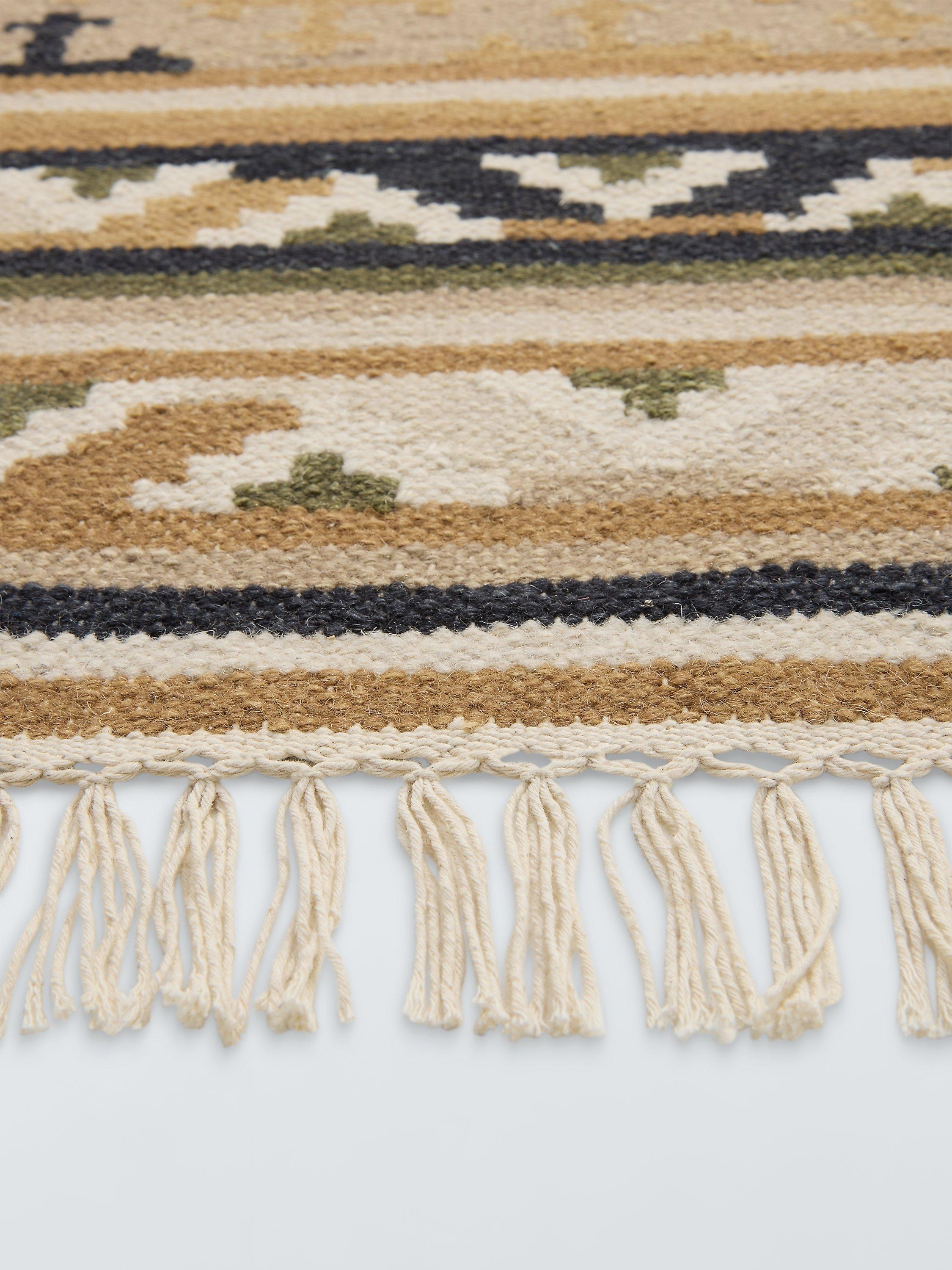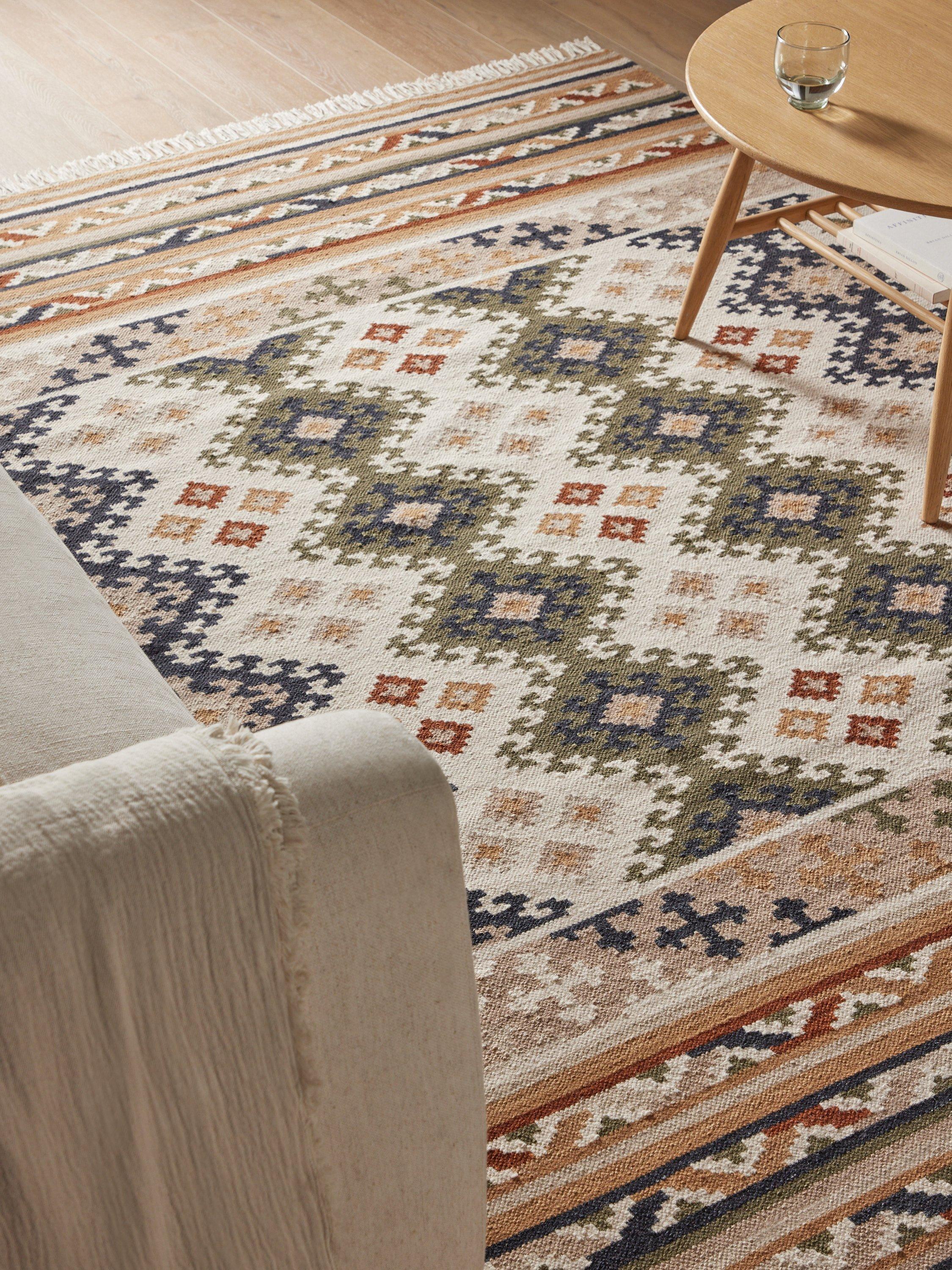 With a geometric pattern inspired by centuries of traditional rug design, this vibrant floor covering is made from a soft wool-cotton blend and comes with relaxed tassels at either end.
